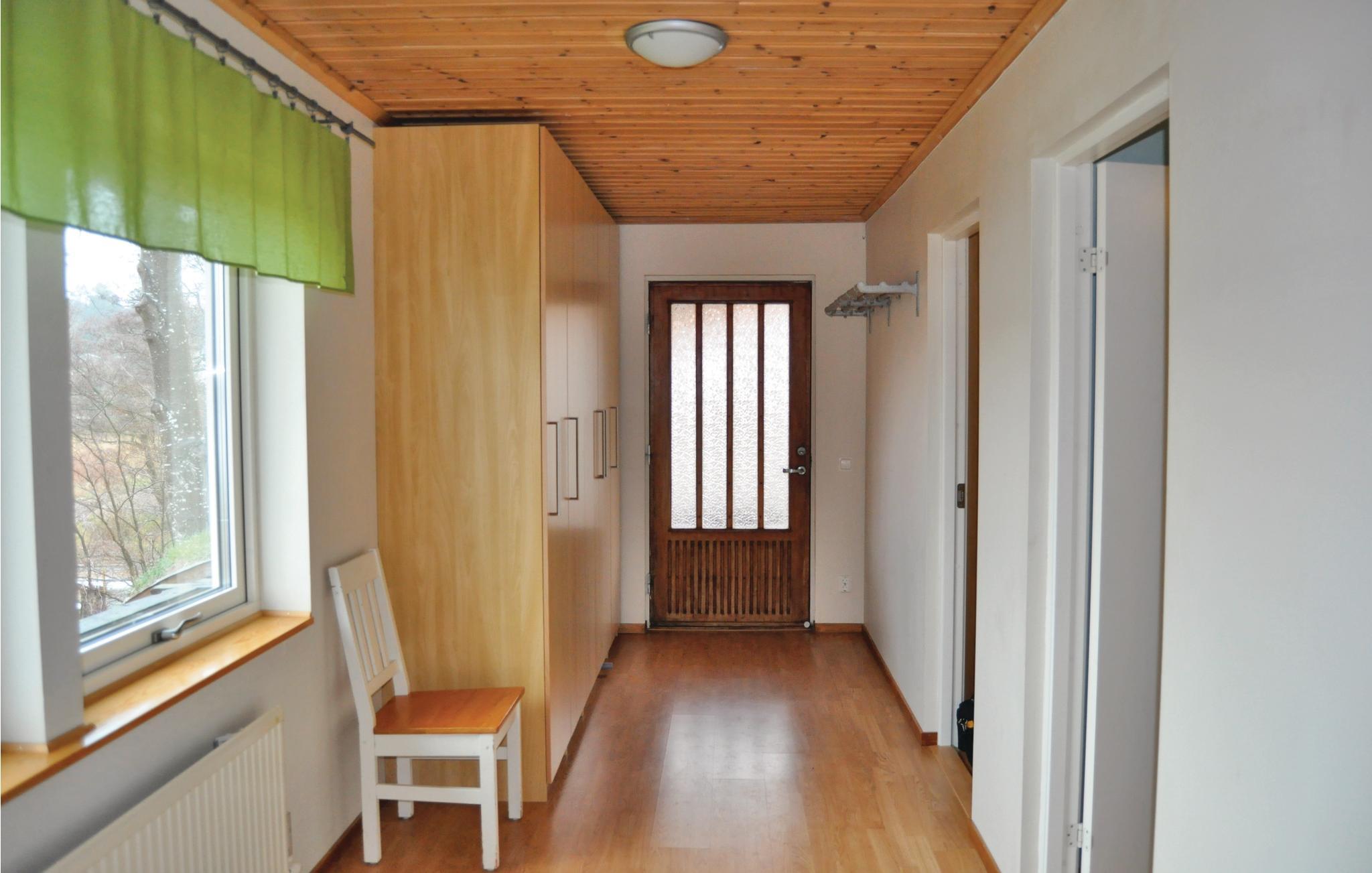 Hovedindgangen til huset er en trappe op, mens der i husets souterrain er ekstra soveværelse, badeværelse og sauna med indgang fra stueplan. Det store klippeparti bag huset giver naturgrund og hus en smuk indramning (men kan også give meget vand ved kraftig nedbør).