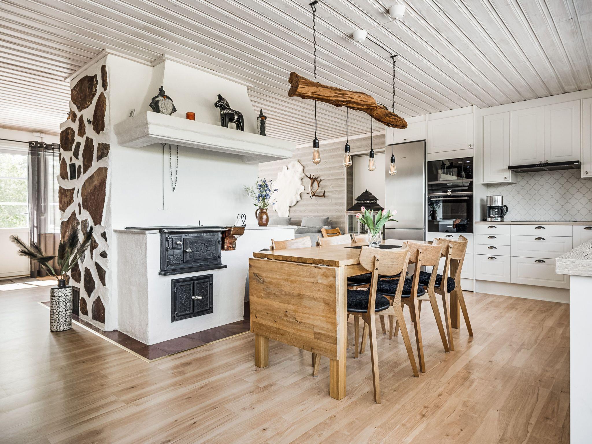 "Kringelfjorden Nävern", 4-room house 109 m2. Cosy and wooden furniture furnishings: living room with open-hearth fireplace and satellite TV. Exit to the terrace. 2 rooms, each room with 1 double bed. 1 room with 1 sofabed. Open kitchen (4 hot plates, oven, dishwasher, microwave, freezer, electric coffee machine) with dining table. Shower/WC, sep. WC, Sauna. Electric heating. Small terrace, patio. Terrace furniture. Facilities: washing machine, iron, children's high chair. Internet (WiFi). Please note: non-smoking house. Smoke alarm, fire extinguisher. Freezer approx. 90 l.