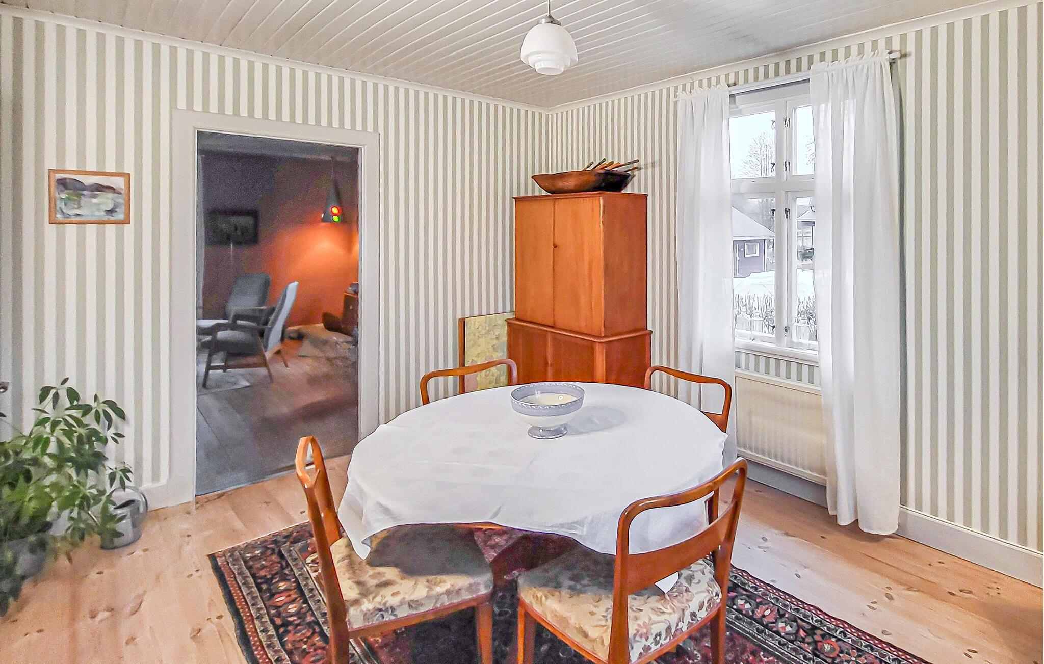 Forkæl jer selv med en pause i dette charmerende feriehus lige ved søen Vänern. jeres sommerhus i Södra Timmervik er ideelt for naturelskere. Omgivet af et idyllisk landskab og med udsigt over Vänern indbyder huset til afslappende dage. Inde i huset finder I stilfulde møbler, der kombinerer svundne tiders charme med moderne komfort. Den hyggelige opholdsstue er det ideelle sted at slappe af efter en dag i naturen. I det praktiske, åbne køkken kan I tilberede lækre måltider til hele familien, som I så kan nyde i spisepladsen. Eller I kan servere festlige middage ved langbordet udenfor i den smukke lade. Nyd de solrige timer i den rummelige have. Lad jeres blik vandre over naturens vidder og tag en dyb indånding. Udforsk det omkringliggende område på lange gå- eller cykelture langs Vänerns bred. Besøg også de nærliggende byer Vänersborg og Trollhättan for kulturelle oplevelser og lokale specialiteter.