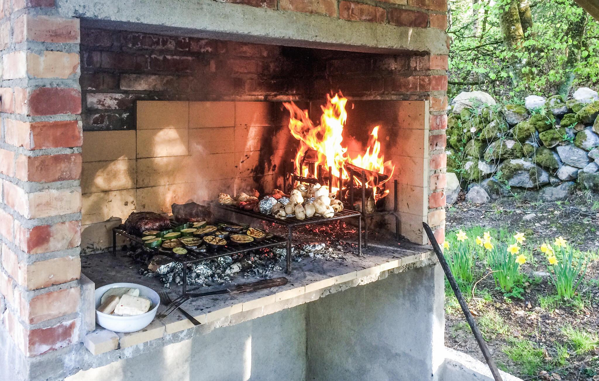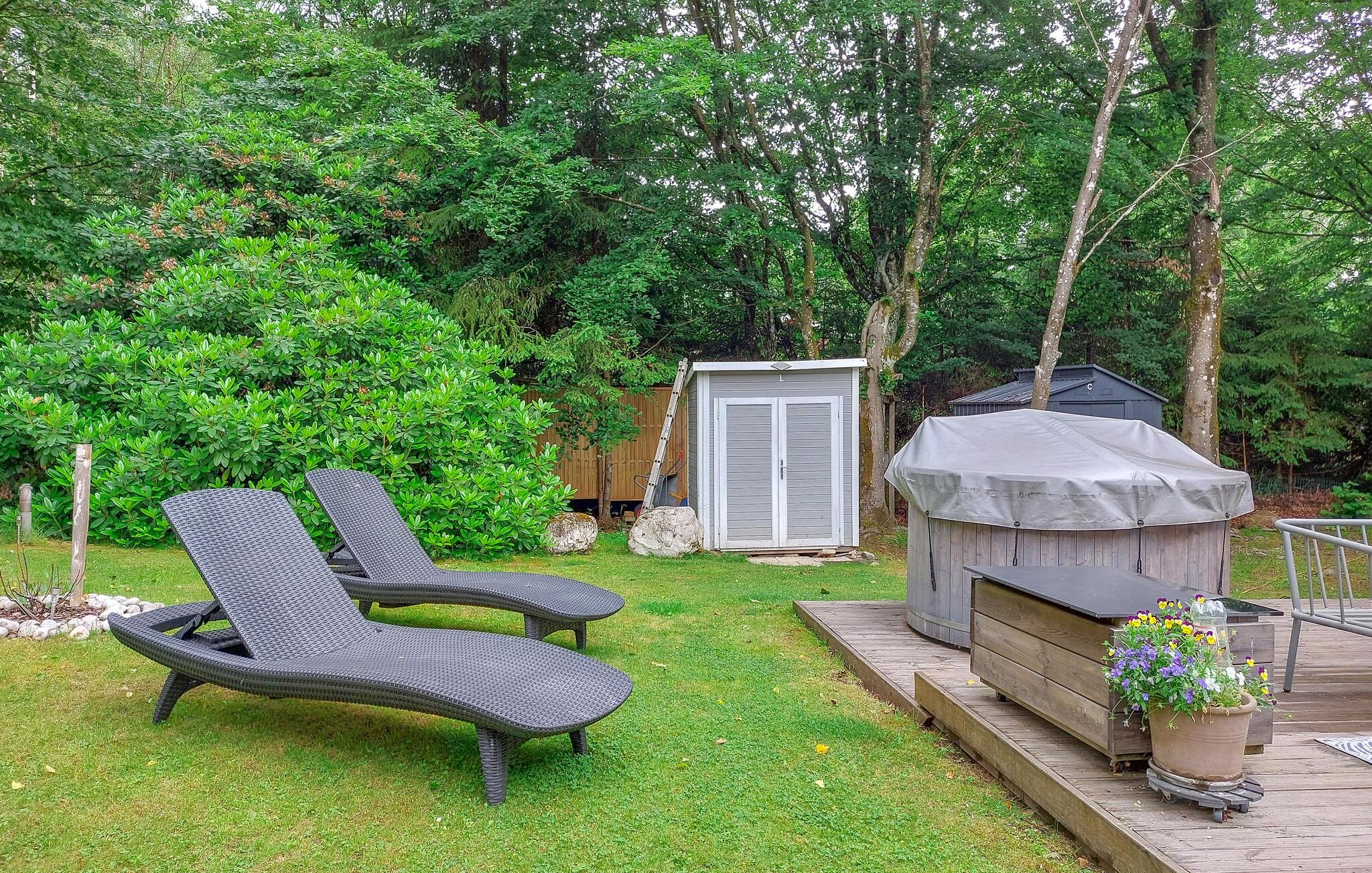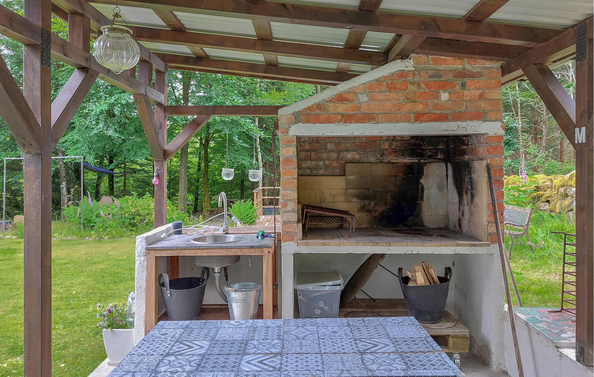 Udenfor finder I en stor have med træer. Server jeres morgenmad på den solrige terrasse og lad børnene udforske naturen legende, mens I forbereder stemningsfulde aftener ved den store udendørs grill eller forkæler jer selv med afslappende stunder i vildmarksbadet.