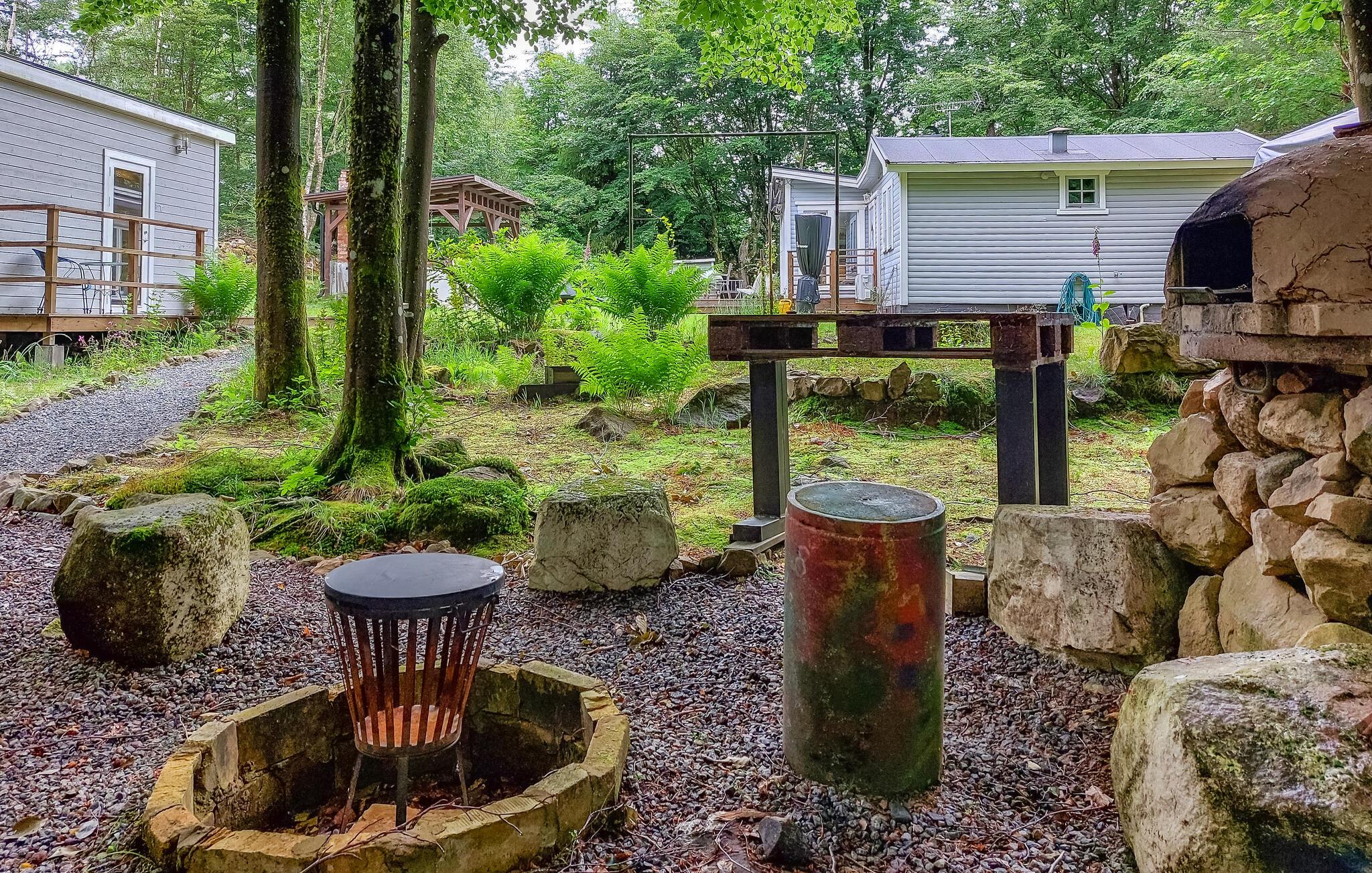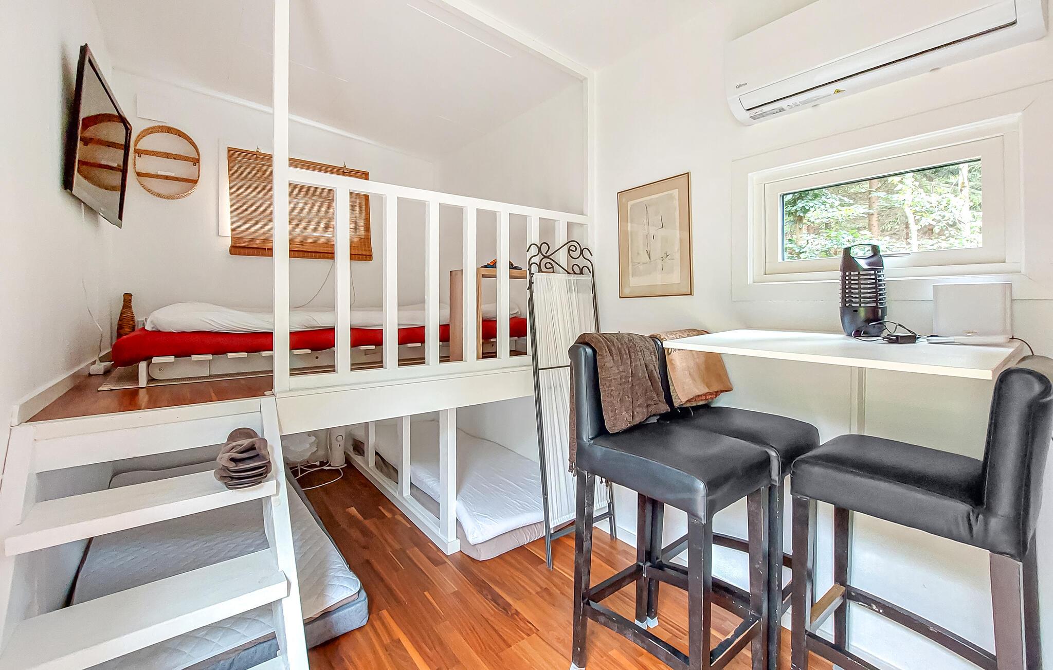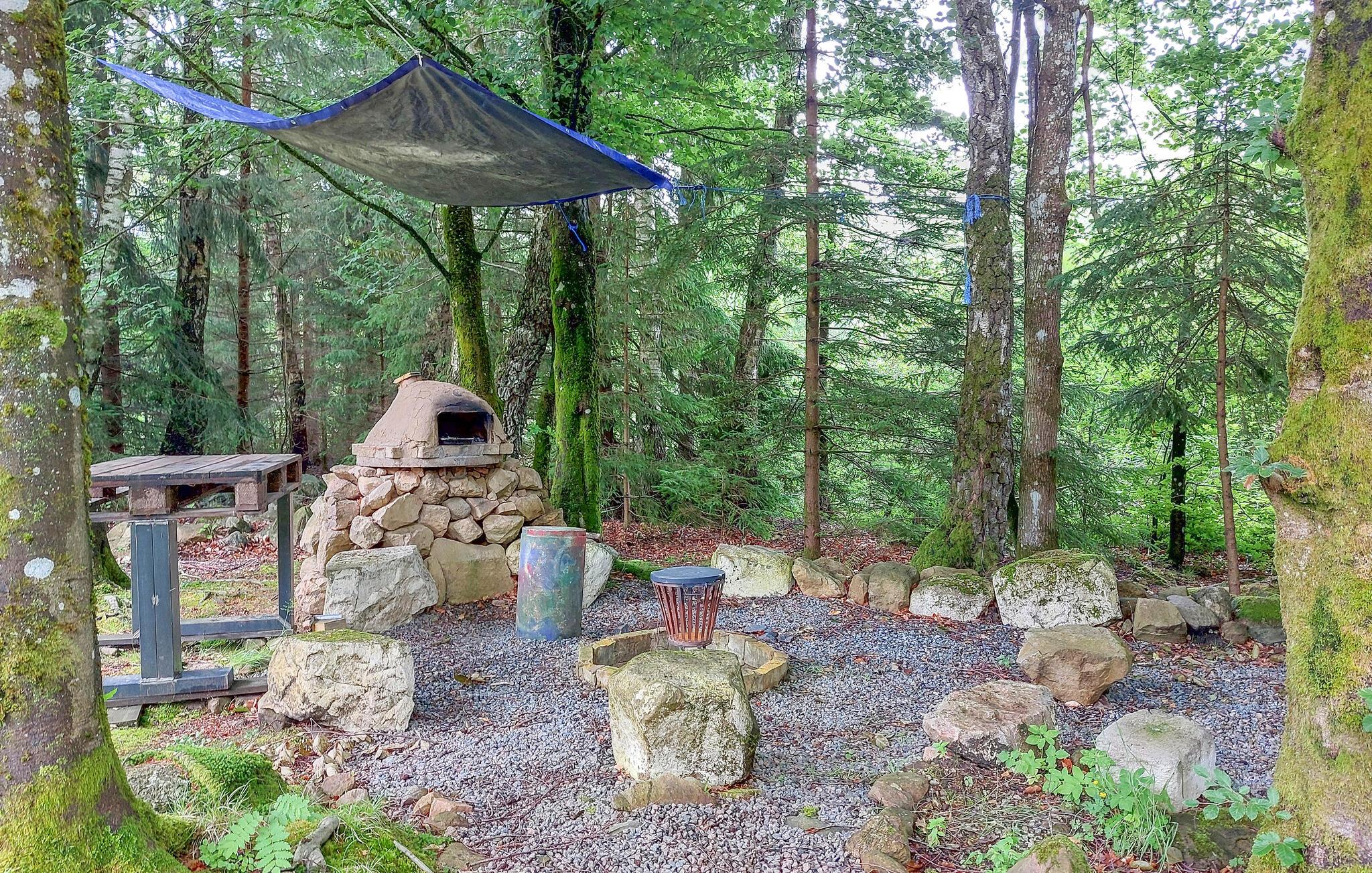 Udenfor finder I en stor have med træer. Server jeres morgenmad på den solrige terrasse og lad børnene udforske naturen legende, mens I forbereder stemningsfulde aftener ved den store udendørs grill eller forkæler jer selv med afslappende stunder i vildmarksbadet.