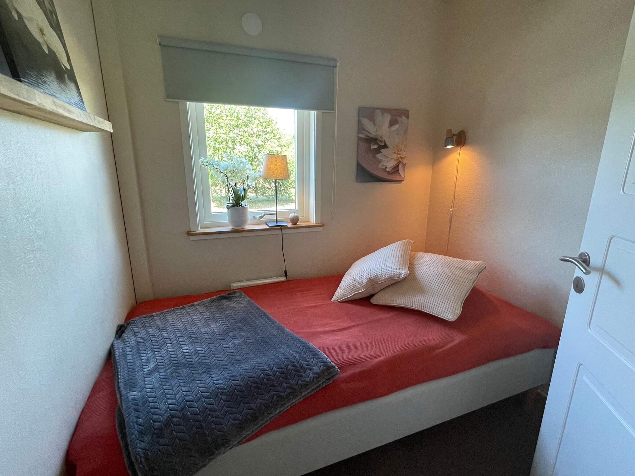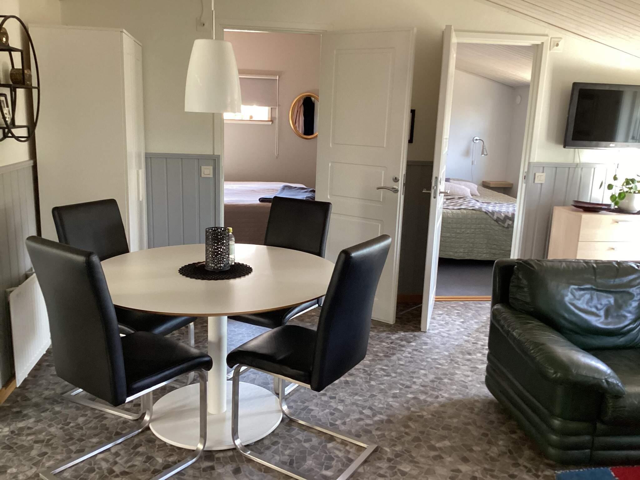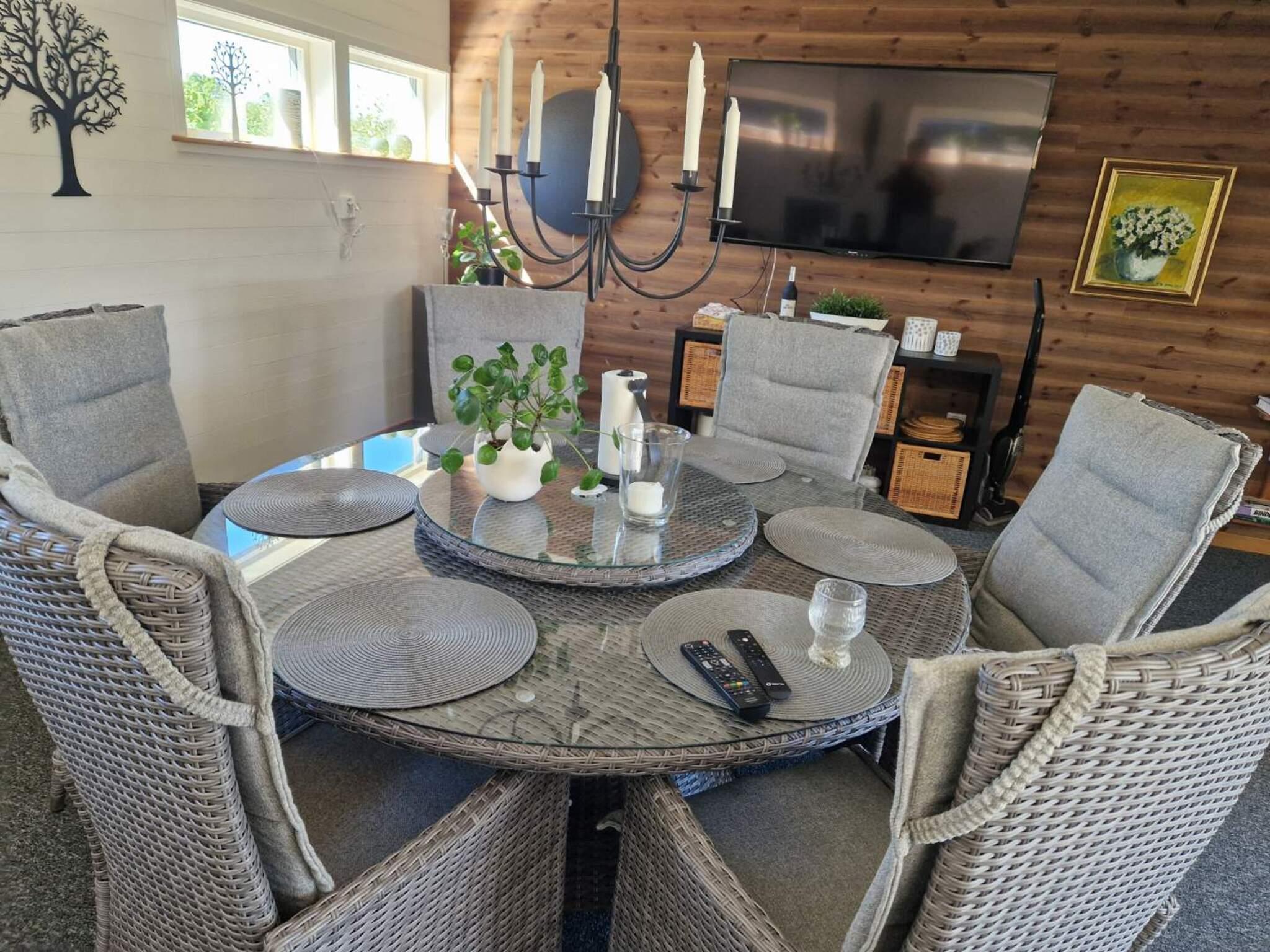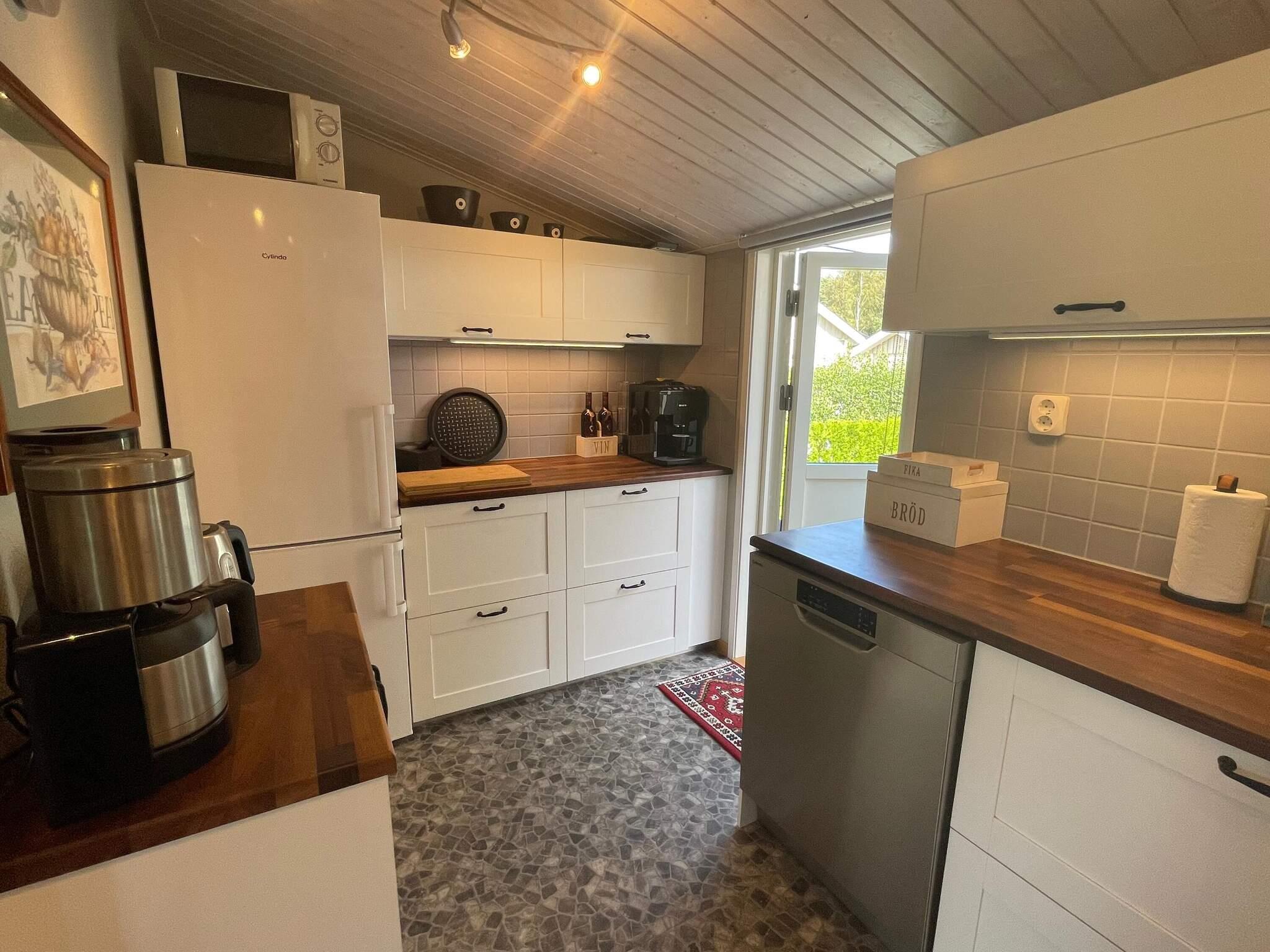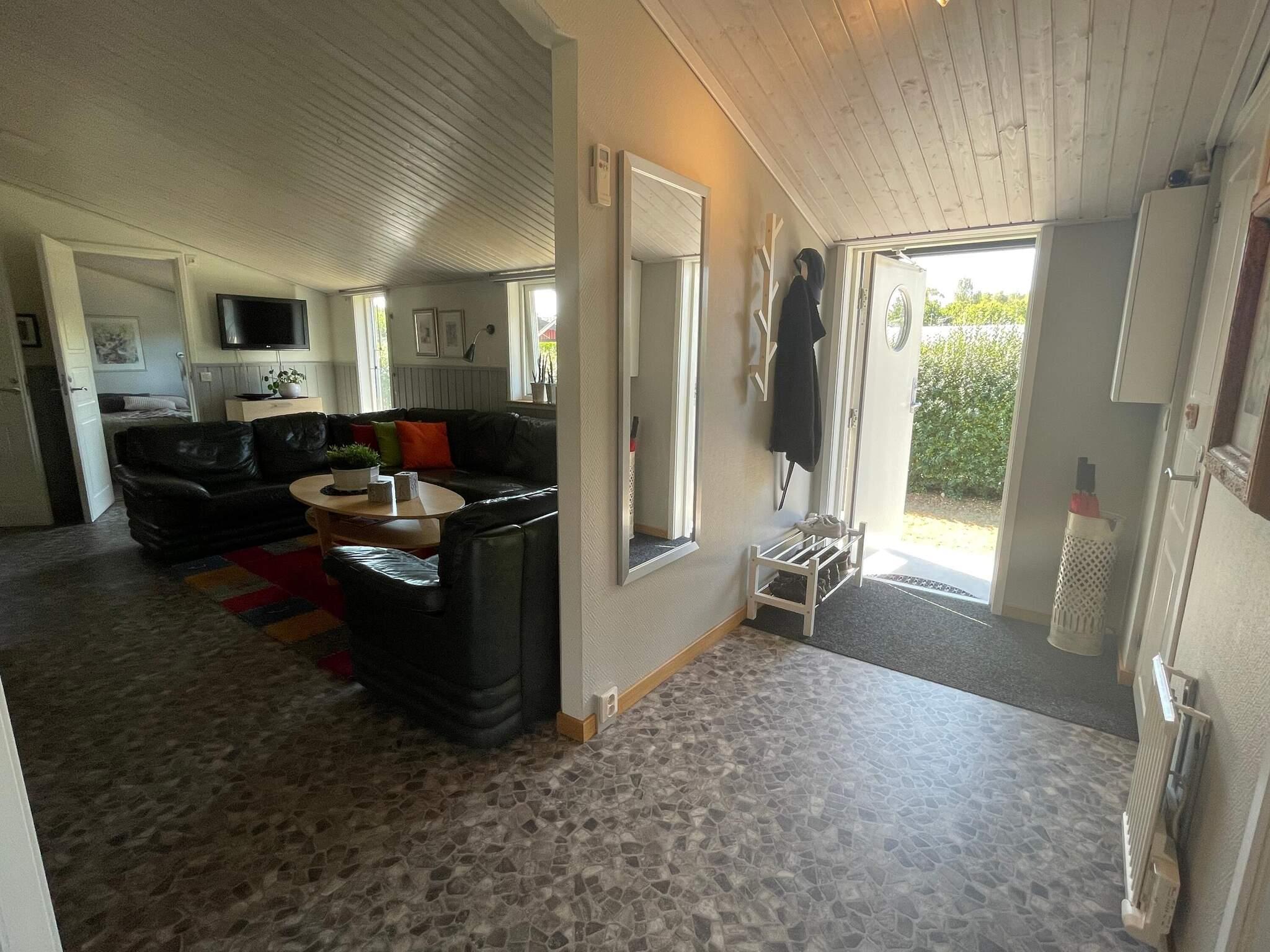 Genom husets entré finns en hall med ingång till det väl utrustade köket för självhushåll och även altandörr direkt ut på husets baksida med utemöbler. I allrummet är den stora soffan den perfekta platsen att koppla av på framför brasan och tv. Här finns också matplats för alla att samlas kring för gemensamma stunder. Två sovrum med dubbelsäng i vardera rummet och ett sovrum med en bredare enkelsäng. Badrummet med dusch och tvättmaskin utöver handfat och wc. Ett par trappsteg ner i allrummet finns fler möblemang för avkoppling och sittmöjligheter framför tv med svenska kanaler. Det går även att använda sitt eget programutbud på denna smart tv. Skjutpartier i glas gör det även härifrån möjligt att ta sig ut på terrassen med olika utemöbler att sitta vid. Parasollet ger behaglig svalka de soligaste dagarna. Husets baksida angränsar mot skog och har grönskande häckarna som omger trädgården vilket ger ett bra insynsskydd.