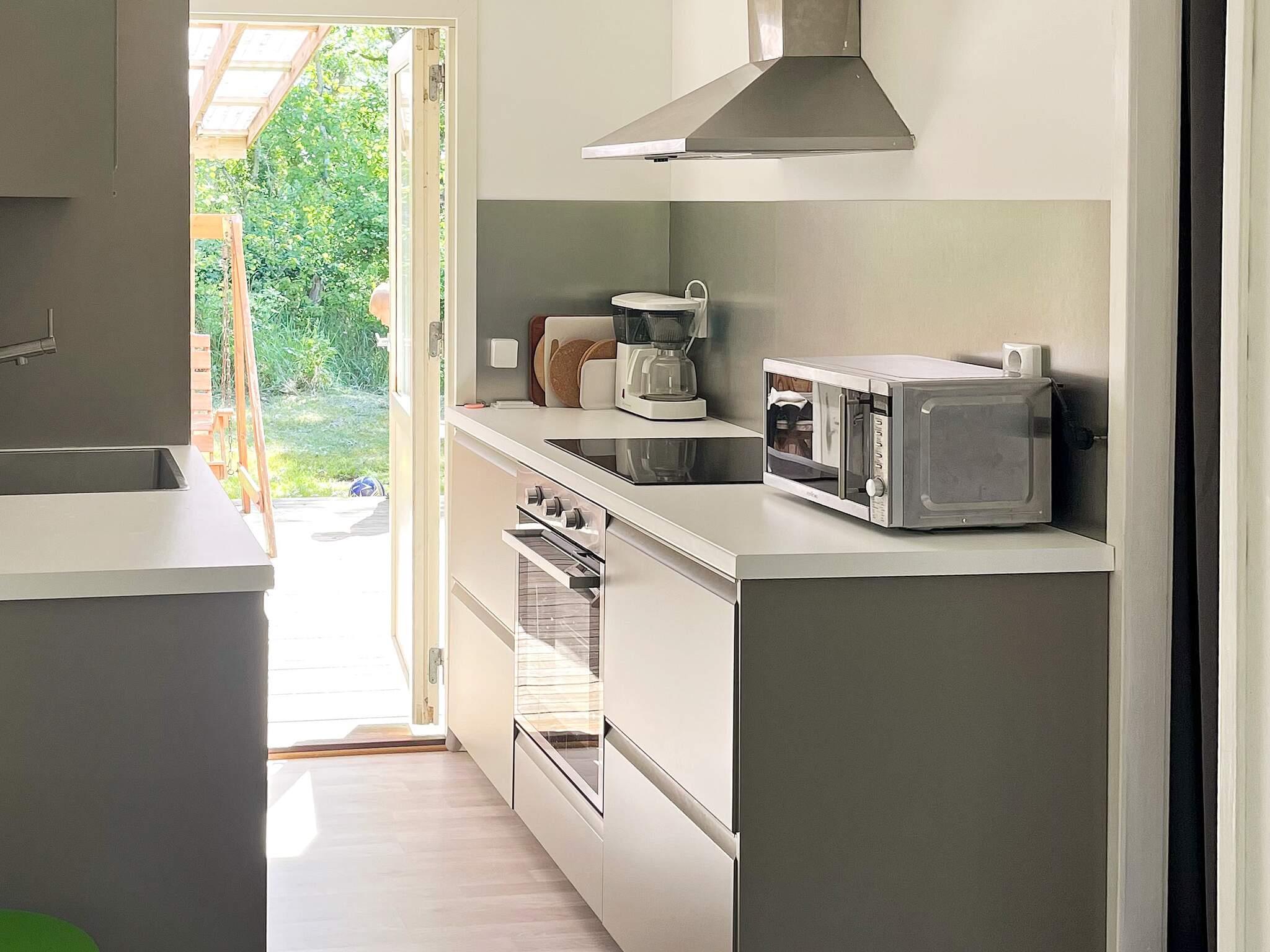 Vardagsrummet har en bekväm soffgrupp och en matplats. Här finns en TV samt en värmande braskamin vid lite kyligare kvällar. Det fina köket är litet men utrustat för allas behov. Från köket finns utgången till den stora altanen.