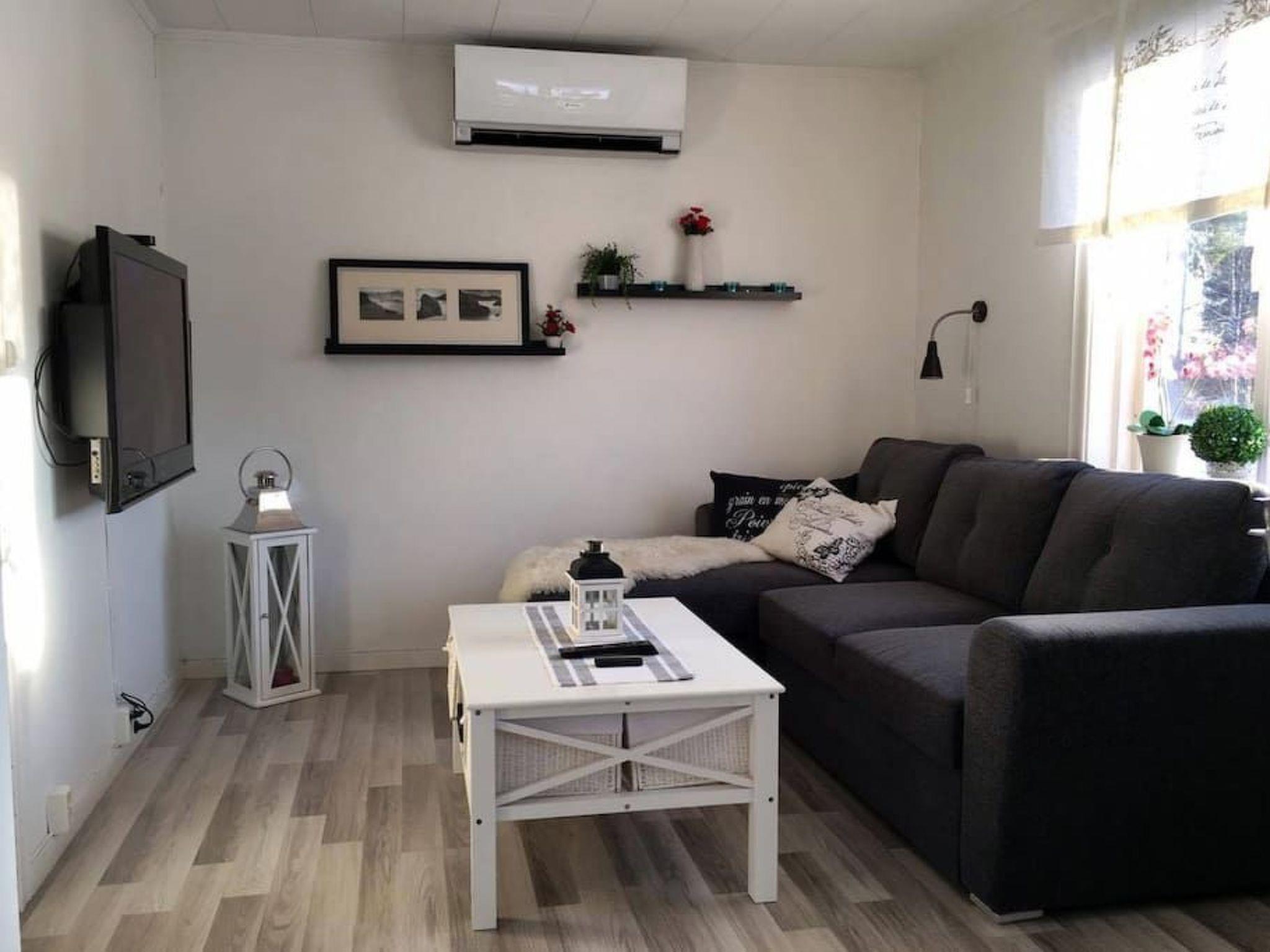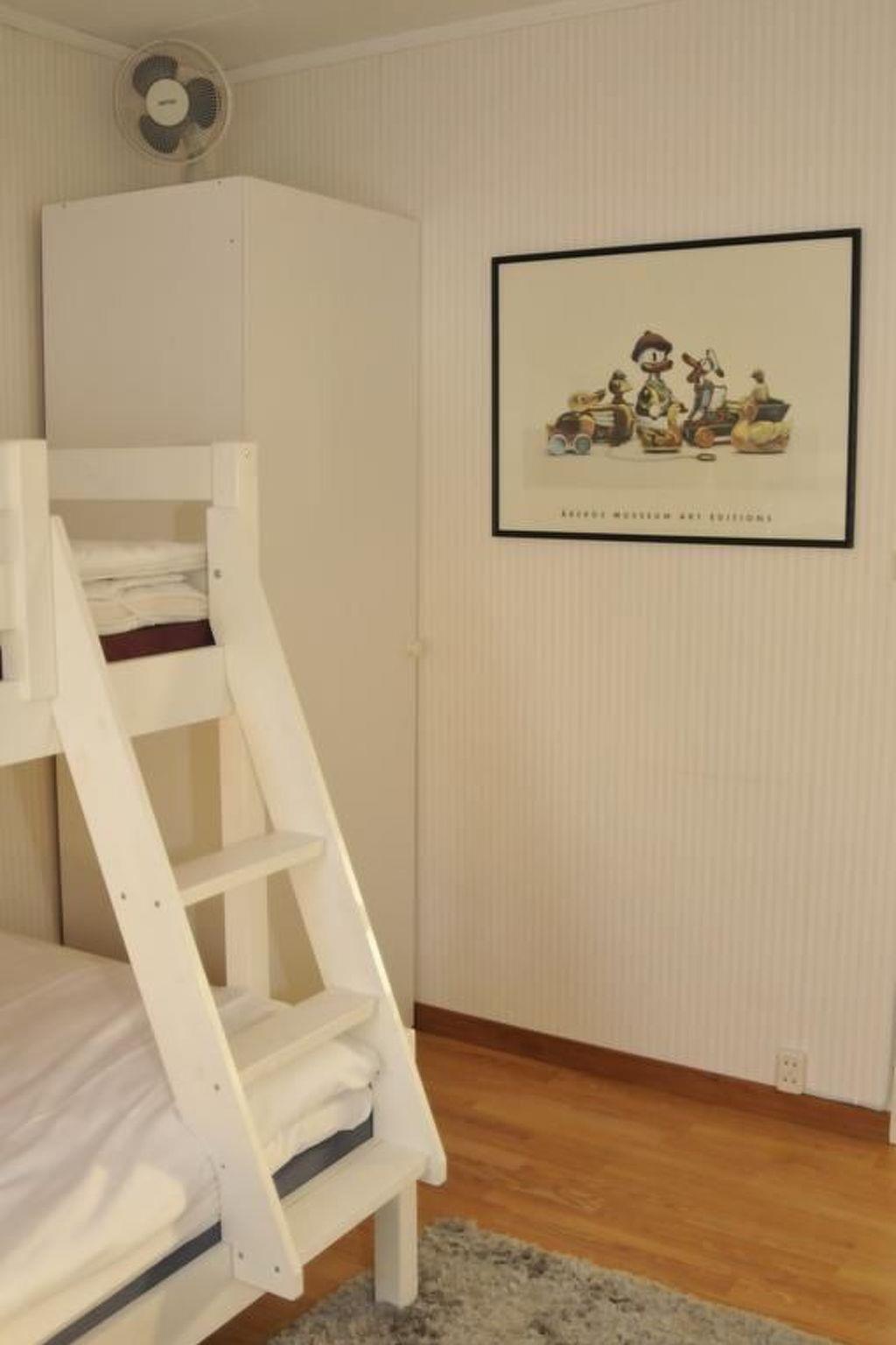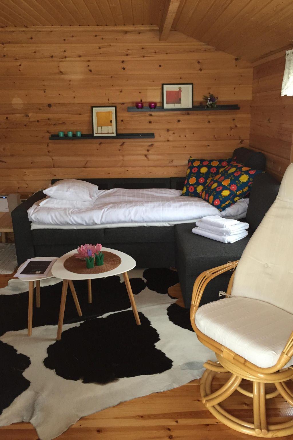 The wooden house can accommodate up to seven people and has an air-conditioned living and dining room with a sofa bed, a coffee table, a flatscreen TV with Swedish channels, Apple TV, Google Chrome and an iPad connection, as well as a dining table with four chairs. The kitchen is fully-equipped with all the necessary appliances and has a further dining table with four chairs. The bedroom is furnished with a bunk bed, comprising a 90 x 200cm mattress and a 120 x 200cm mattress, for up to three people. The bathroom has a shower, washbasin, toilet and washing machine with a dryer function. The 15m² annex consists of a living room-bedroom with a sofa bed, an armchair, a coffee table, a flatscreen TV, a shelf and a dining table with two chairs. Wi-Fi is available.