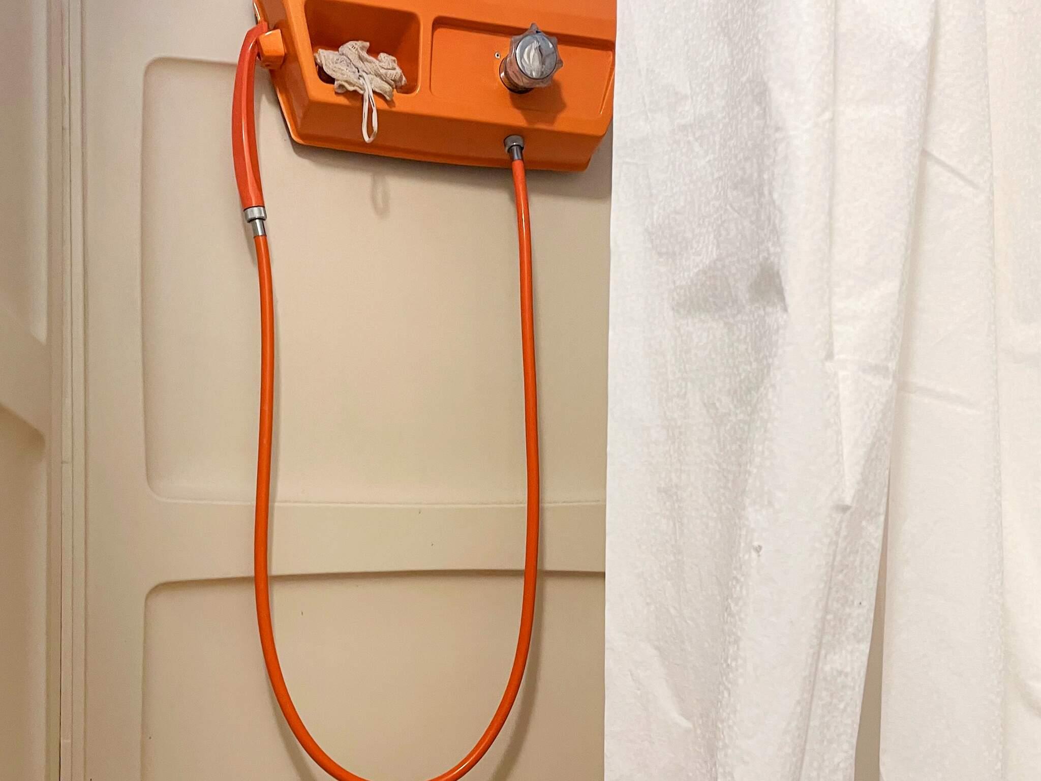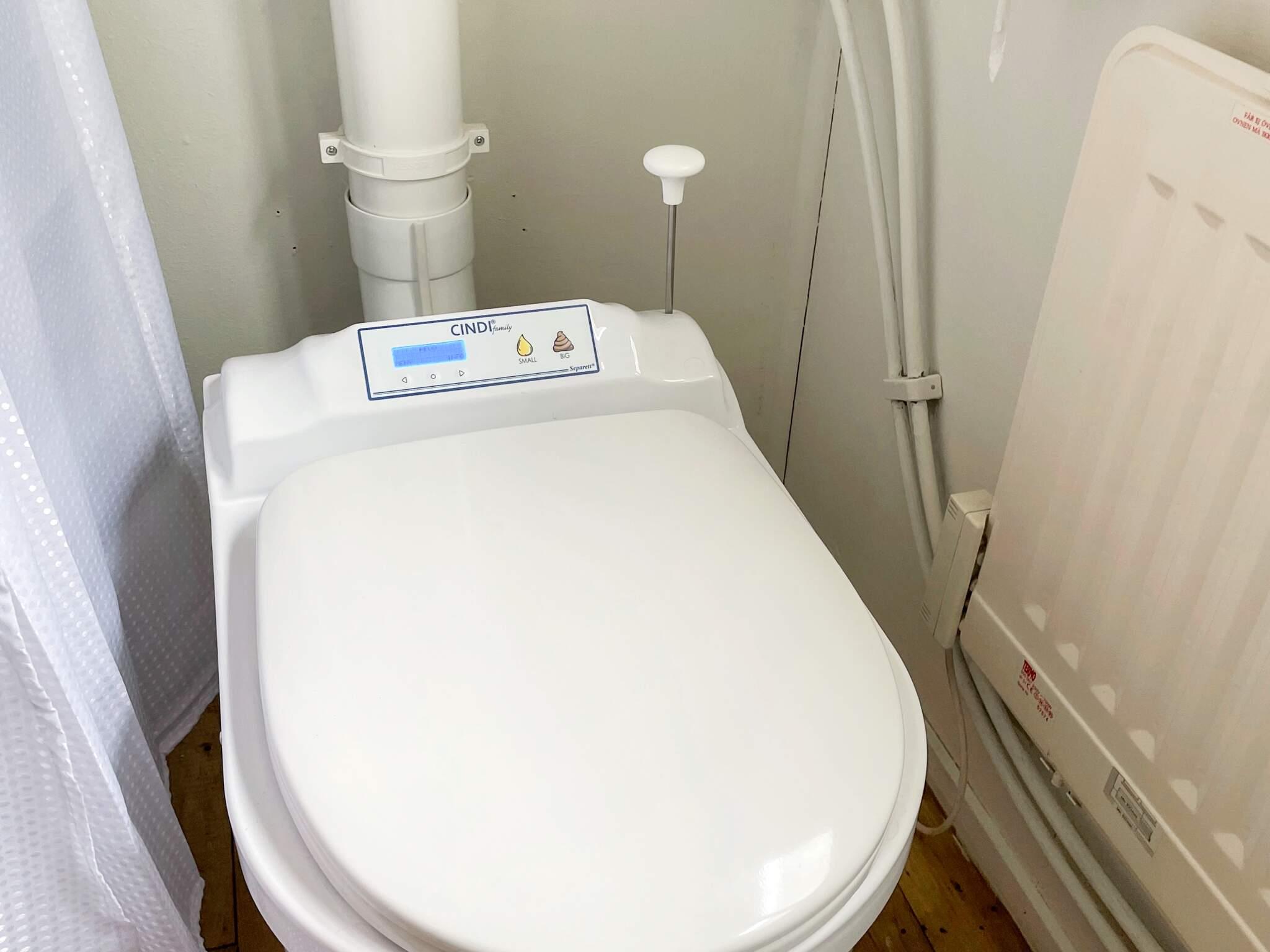 Toaletten är utrustad med en modern förbränningstoalett och här finns duschen i ett separat utrymme.