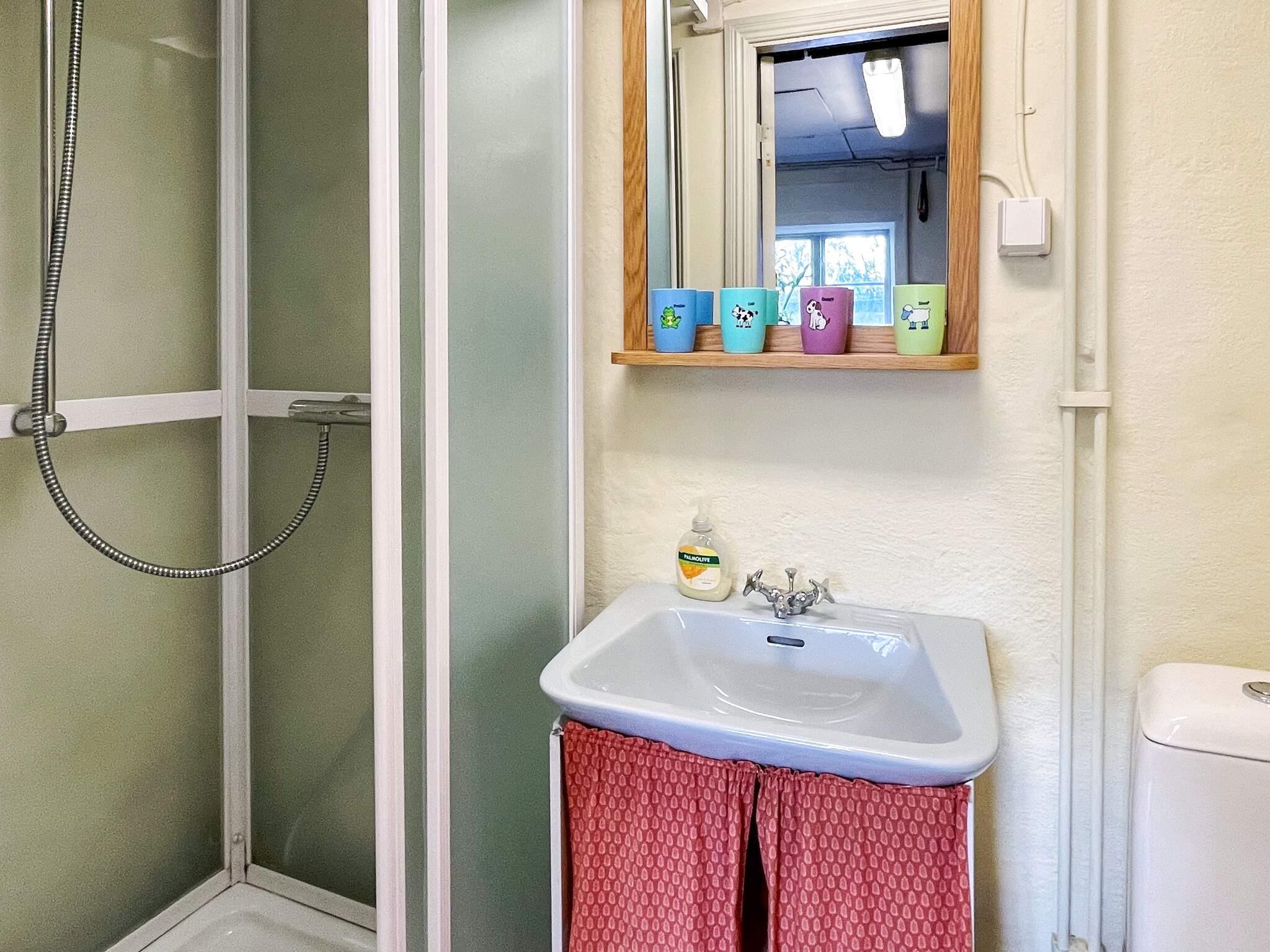 Vid stugans entré kommer ni in i en hall som används som pannrum där det finns en tvättmaskin och där ni når badrummet.
