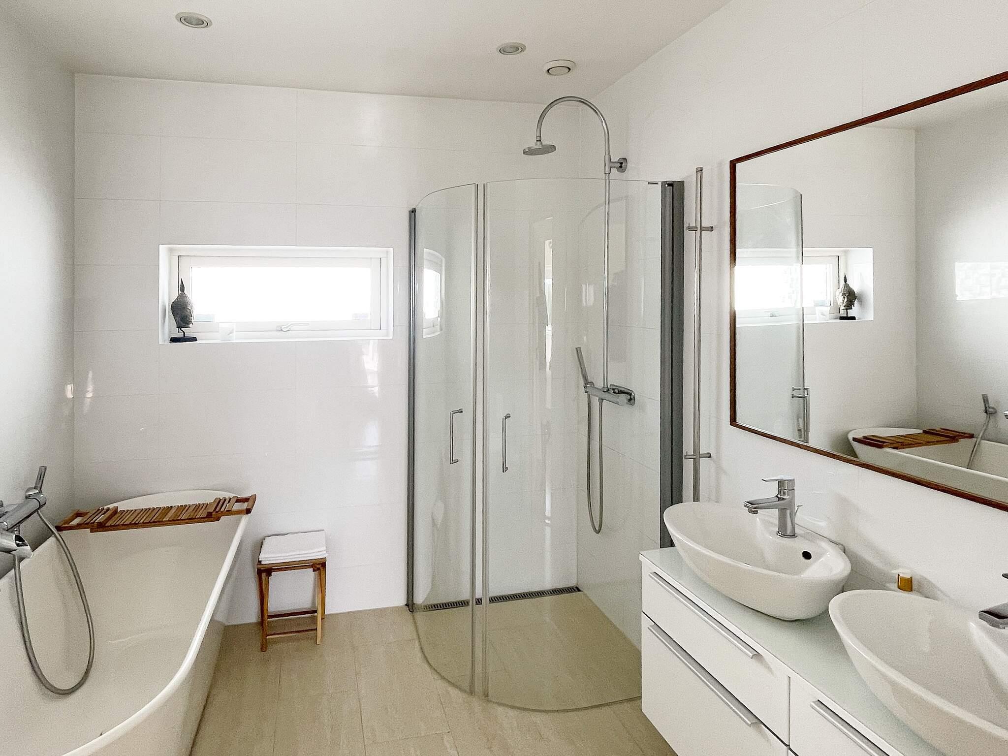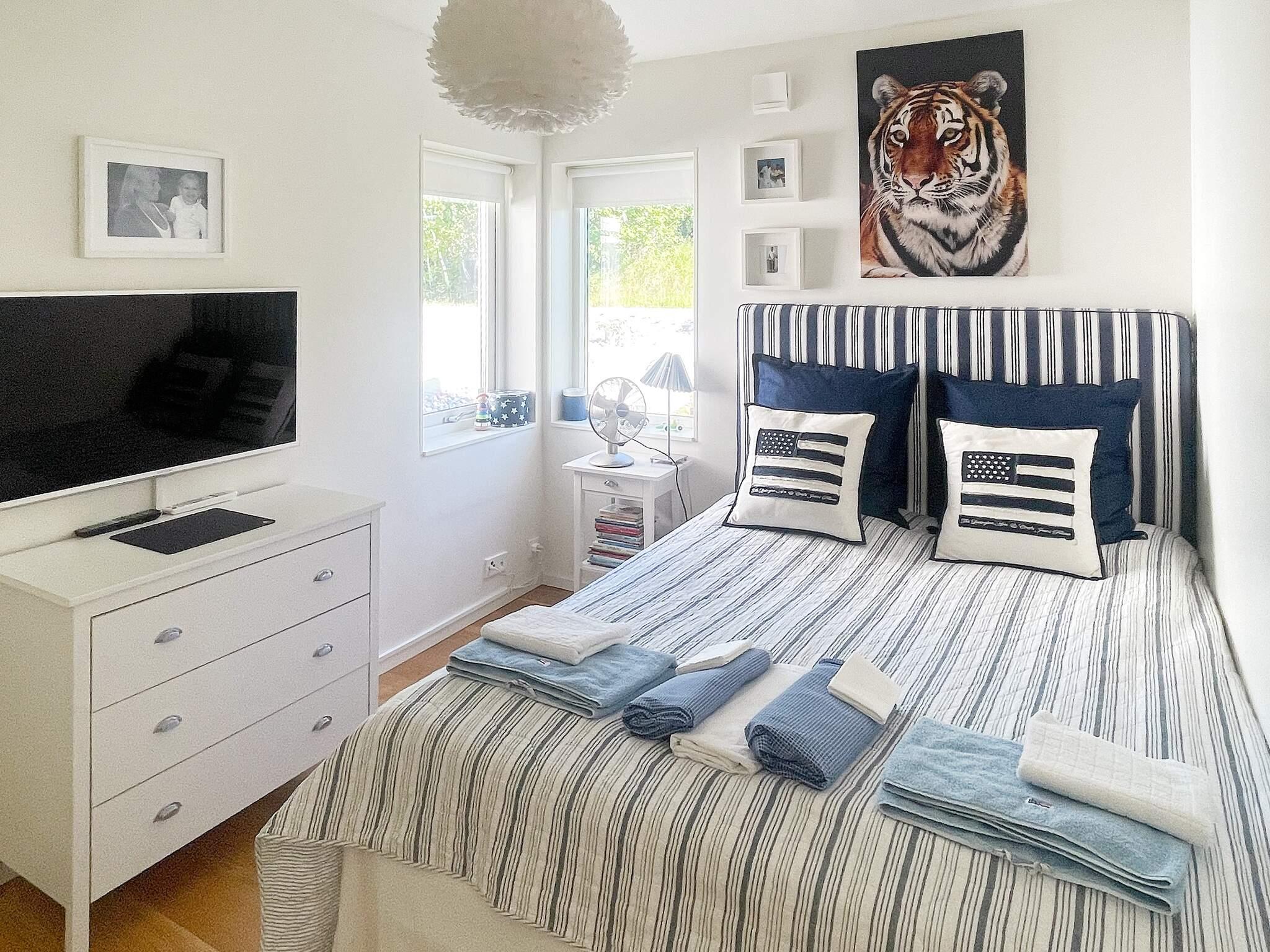 Vitt högblankt kök med bänkskiva i svart granit, fullt utrustat med bl a dubbel kyl/frys, varmluftsugn, induktionshäll. I matsalen står ett franskt, massivt lantbord, med matplats för upp till 10 pers. Masterbedroom har dubbelsäng från CarpeDiem och utgång till terrassens baksida. I taket hänger en vacker kristallkrona, platt-tv samt DVD spelare. I sovrum 2 finns även där en dubbelsäng, 50 tums tv och strålande sjöutsikt. Sovrum 3 är även det utrustat med en queen size säng samt tv på väggen. På loftet finns ytterligare en säng om 120 cm samt ett skrivbord.