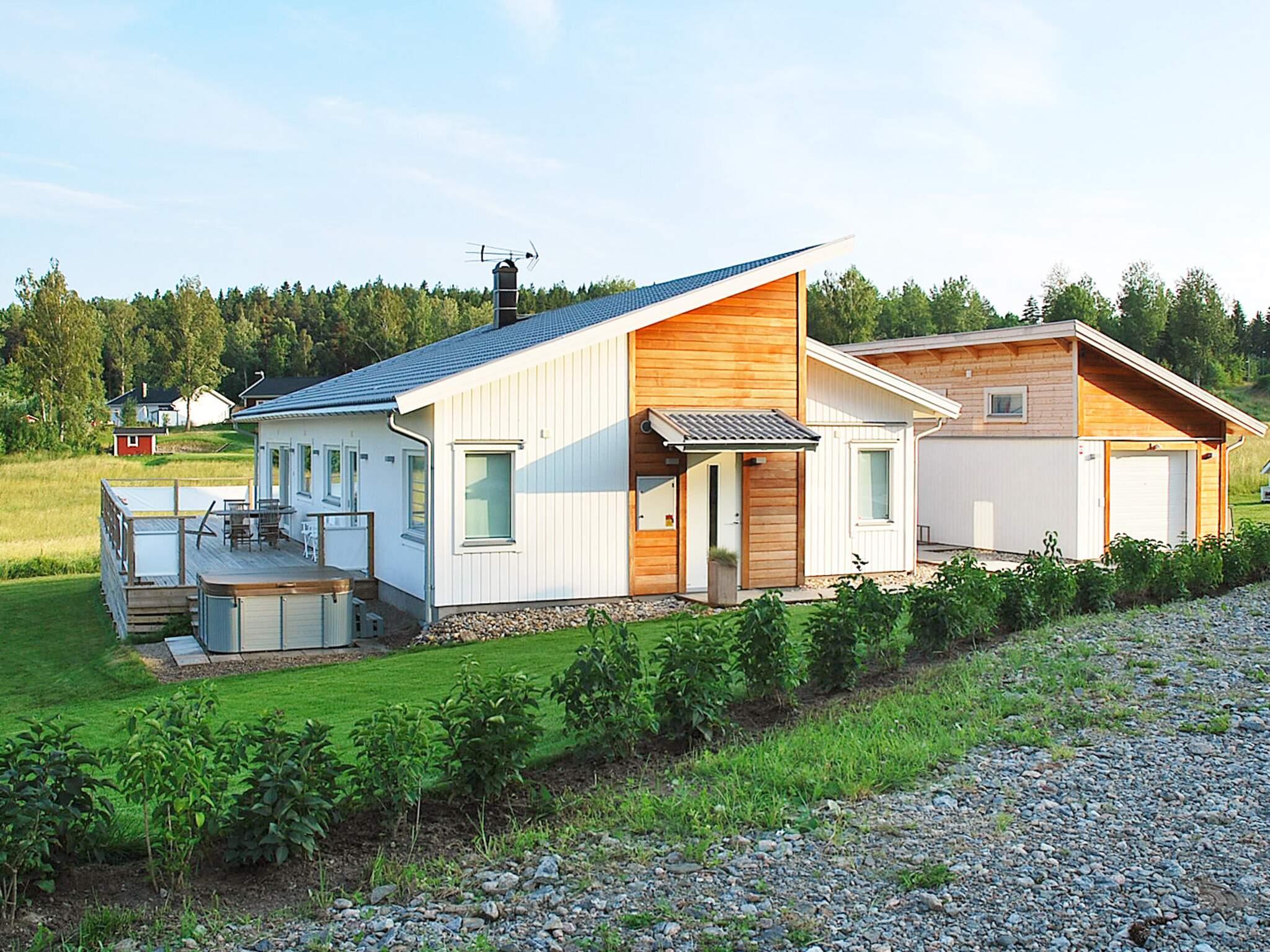 Stort trädäck med strålande sjöutsikt löper runt hela fastigheten och här finns bubbelpoolen nedsänkt i terrassen för skön avkoppling. I övrigt är tomten plan och barnvänlig.