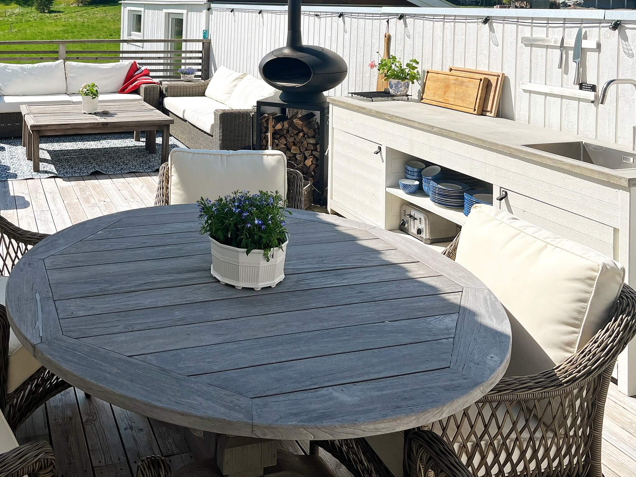 På det 195 m² stora trädäcket finns flera vilstolar, fyra utegrupper med plats för upp till 10 personer samt grillmöjligheter med både gasolgrill och kolgrill. Ett praktiskt utekök med diskho och bänkskiva i betong gör matlagningen ute till en fröjd.