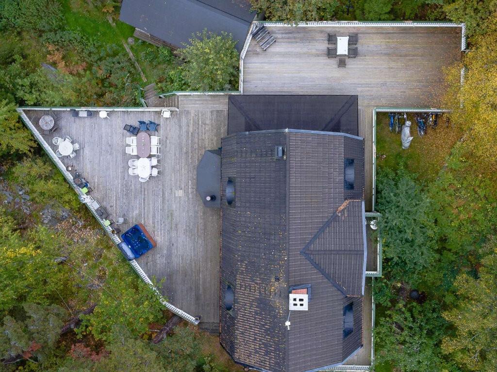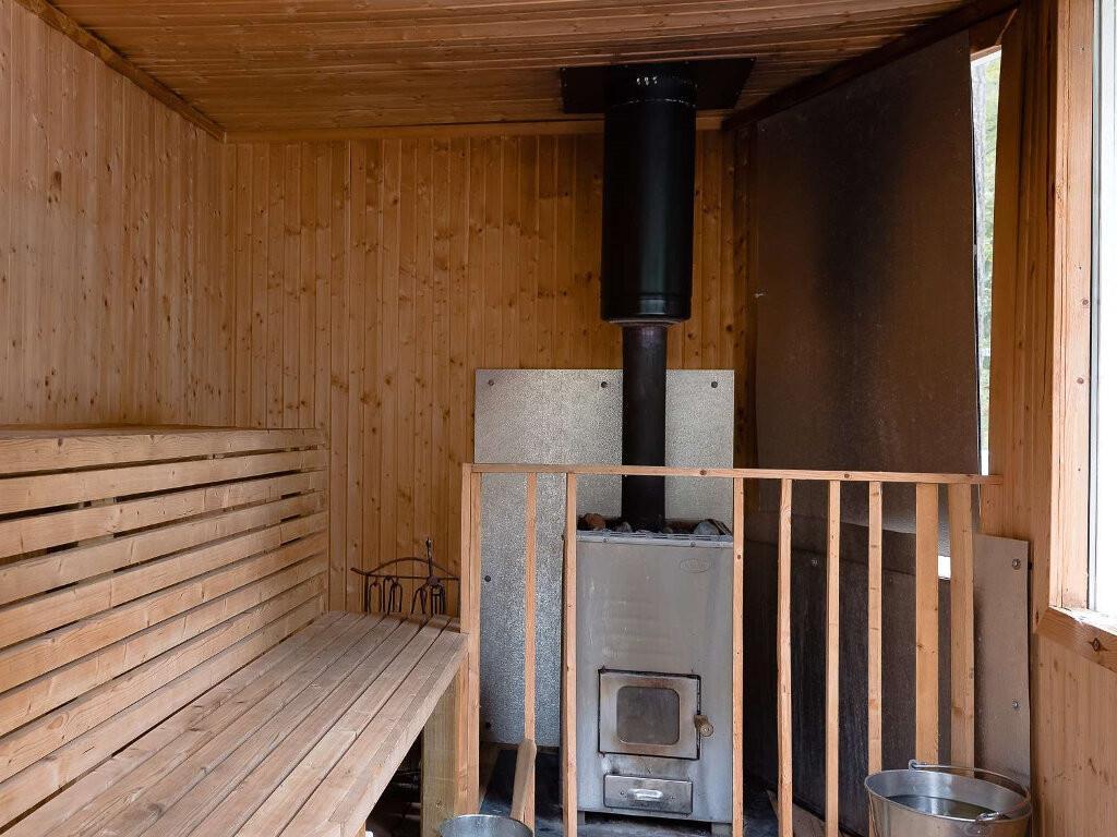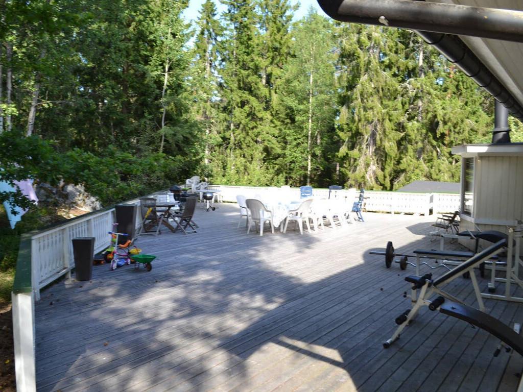Huset ligger som det sidste hus på en privat vej, og her er der ingen biltrafik, men bare fred og ro. På den frodige grund er der god plads til udeliv. Her er græsplæne og en terrasse på ca. 350 m2. Her finder I den brændeopfyrede sauna og et vildmarksbad. Der er mange havemøbler og både en kul- og en gasgrill. Der er også en stor udestue, som I kan have ekstra glæde af, hvis I kommer i den kølige sæson, eller hvis det regner en dag. Udestuen har en gas-varmeovn til ekstra opvarmning.