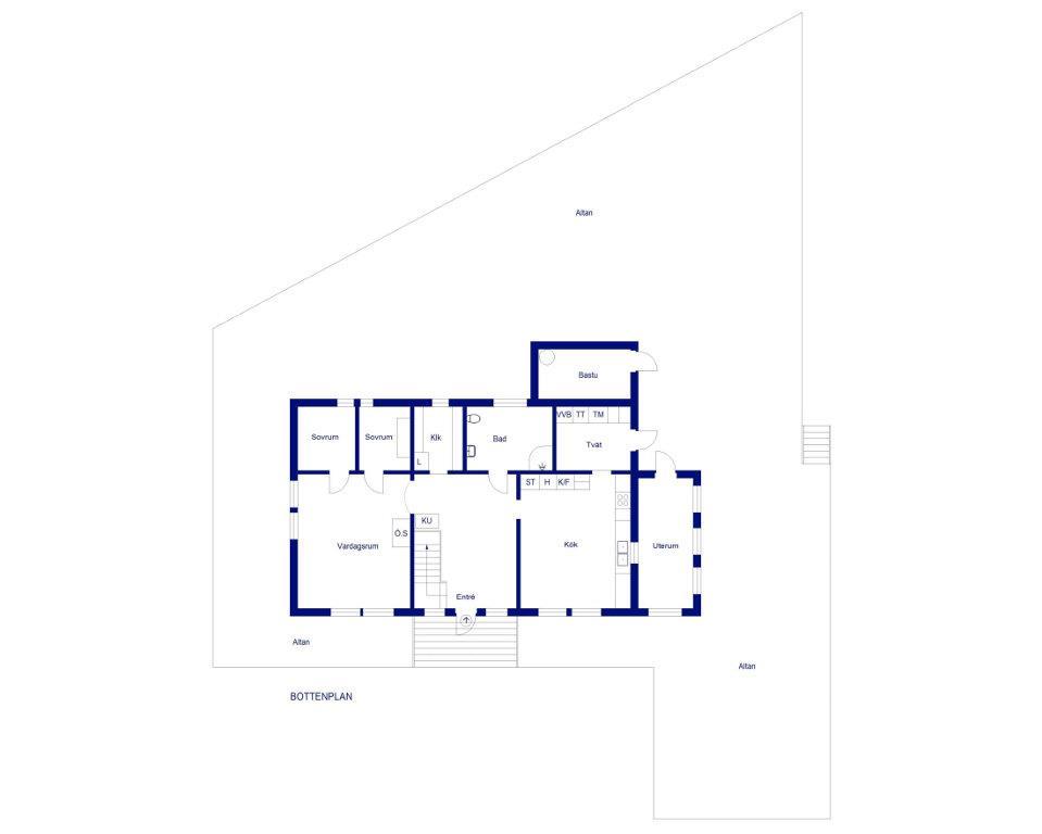 I stueplan har huset et stor hall med kamin, en stor stue med åben pejs, et meget stort og veludstyret køkken med mange siddepladser, et stort badeværelse med toilet, hjørnebadekar og bruser, et vaskerum med vaskemaskine og tørretumbler samt de 3 soveværelser.