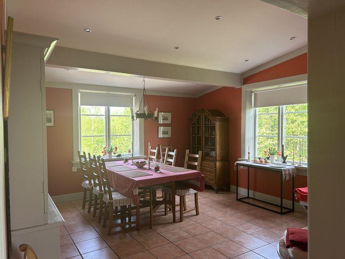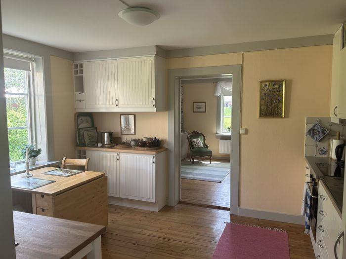 Rummelig og lys stue med pejs (og mulighed for at hugge jeres eget brænde). Stor spisestue med udsigt over søen. Veludstyret køkken med lille opvaskemaskine, mikroovn, køleskab og fryser. Komplet badeværelse med vaskemaskine i stueetagen og et ekstra toilet på første sal.