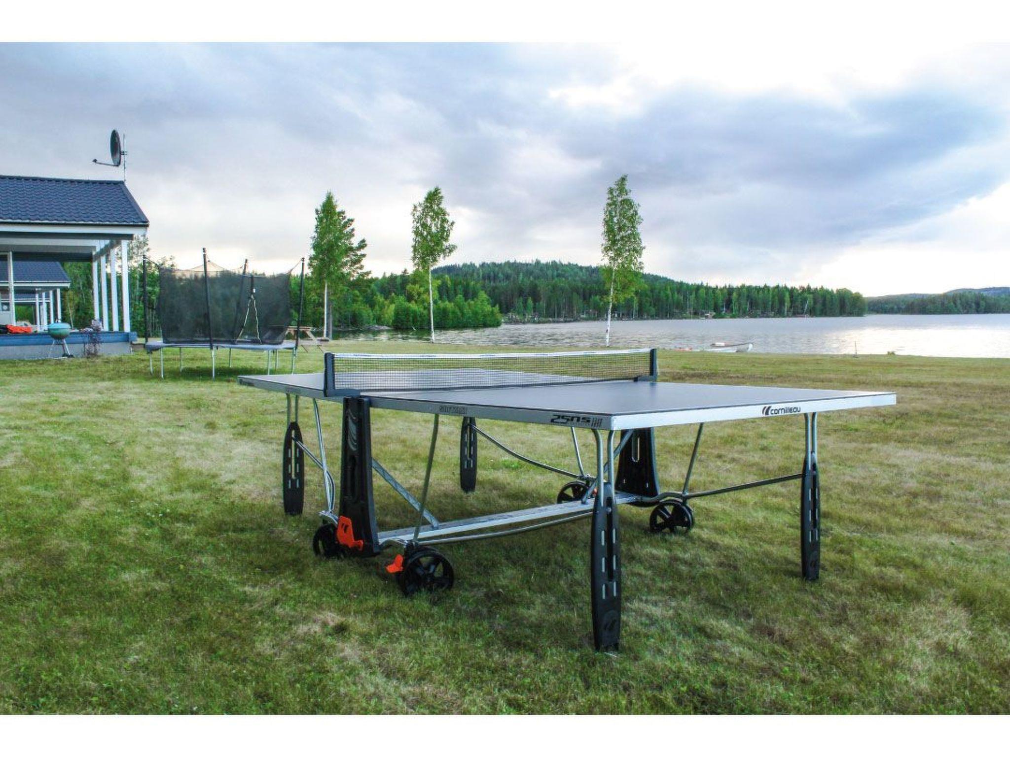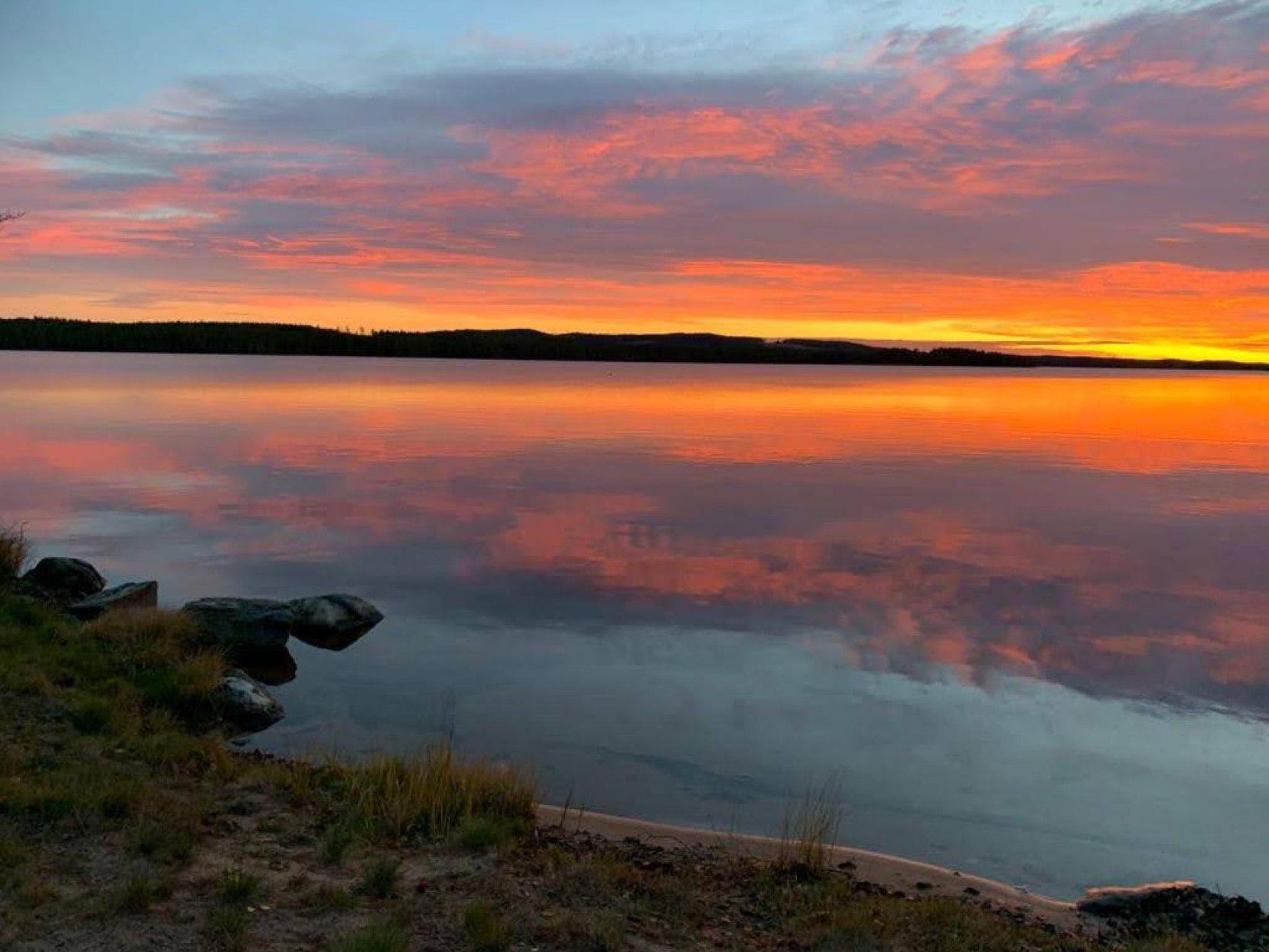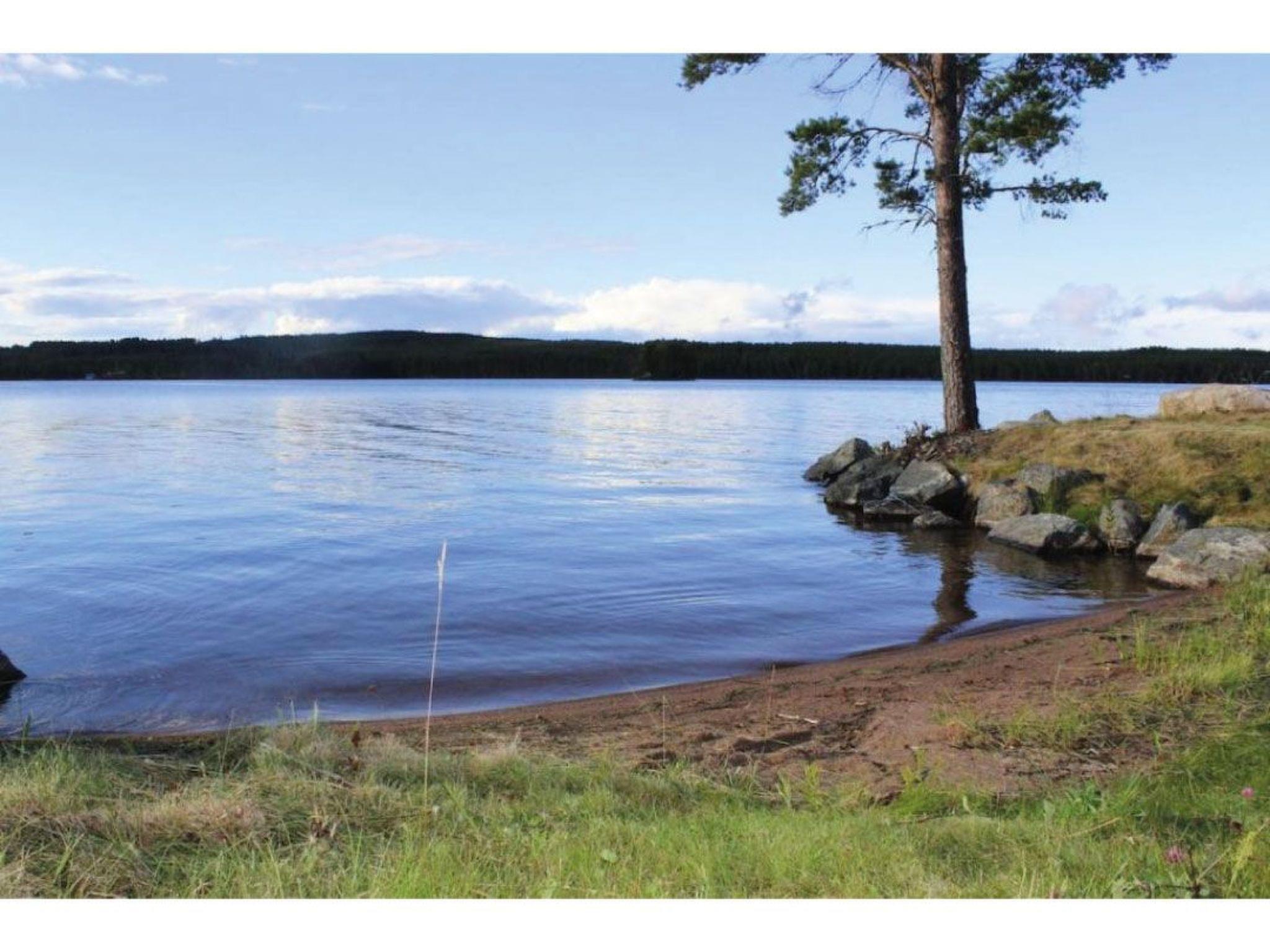 Just on the lake shore with a very large grass area around, lots of fish in the lake for fishing lovers, ramp for the boats and for sunbathing or swimming. Each house has his own picnic wooden table in front of it.Very nice and peaceful area for walking and enjoying the forest.The closest village to Svärdsjö where you can shop and dine is about 13 km far.