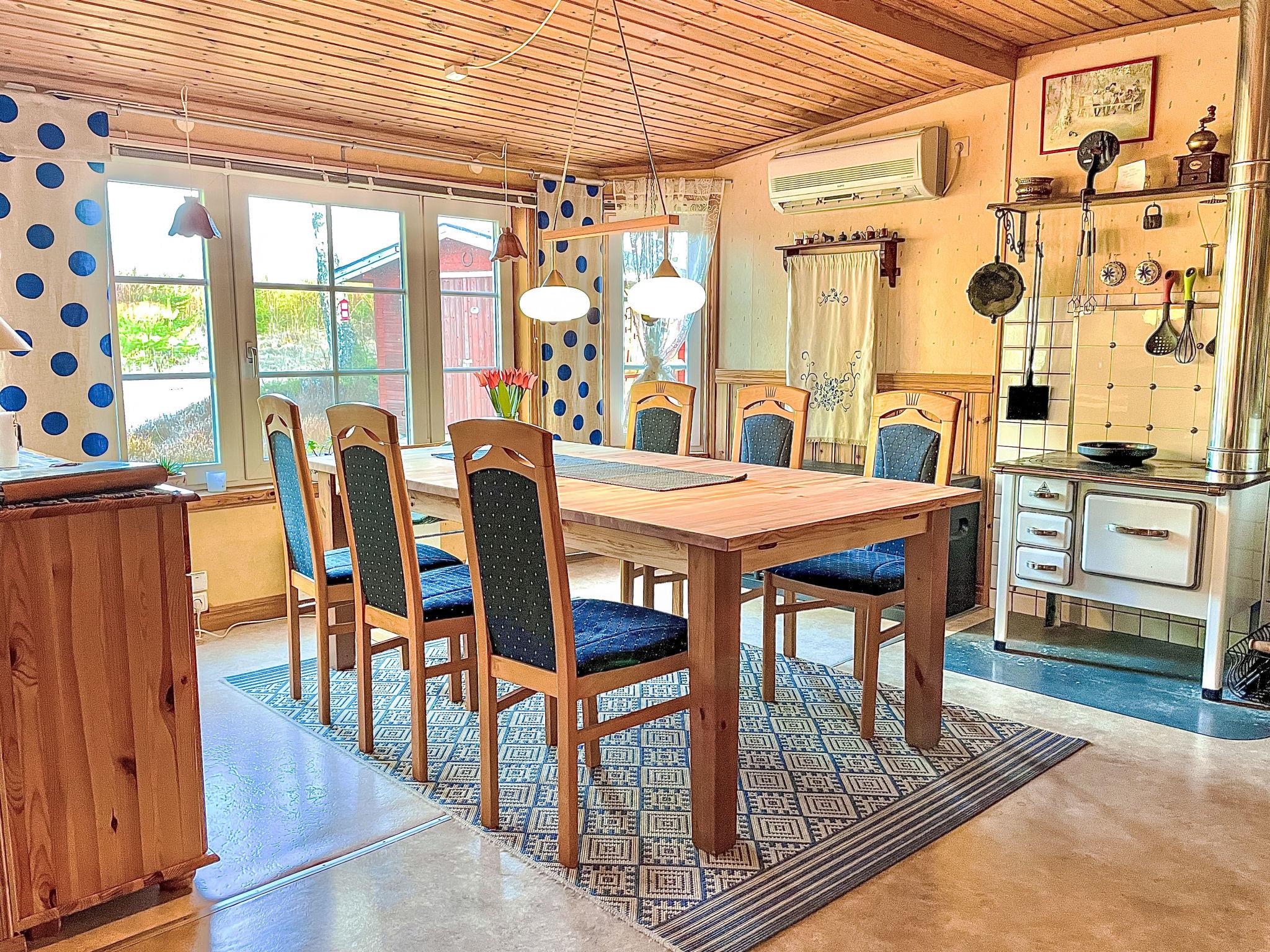 The idyllically situated holiday home is a very well-kept ground-floor bungalow and offers enough space for up to six people. With a living space of approx. 100 m², it is situated on a large natural plot of approx. 1,650 m². The holiday home has a large living room with a wood-burning stove (which can be used to heat the entire holiday home), a large dining room with an open-plan kitchen, two bedrooms with large double beds (1.8 x 2.0 m), a children's room with bunk beds (0.9 x 1.9 m; due to the height, the lower bed is more suitable for children). The living room also has a TV with Swedish and German (HD) channels, Bluray player (also suitable for DVD and audio CD) and home cinema system for your entertainment. The kitchen is more than fully equipped with an electric cooker with ceramic hob and fan oven, extractor bonnet, microwave, fridge and freezer, dishwasher, coffee machine, Senseo coffee pod machine, toaster, tea maker, kettle, egg boiler, waffle iron and, as a piece of jewellery, an old cooker with enamel panelling. The dining area has a table with six chairs and a highchair (Tripp Trapp). There is also a cosy conservatory and a bathroom with shower and WC.
