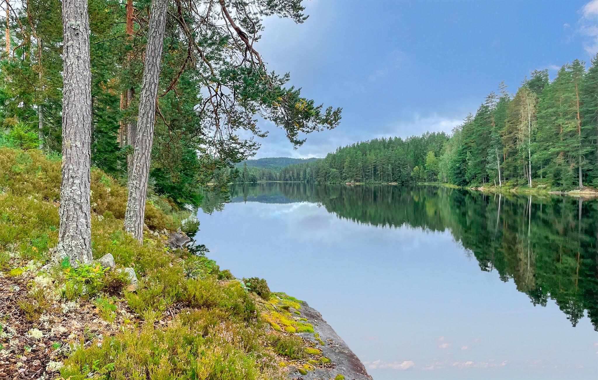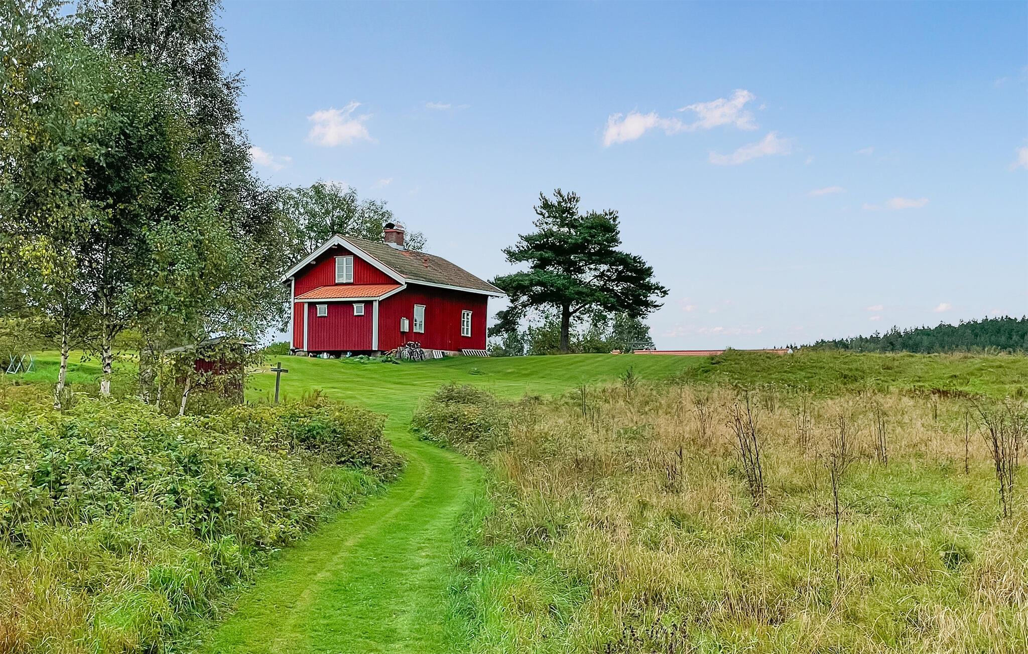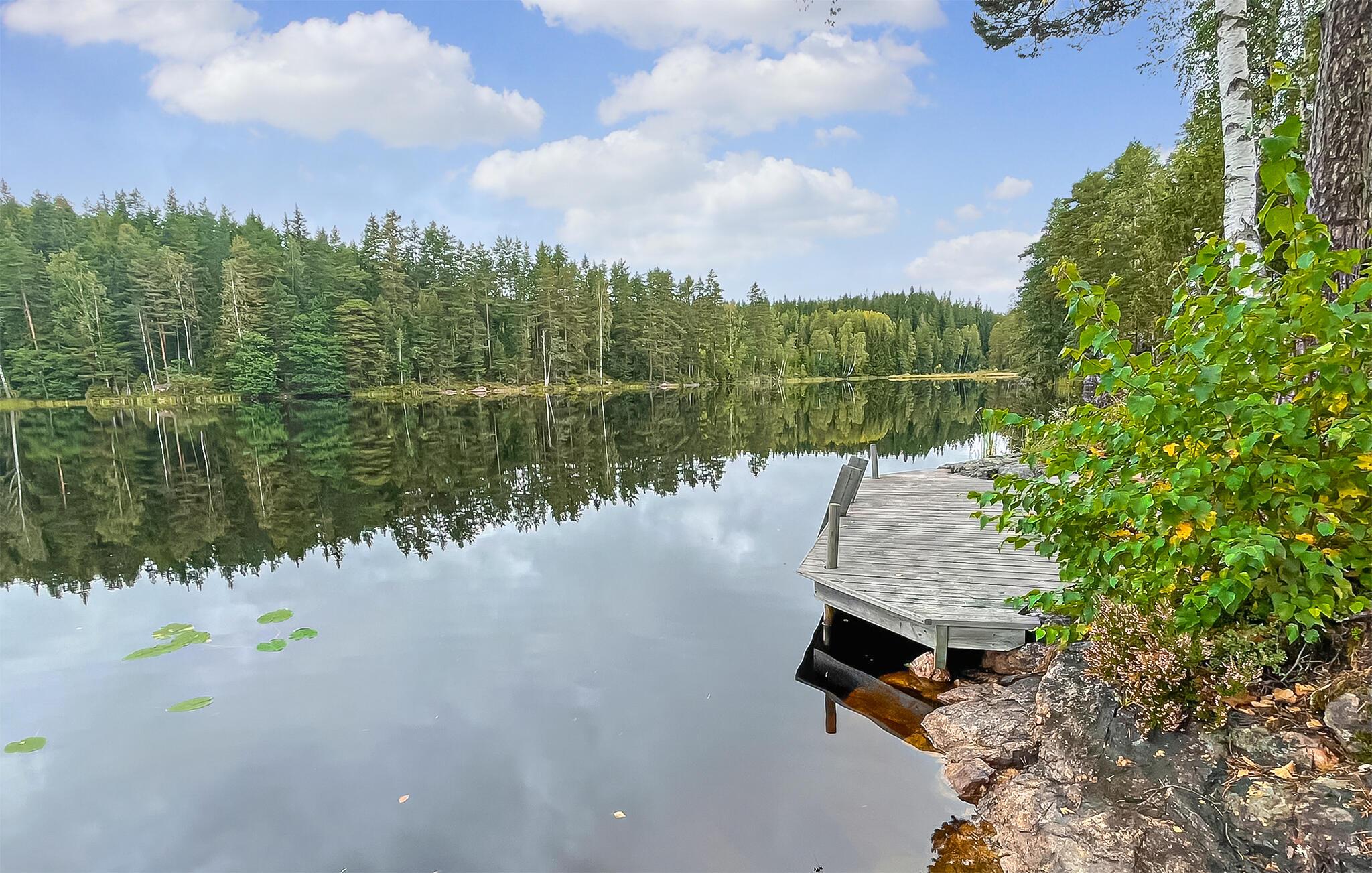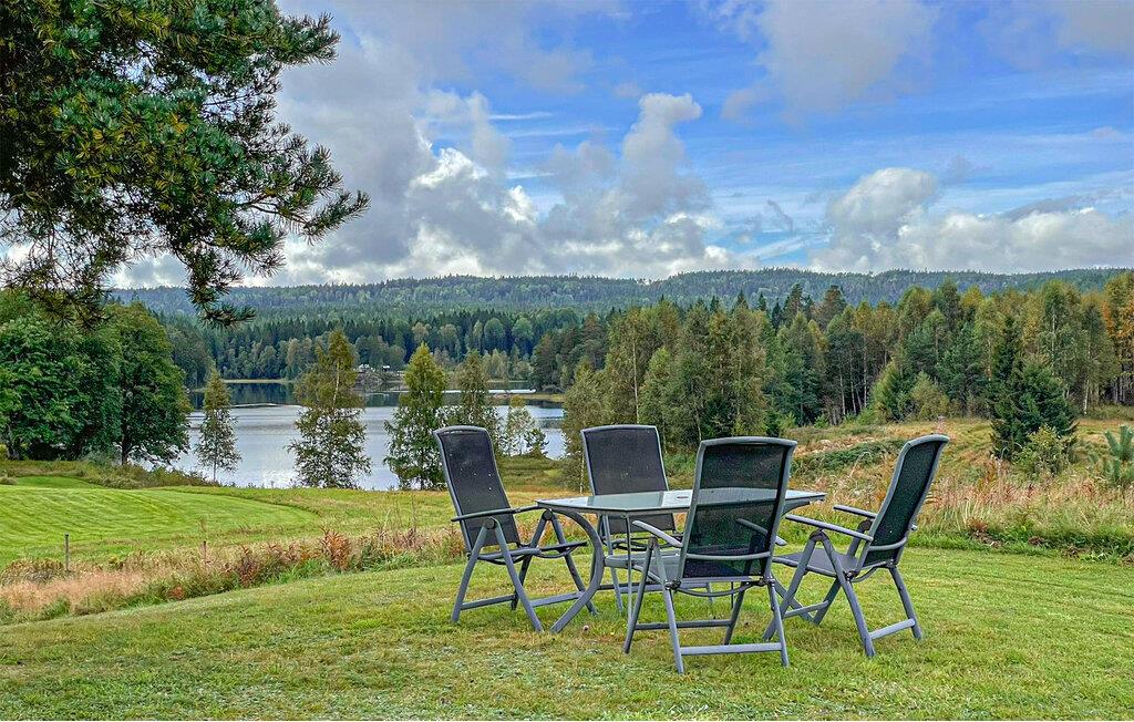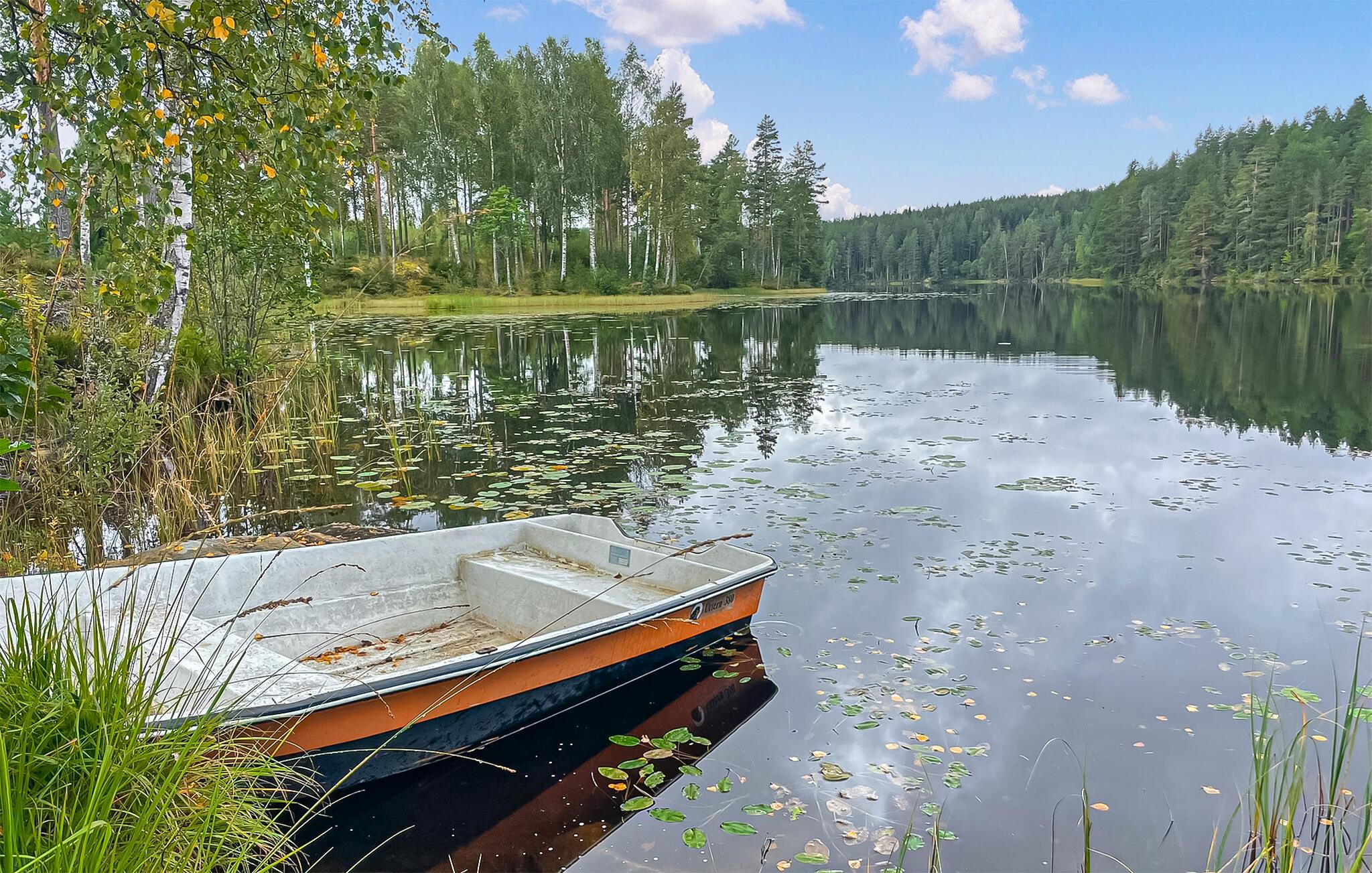 Træd ud på den store grund og nyd den fantastiske udsigt over de omkringliggende enge, skove og søen. Sid ved havebordet og Begynd dagene på en afslappet måde. Gå en tur ned til molen, hop i det klare vand eller tag en sejltur i den robåd, der er til rådighed.