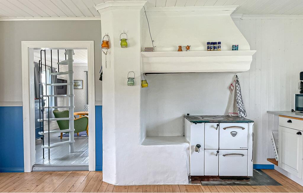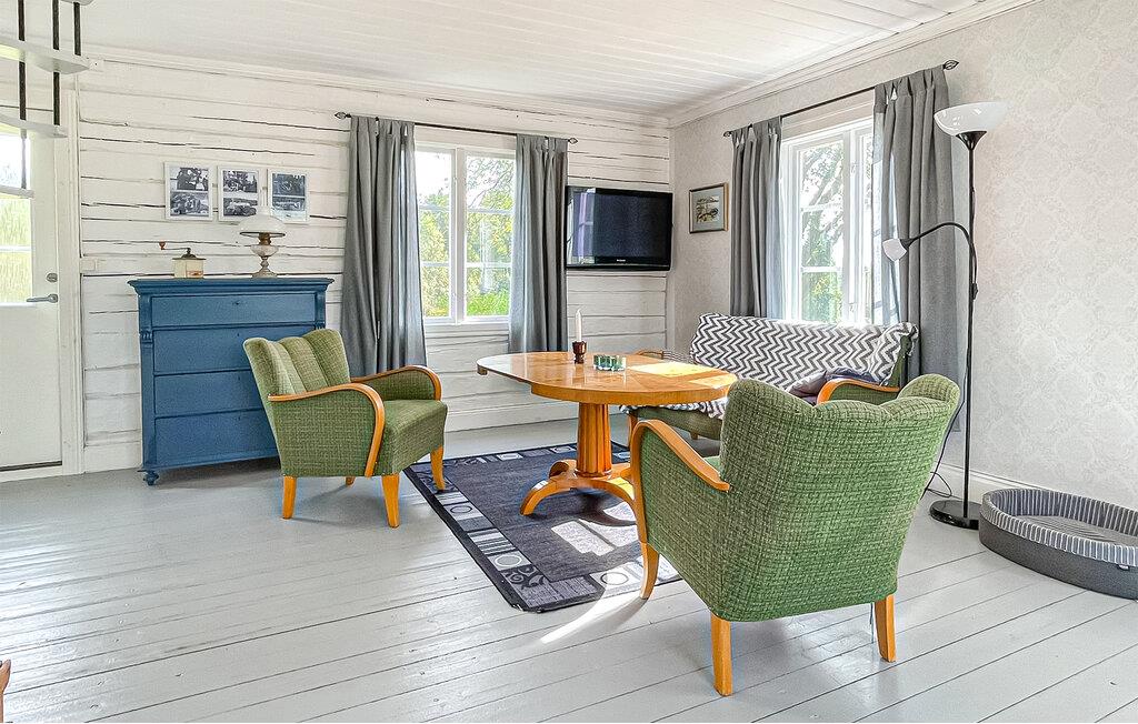 Tilbring uforstyrrede dage i jeres traditionelle bjælkehytte, beliggende på en halvø, der tilbyder fred og ro og natur lige uden for døren. Huset har en charmerende landlig stil og en varm atmosfære. Find jer til rette i det hyggelige interiør, slap af i lænestolene eller på sofaen. Nyd knitren fra brændeovnen på dage med koldt vejr, se en film på fjernsynet, og brug det rummelige køkken til at lave mad sammen.