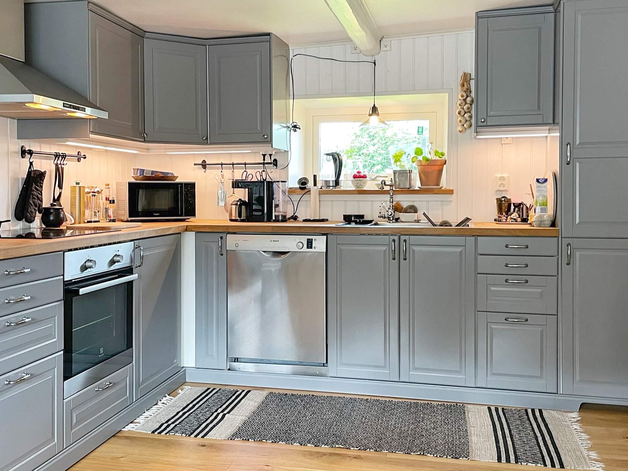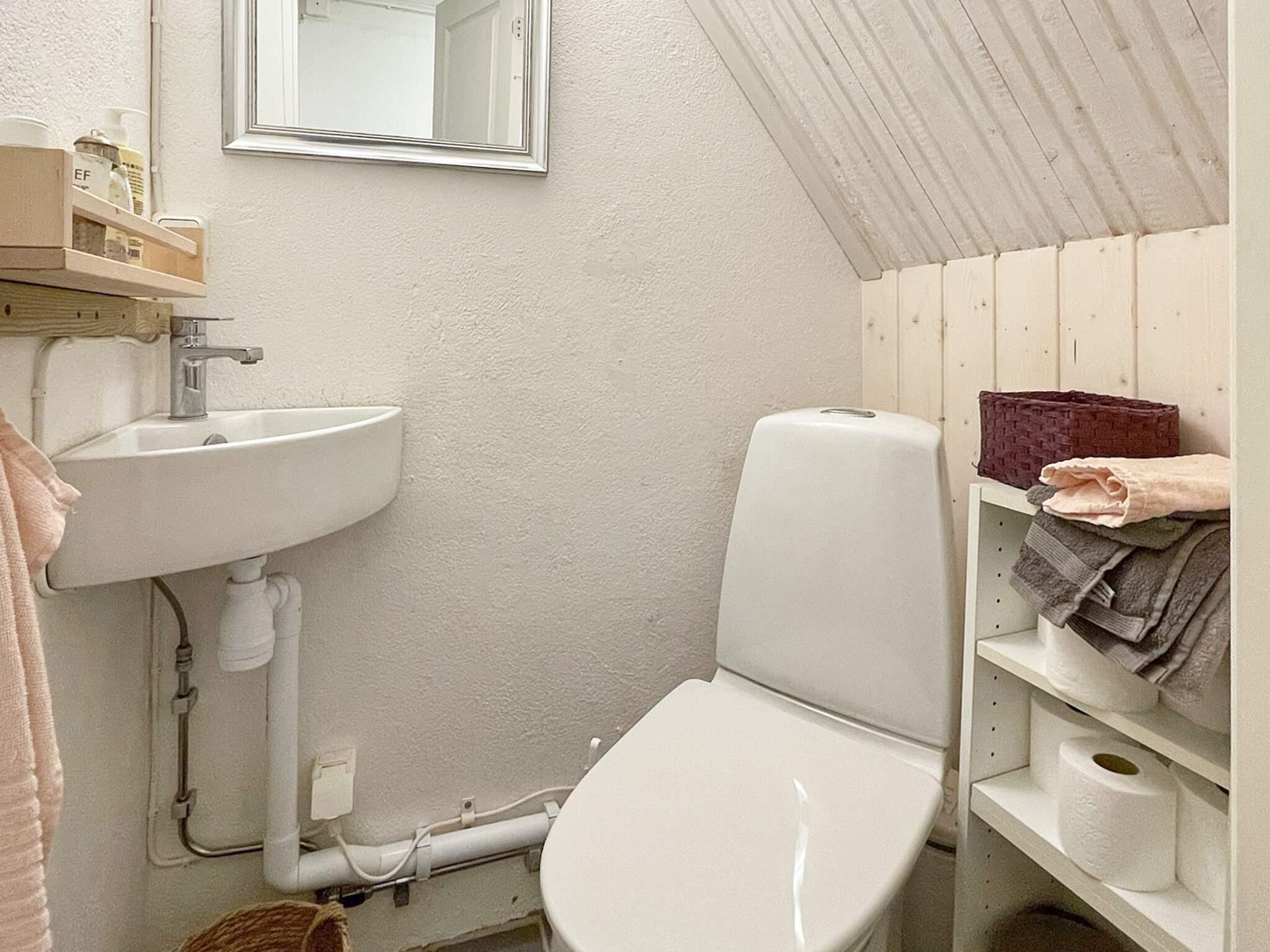 På nedre plan har du ett rymligt vardagsrum med soffa, fåtölj och tv. Här sitter du gärna och kopplar av efter en dag utomhus. Du har även ett väldigt fint kök där som skapar matlust och omfamnar en av värme. Här står du med glädje och lagar mat. Här ryms familjen eller sällskapet. Husets badrum är stort och renoverat med dagens höga standard så som golvvärme vilket värmer gott. Det ligger i anslutning till sovrummet med en dubbelsäng (160cm) på första plan bredvid köket. Tvättmaskin och extra wc har du även det på nedre plan jämte trappan.
