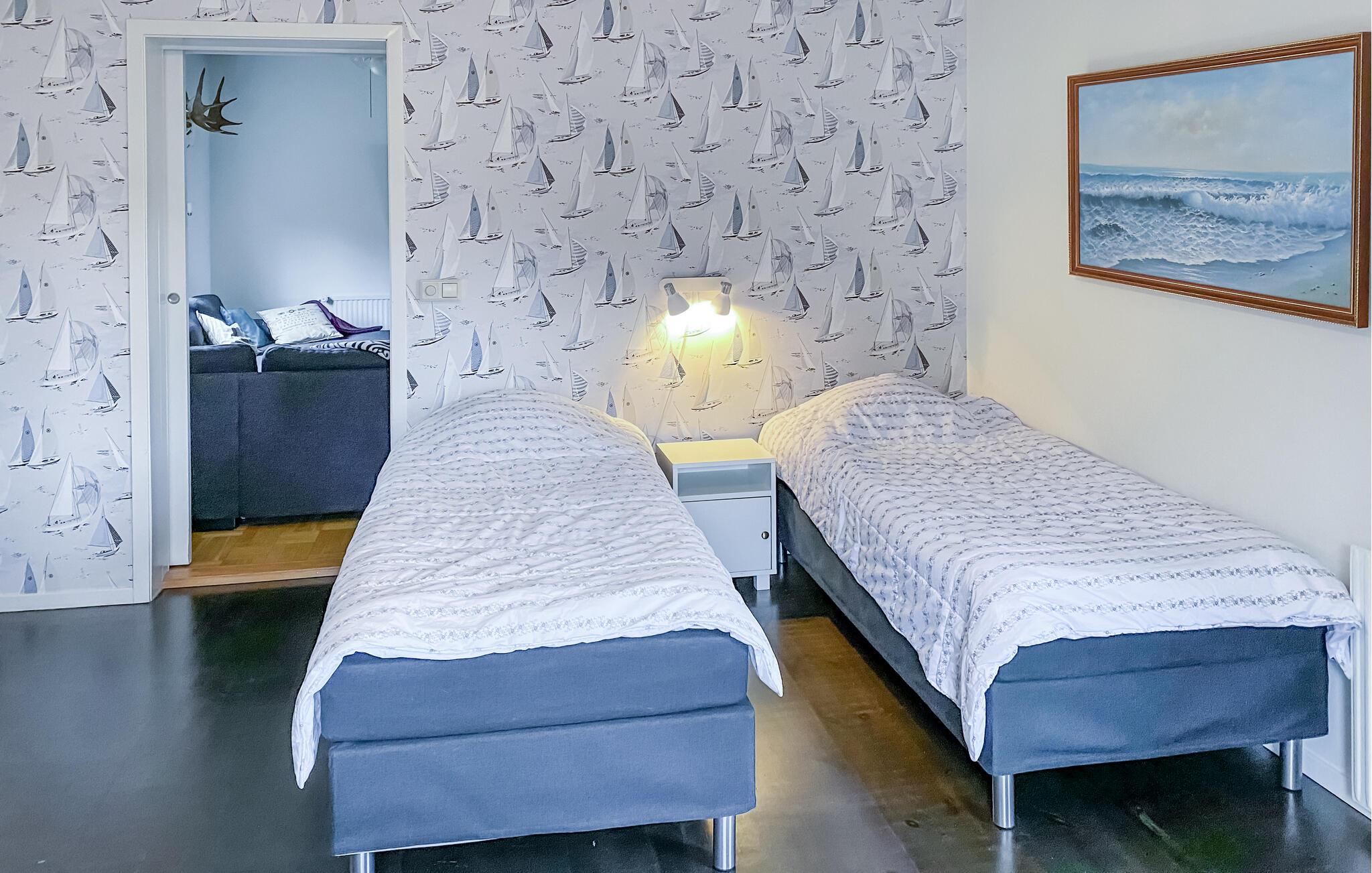 Fastboende i annekset på grunden. Grunden grænser ned til en jernbane og en vej (plankeværk med støjisolering afgrænser ejendommen). Her er fint at fiske om vinteren. I kan løbe langrend lige udenfor huset, alpinski i Asbybacken 12 km. Vimmerby med Astrid Lindgrens Värld 70 km. Træopvarmet sauna til 12 personer. I saunaen er der endnu et spabad til 7 personer. Der er ismaskine i huset.
