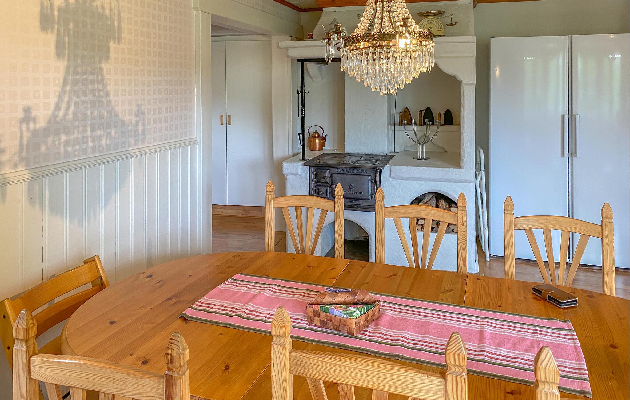 Dine morgener starter med en lækker morgenmad på den indbydende terrasse i jeres feriehus med udsigt over naturen. Lad jer fortrylle af den rolige atmosfære, og udnyt de mange komfortable udendørs siddepladser til at nyde naturen. Indenfor finder I et hyggeligt opholdsområde møbleret med komfortable møbler og en traditionel brændeovn. Sæt jer godt til rette i den behagelige sofa og tilbring afslappende timer med en god bog eller brætspil. Den smagfulde indretning og lysekronerne giver rummet et særligt præg. Det rummelige køkken lægger op til at nyde madlavningen sammen.