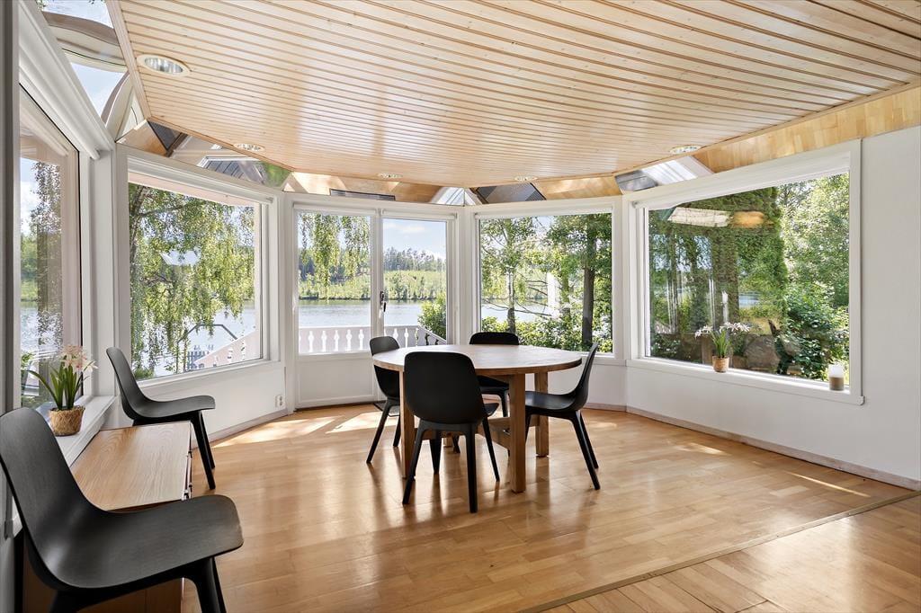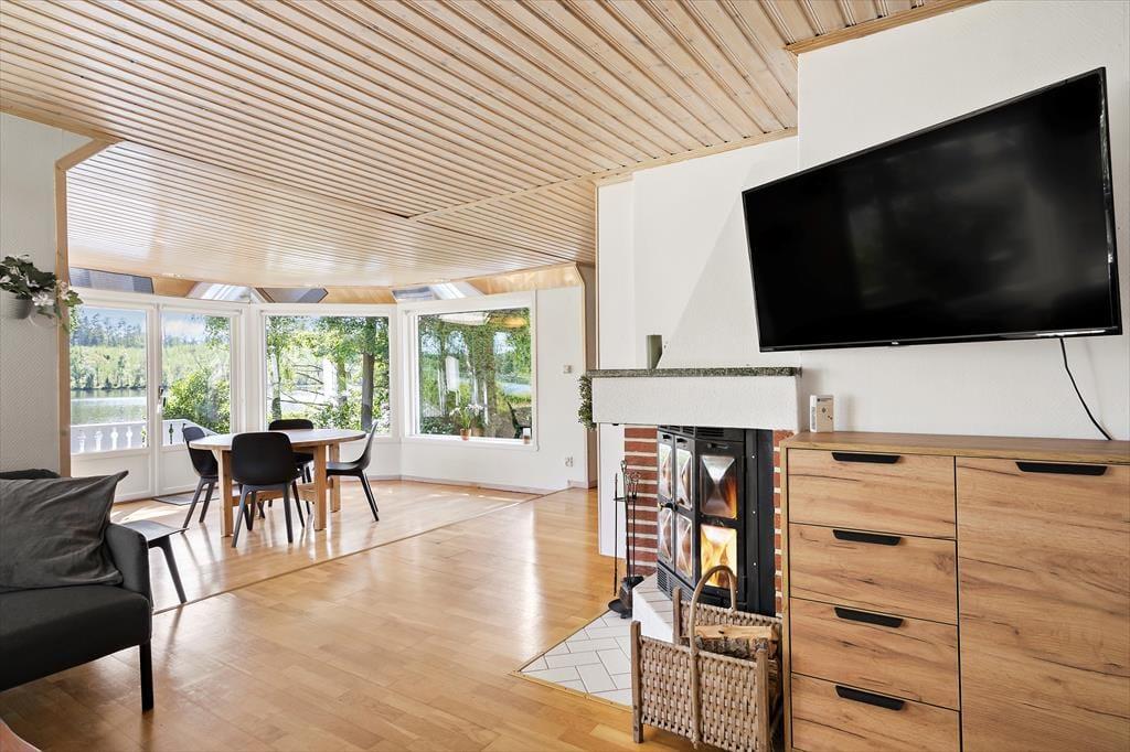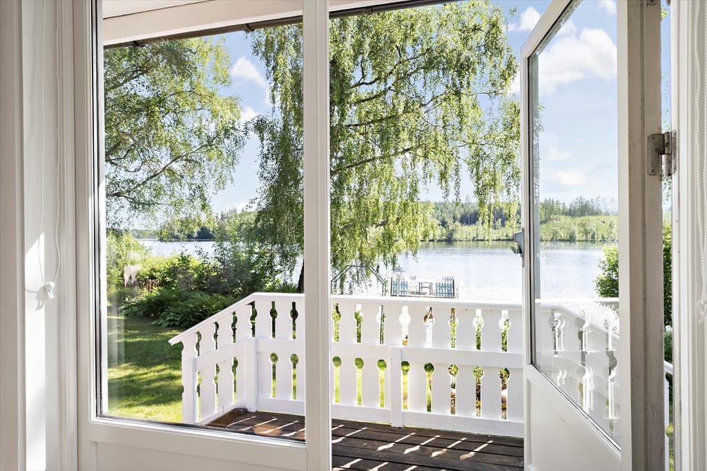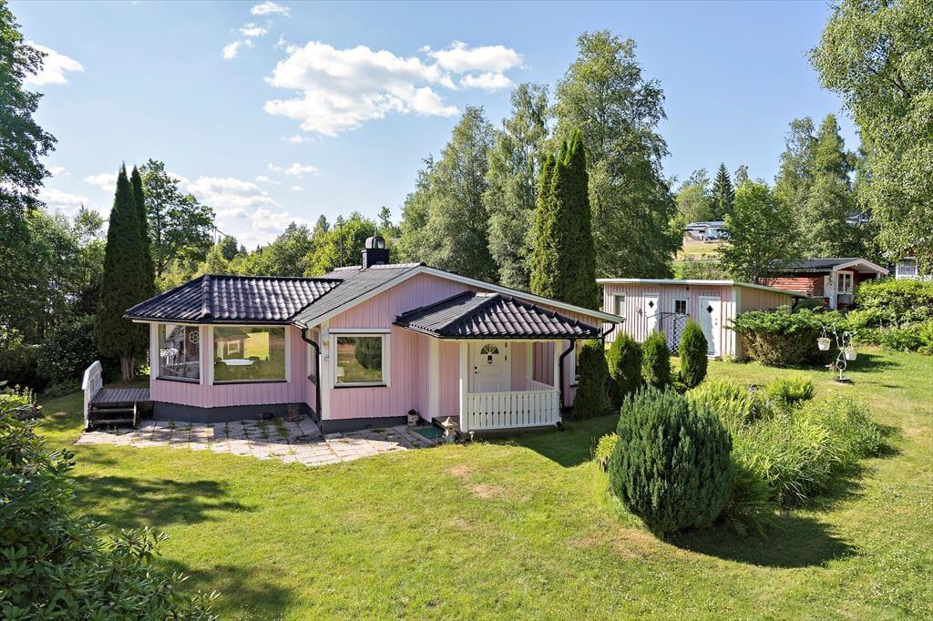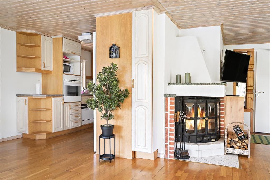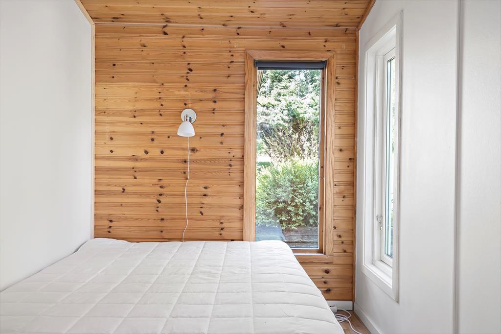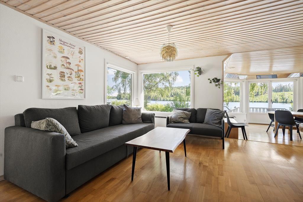 Når du træder ind i det ca. 70 m² store sommerhus, bliver du mødt af en åben stue med to sofaer, brændeovn og et tv, hvor du kan caste fra din mobil, tablet eller computer, ved at logge på wifi’et. Når du går længere ind, kommer du til spisestuen, hvor der er store vinduer med udsigt ud over søen, så du også kan sidde indenfor og nyde udsigten. I køkkenet findes der en ovn, 2 kogeplader, en lille opvaskemaskine, mikroovn, kaffemaskine, elkedel og de ellers nødvendige ting som findes i et køkken. I huset er der 2 soveværelser med henholdsvis 1 køjeseng i det ene værelse og et dobbeltseng (140 cm bred) i det andet værelse. Derudover er der mulighed for at slå sovesofaen (som bliver til en 140 cm bred seng) ud inde i stuen, så der yderligere kommer 2 sovepladser. Derudover er der i annekset 2 sovepladser som er 2 enkeltmandssenge (80 cm brede). Der er et toilet i huset med håndvask. Ved siden af er der et større rum, hvor der er sauna og et brusebad. Huset har koldt og varmt vand og kan opvarmes elektrisk eller med brændeovnen. Udenfor finder du en lille overdækket terrasse med bord og stole, hvor man kan sidde om aften og nyde udsigten over søen. Derudover er der gratis internet, en robåd og en grillhytte / grillstuga på grunden samt udendørs bålsted, hvor der kan grilles.