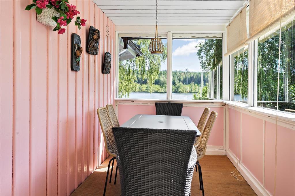 Vest for den lille landsby Ambjörnarp, ligger sommerhuset Villa Rosa, ned til den skønne sø Visen, som forgrener sig i halvøer og bugter. Fra huset og haven har man en flot og idyllisk udsigt over søen. Huset har egen båd- og badebro, som byder på alle forudsætninger for en dejlig fiske- og badeferie. Intet mindre end 100 meter fra huset er der en stor skov, med muligheder for gåture i den smukke natur, hvor der kan samles svampe om efteråret, og hvis du er rigtig heldig, kan du se en elg. Omkring 10 km fra sommerhuset ligger der to lidt større byer Tranemo og Svenljunga, hvor du har gode muligheder for at handle, bestille takeaway, spise på café/restaurant og gå ned ad den lille gågade i byerne. Hos Tranemo og Svenljunga kommune kan du finde turistinformation om alle de udflugter og aktiviteter man kan prøve. Hvis du er til de lidt større byer, så ligger Jönköping kun en times kørsel fra sommerhuset, hvor der er masser at opleve og her kan man desuden se den store sø Vättern.