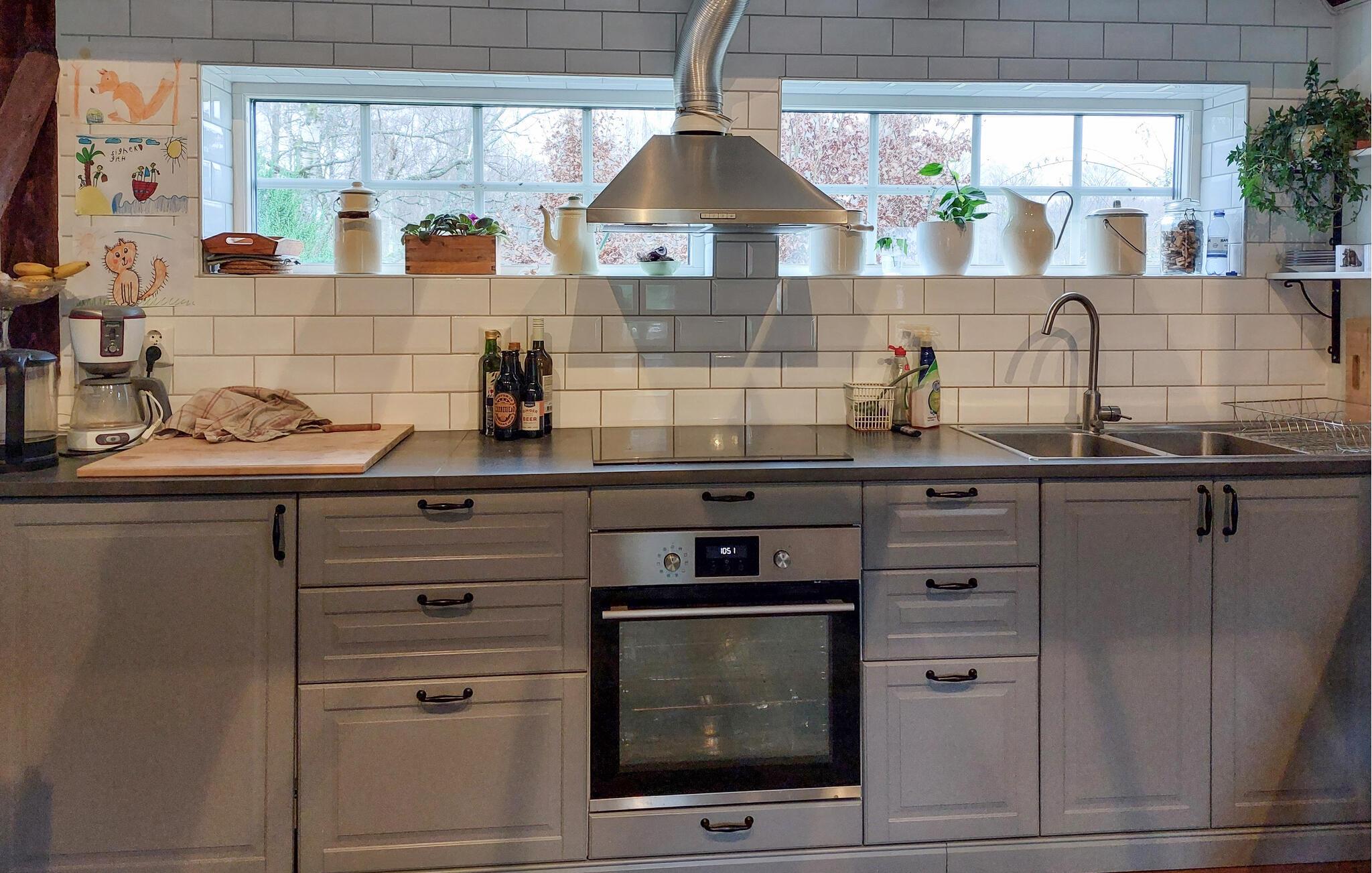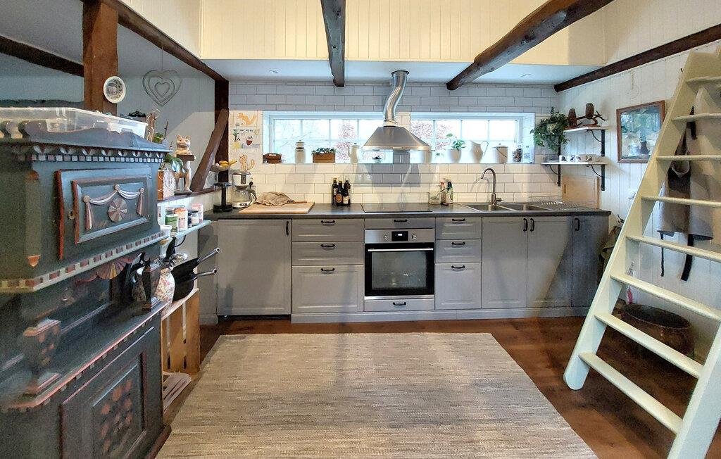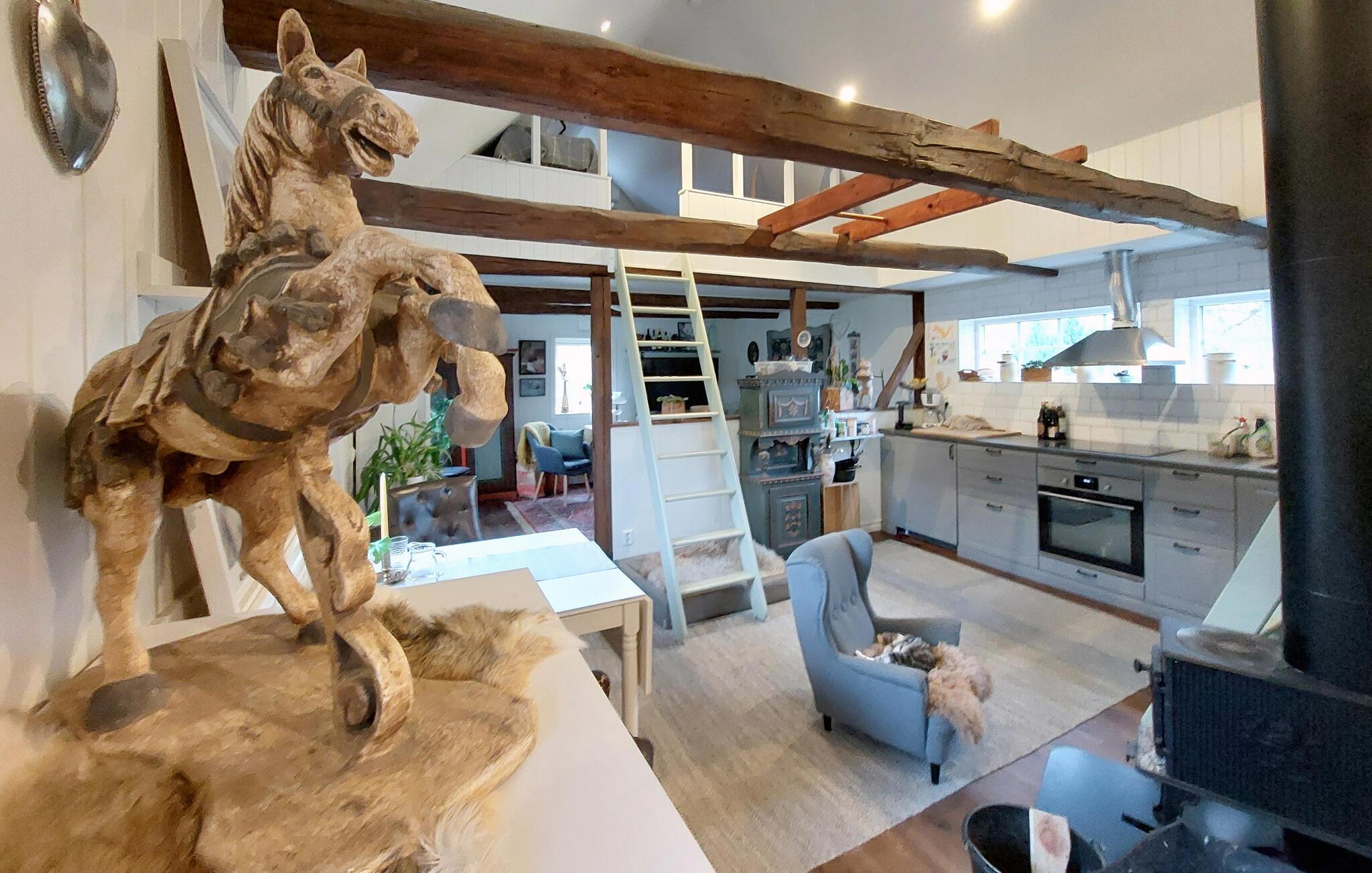 Dette velrenoverede feriehus byder jer velkommen til en fungerende gård med dyr og haren dejlig blanding af rustik charme og moderne komfort. Tilbered lækre måltider, nyd harmonisk spisning i den åbne stue og glæd jer til sjove spilleaftener eller rolige læsestunder, mens den norske brændeovn bidrager til den hyggelige atmosfære.