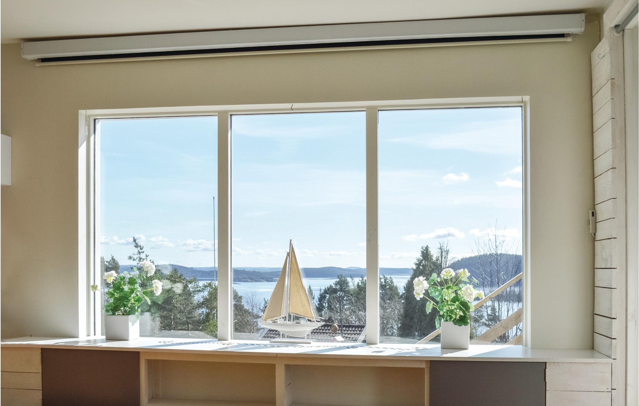 Dette feriehus ligger højt og flot med fantastisk panoramaudsigt til Byfjorden med glittrende hav og grønne øer.