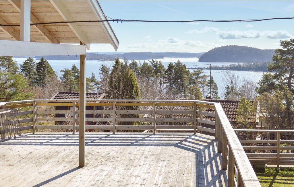 På husets store terrasse kan I nyde dagens måltider og den skønne udsigt. Ved siden af terrassen er der en lille plæne med legeredskaber til børnene. I stuens alrum med store vinduer mod fjorden er der et flot lys. Husets kamin er kun til pynt.