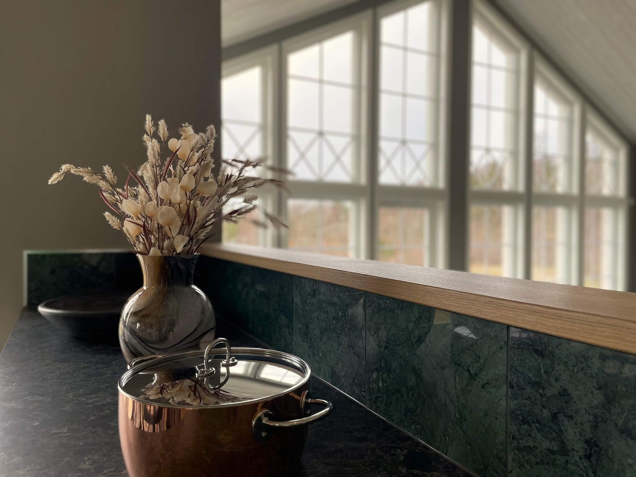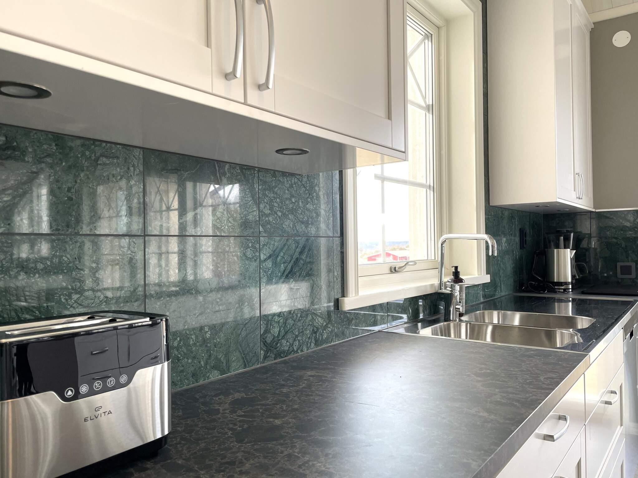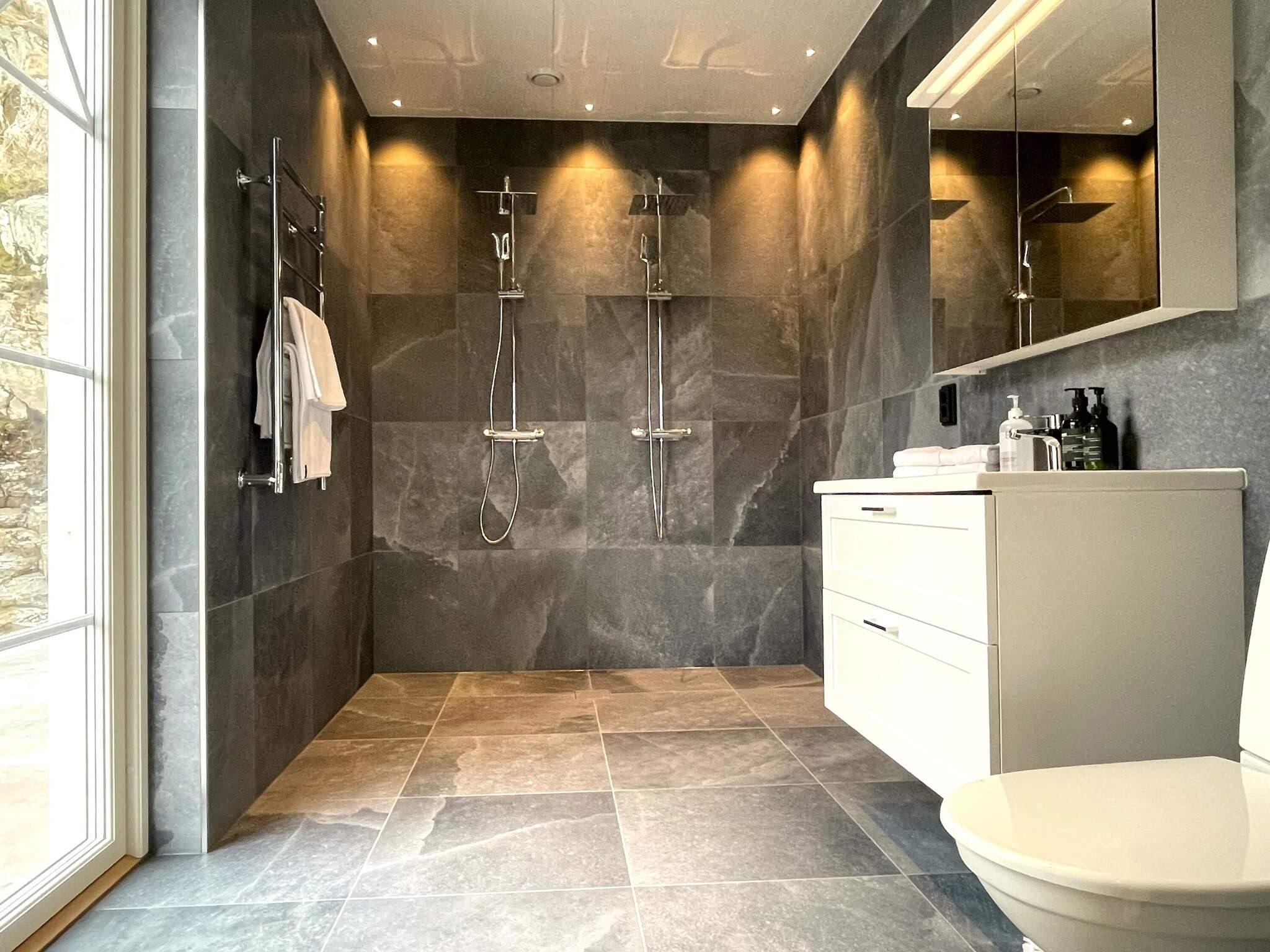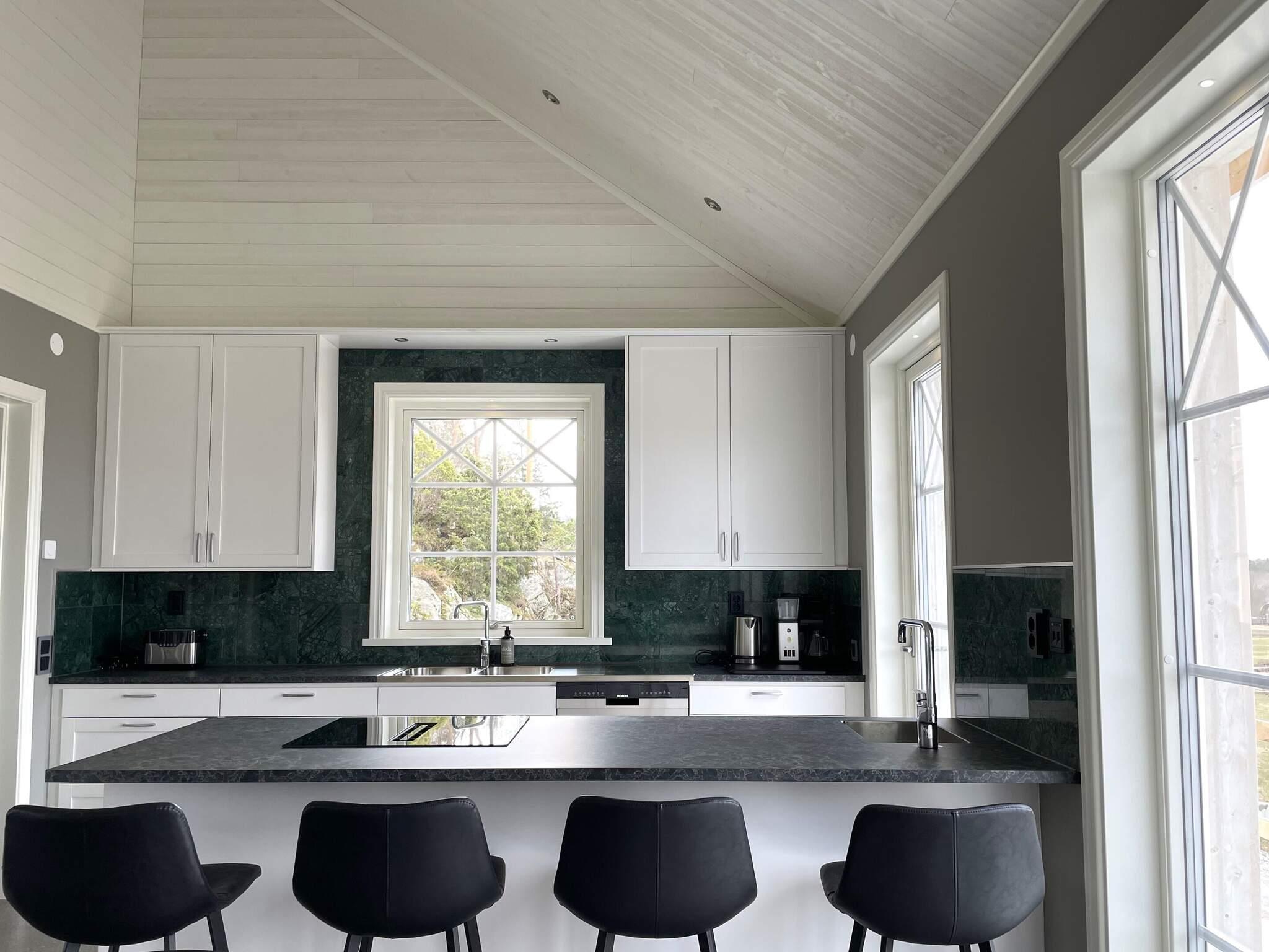 Du välkomnas med stor altan runt huset och ingången är på baksidan av huset. Du kommer in i en ljus och stor entré. Allt är smakfullt och stilrent med fin inredning. Rakt fram ser du vardagsrummet med havet som kuliss. Till höger finns husets ena badrum med wc/handfat och dusch. Badrummet är ljus med mycket god standard. Vardagsrummet är en trappavsats ner men härliga ytor för sällskap och umgänge. Det finns en braskamin sm sprakar gott på årets kalla dagar. Köket är öppet och ljust och med fina ytor för middagar. Här saknas det inget och du har två diskbänkar, marmor och rejäla vitvaror. Allt är toppmodernt, induktionshäll, kyl/frys med mera.