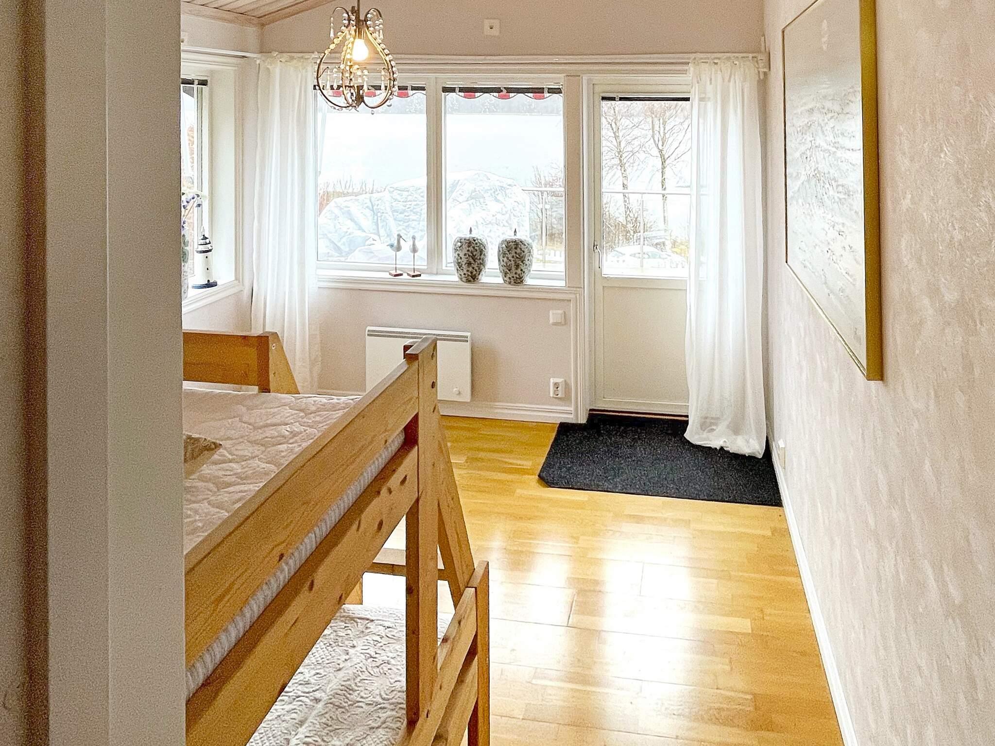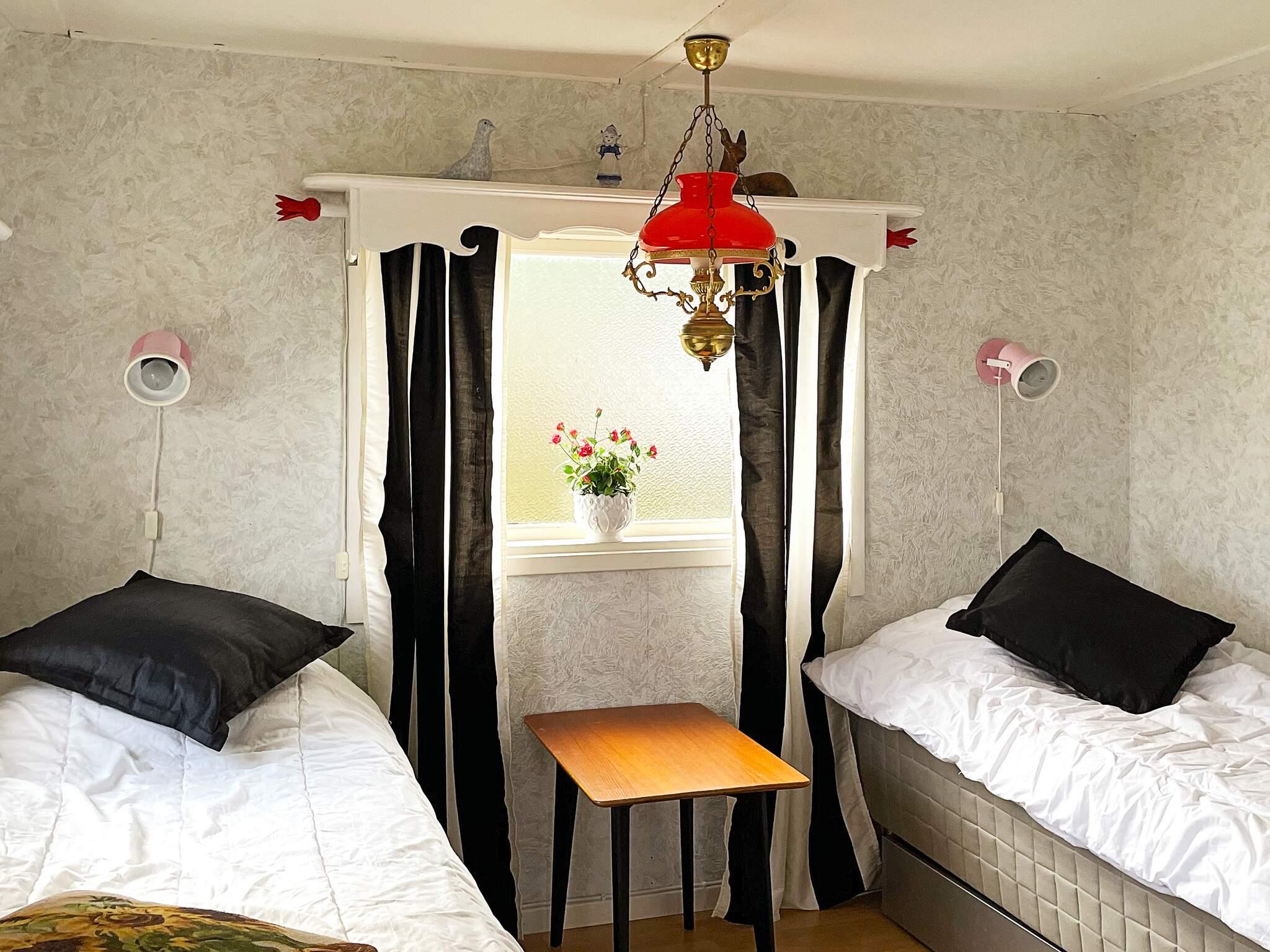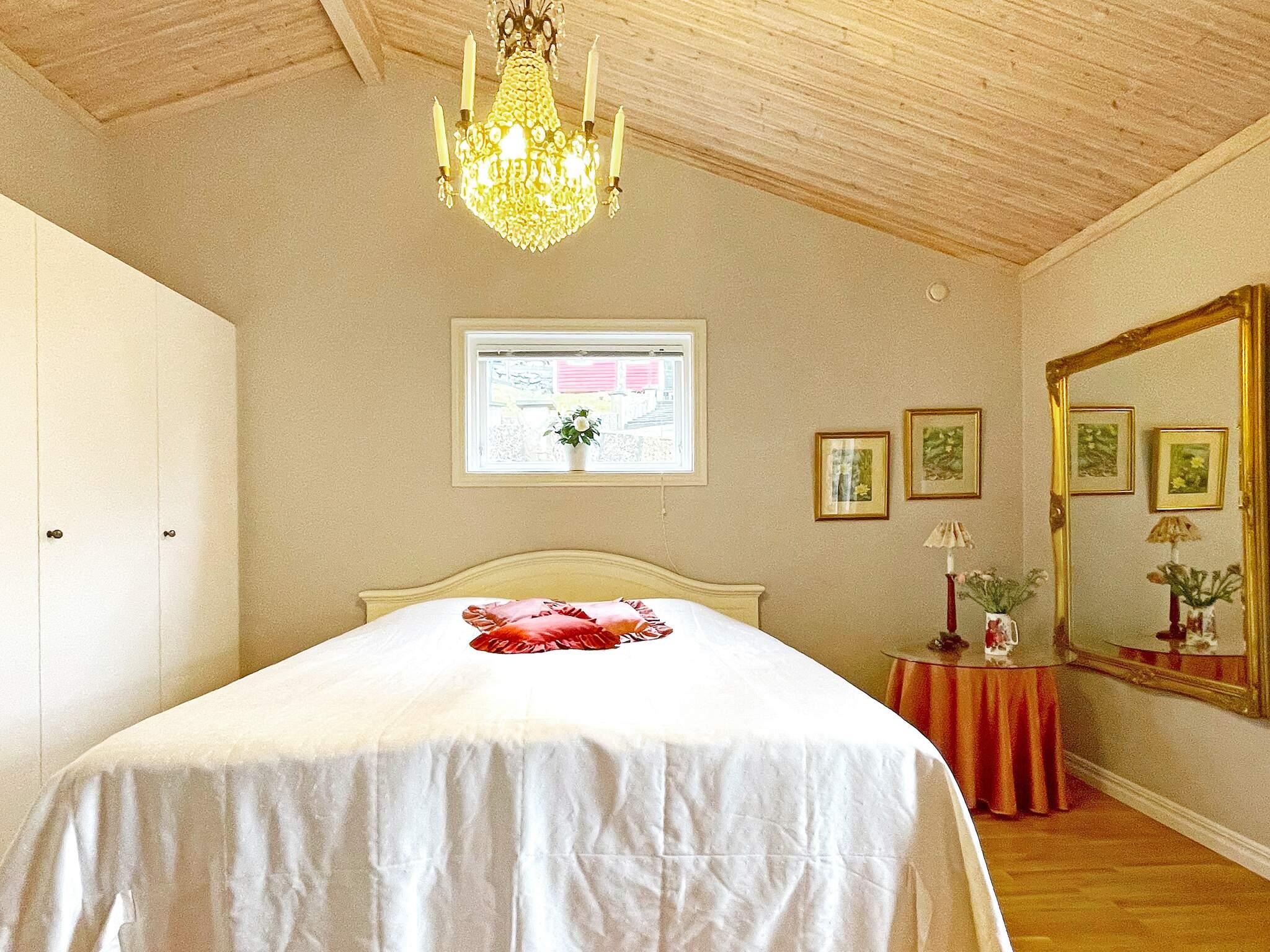 Rakt fram ligger husets ena sovrum. Det är ett mycket trevligt sovrum med en dubbelsäng. Via en liten trappavsats kommer man till rummet nedanför med ytterligare 2-3 sängplatser. Här finns en våningssäng med 90 cm övre delen och 120 cm bred nedre. Från detta sovrum finns en dörr till altanen med den vackra havsutsikten.