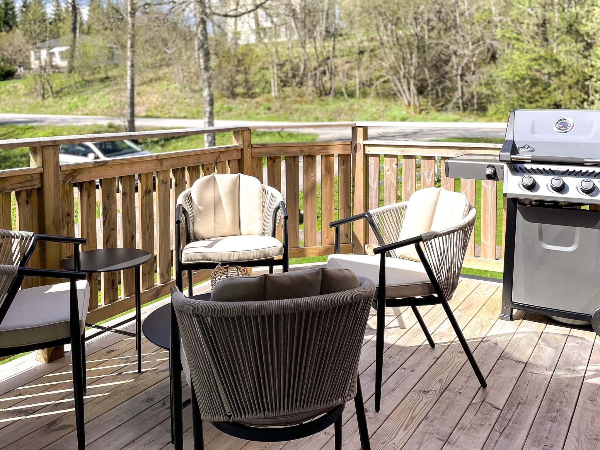 Huset har tre stilfullt utformade terrassområden, som är harmoniskt grupperade runt vardagsrummet och erbjuder en speciell plats när som helst på dygnet. I direkt anslutning till matplatsen finns en stor, inglasad vinterträdgård vars glasytor kan öppnas helt och hållet, vilket skapar ett luftigt utrymme som nästan blir ett med naturen på sommaren. Till höger ligger en öppen träterrass med sittplatser av hög kvalitet och en gasolgrill - perfekt för mysiga kvällar eller ett glas vin i solnedgången.