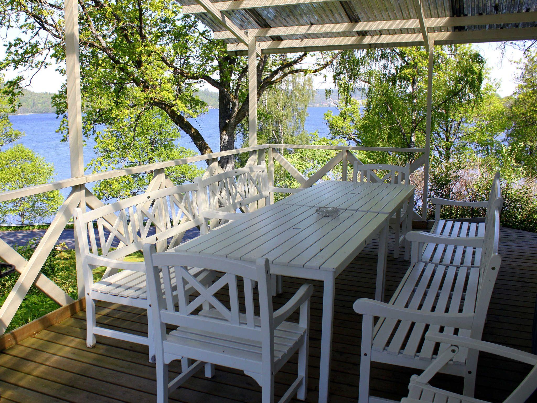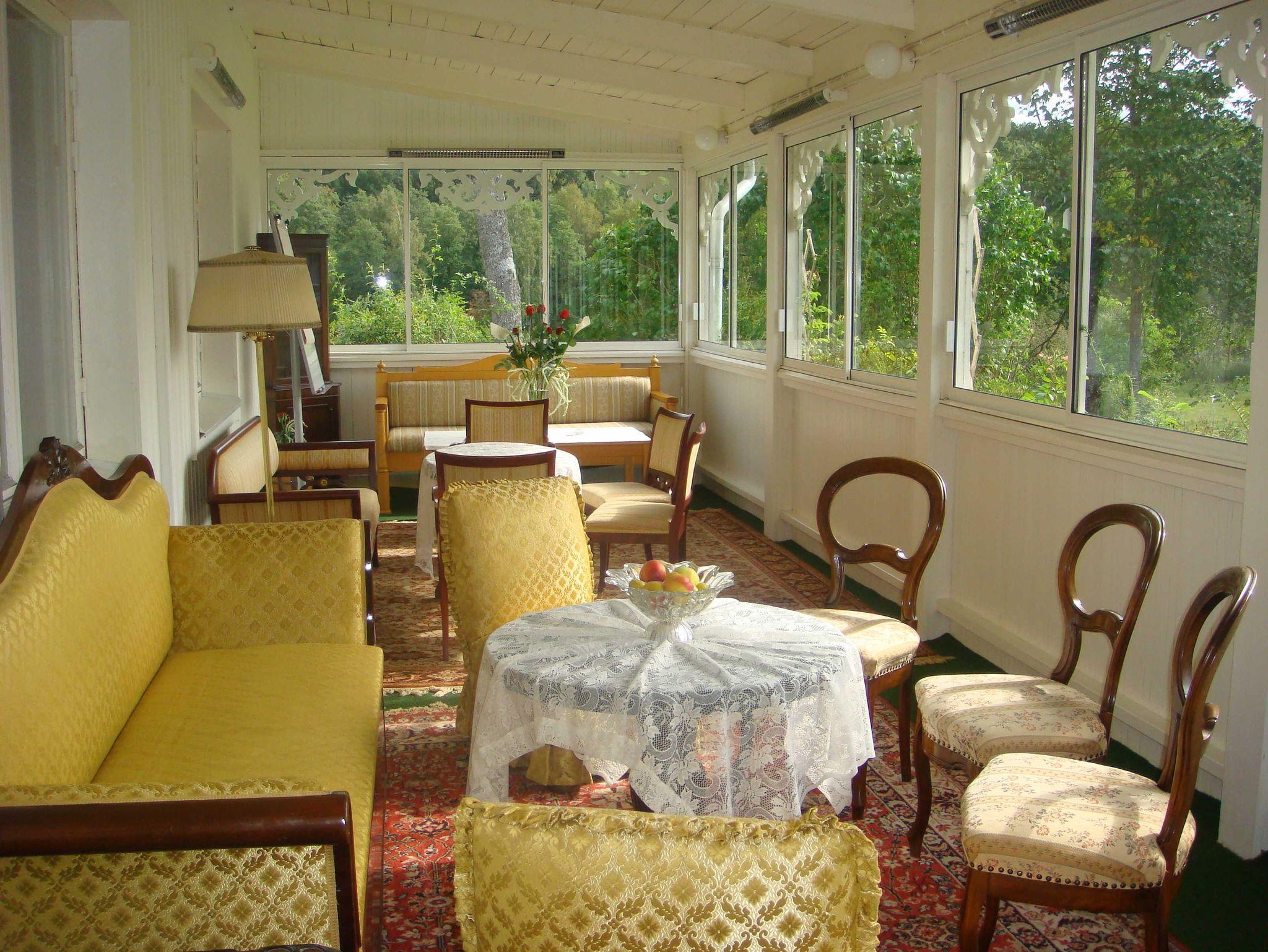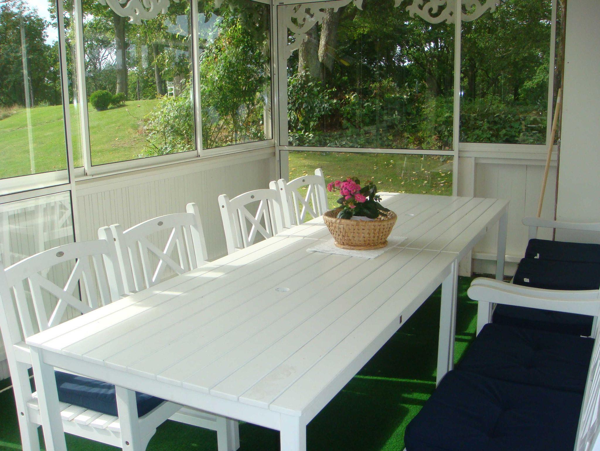 Der große Wintergarten ist mit verschiedenen Sitzgruppen sowie einer weiteren Essgruppe ausgestattet. Die überdachte Terrasse bietet einen wunderbaren Blick auf den See.