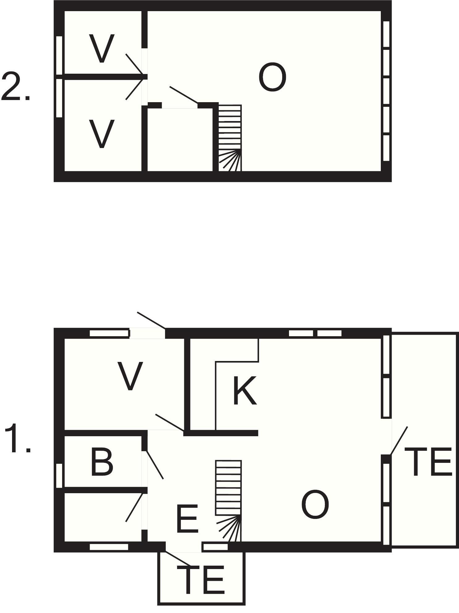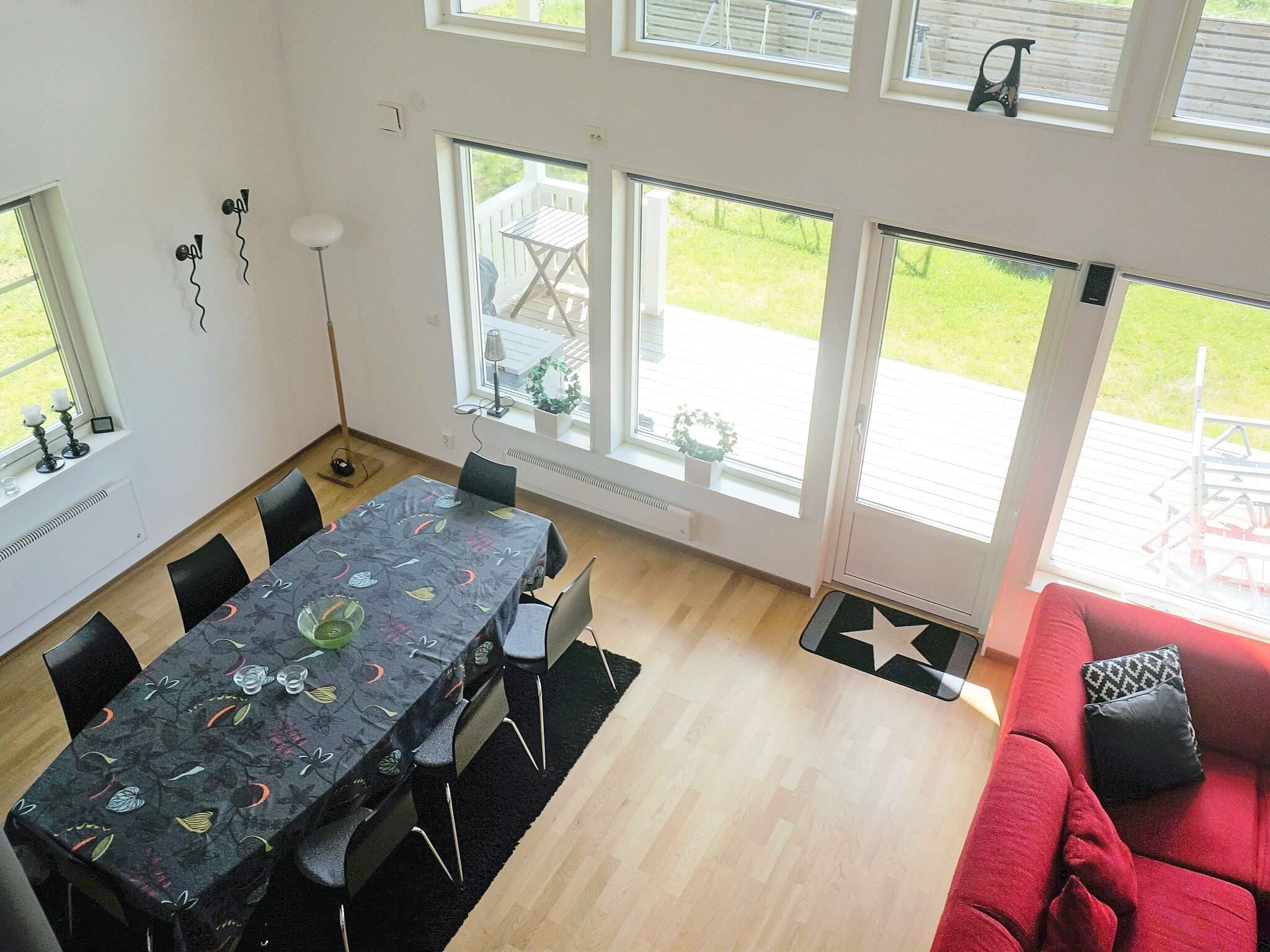 Köket är integrerat med vardagsrummet. Vitt, ljus och välplanerat. Stort och rymligt vardagsrum med soffa,tv och en mysig braskamin. Här finns utgång till altanen med utemöbler och grill. Till höger från entrén går en trappa upp till andra våningen. Där finns ett litet allrum, som är perfekt för barnen att sitta och leka. Här uppe finns två sovrum med en dubbelsäng 160 cm i varje rum. I klädkammaren häruppe finns tex en extramadrass och barnstol.