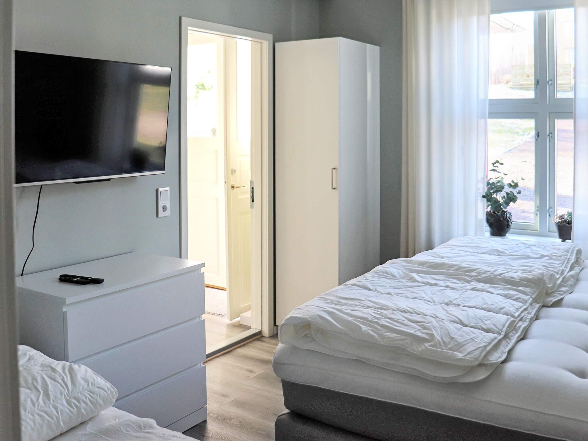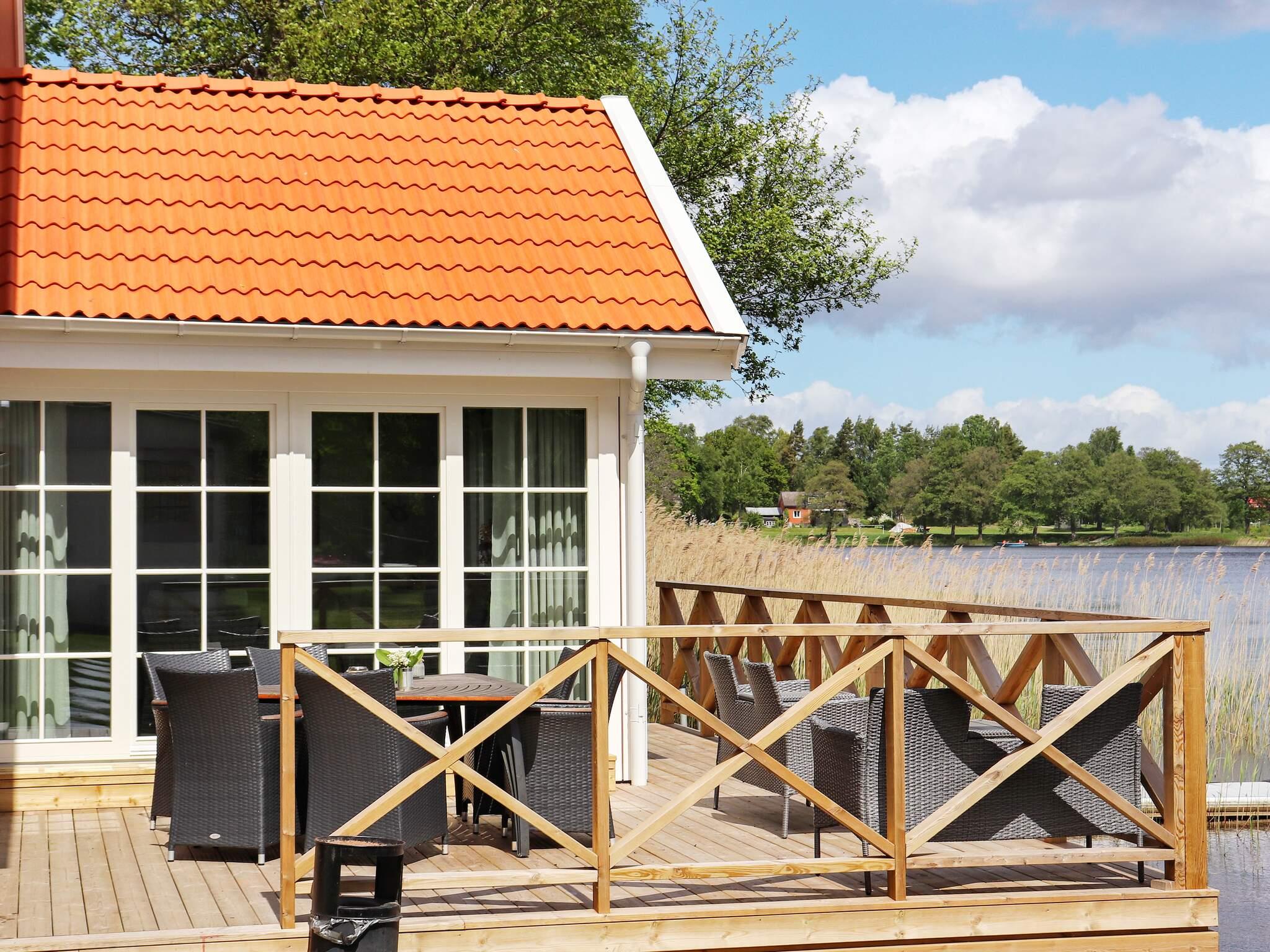Entrén till huset är genom en vacker glasveranda. Bottenvåningen har två sovrum med fyra respektive tre bäddar. Mot sjön finns ett modernt öppet kök och en stor härlig matplats. Ett inglasat uterum med bekväma loungemöbler stor modern TV och en härlig utsikt över sjön. På terrassen kan ni nästan doppa fötterna i vattnet. En trappa upp finns ytterligare två sovrum. Ett med fyra bäddar och ett med tre bäddar och utsikt över sjön. Till samtliga sovrum finns ett badrum med dusch och en vägg TV. I hela huset finns bredband och gratis wifi. Det finns en tvättstuga med extra wc. Finns även en barnstol att tillgå.