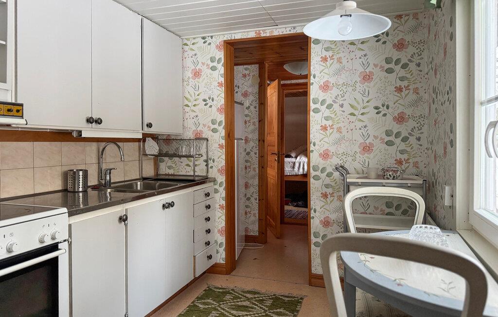 Gør det behageligt i sofaen i den charmerende stue og nyd fredelige timer med udsigt over de grønne områder gennem vinduerne. Møblerne er både funktionelle og hyggelige, så I hurtigt vil føle jer hjemme. Brug spiseområdet til fælles måltider eller en spilleaften, det store bord tilbyder masser af plads. Tilbered jeres måltider i det praktiske køkken og nyd jeres fritid i en landlig atmosfære.