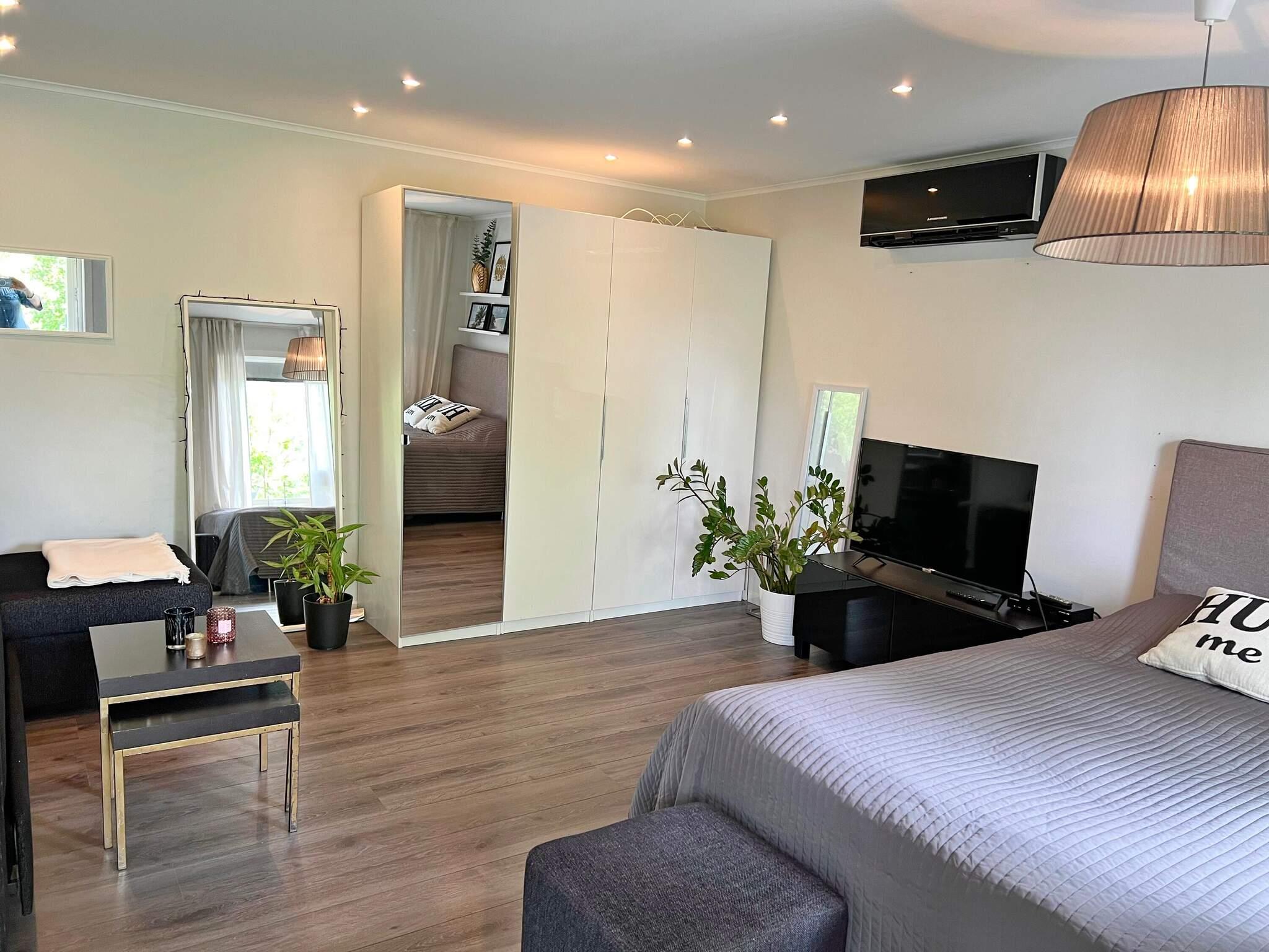 Huset är modernt inrett, det är byggt 2013, har ett separat sovrum med två sängar som kan sättas ihop till en dubbel, vardagsrummet har en dubbelsäng och en bäddsoffa. Vardagsrummet har dörr ut till den fina altanen som är byggd i terrasser så man kan sitta på trappstegen med sin kaffekopp på morgonen, eller vid bordet om man föredrar det.