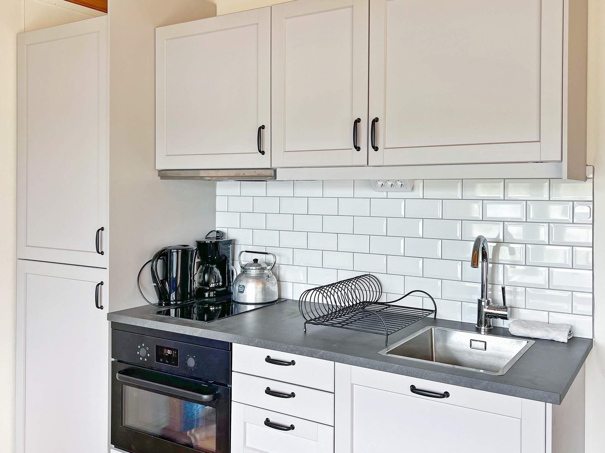 Køkken: Høj stol, el-komfur, ovn, køle-frys, mikroovn, kaffemaskine