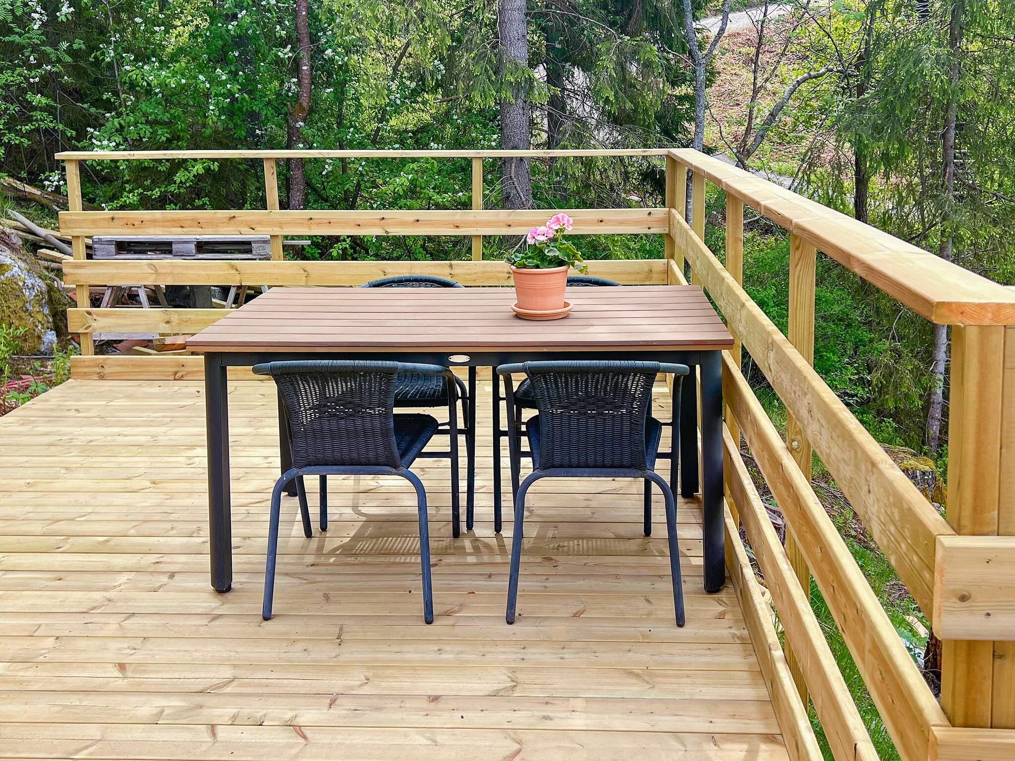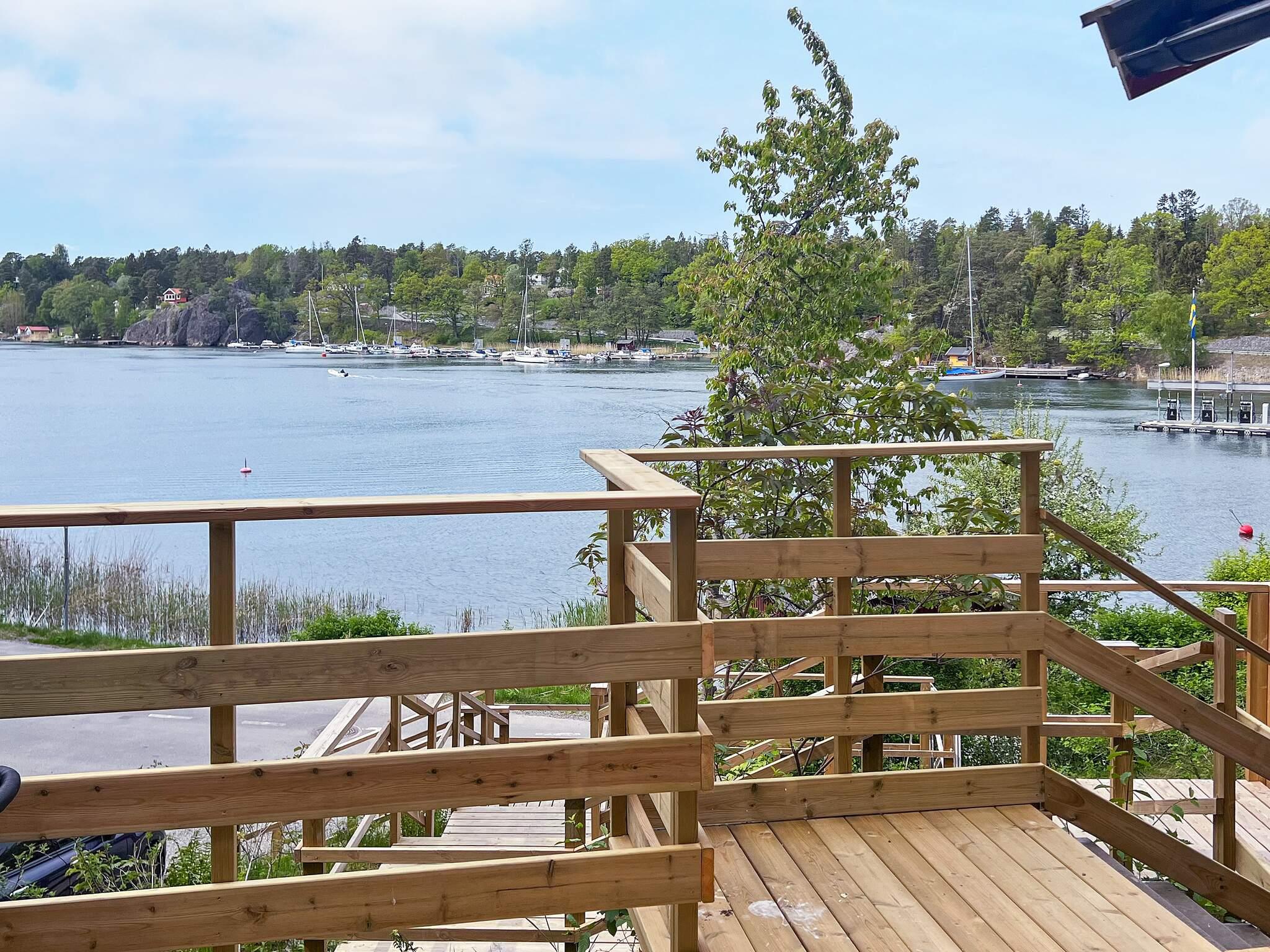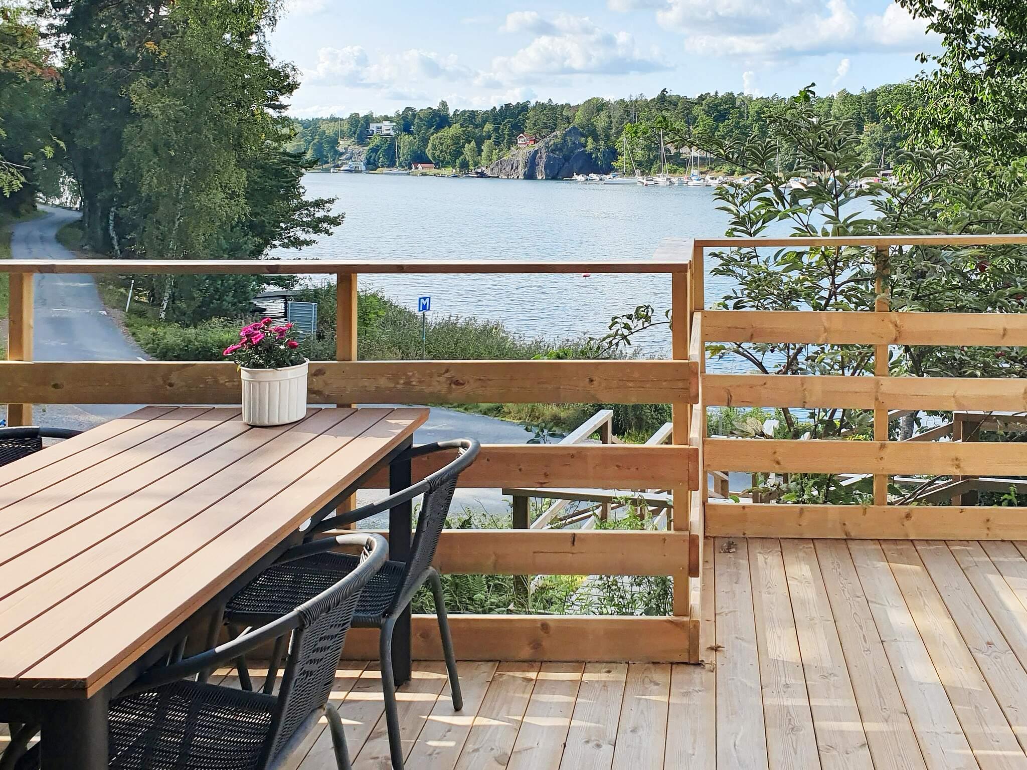 Vardagsrummet/köket har matbord med fyra stolar, på altanen finns också ett matbord för fyra. En elgrill finns på altanen. Tomten har skogen inpå knuten och där huserar både älgar och rådjur då och då. Vill ni plocka blåbär är det bara att gå upp bakom huset. Strömma kanal är en smal gammal kanal som går mellan Fågebrolandet och Värmdö och här slussar båtar för att snabbt komma ut på Nämdöfjärden. Det är trevligt att sitta på altanen i kvällningen och titta på båtarna som passerar förbi.