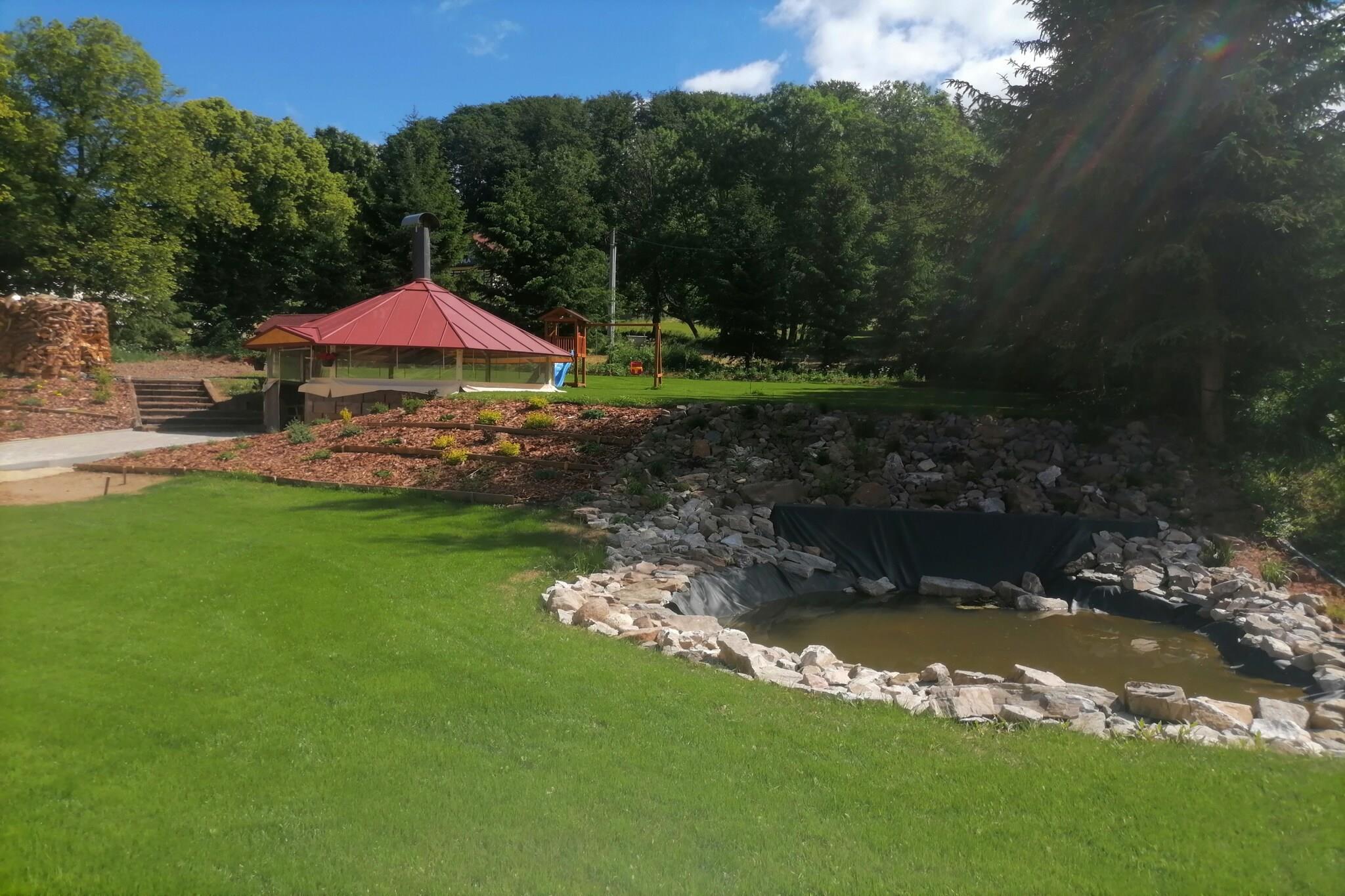 Denne rummelige villa, ideel til grupper eller familier, kan rumme op til 17 personer med ni soveværelser og ni badeværelser. Hvert værelse er udstyret med bruser og toilet, hvilket giver privatliv og komfort for alle gæster. Villaen er blevet fuldstændig renoveret i 2021 og indeholder moderne faciliteter såsom sauna, vaskerum med vaskemaskine og tørretumbler, skirum og cykelskur. Fire veludstyrede køkkener, hvoraf to har opvaskemaskine, sørger for bekvemmelighed under måltidstilberedning. En hyggelig stue med pejs og tv giver et behageligt sted at slappe af efter en travl dag. Beliggende i en stille landsbydal nær Žaclér, er villaen en fremragende base for udendørs aktiviteter. De omkringliggende Giant Mountains byder på attraktioner året rundt. Vandreentusiaster kan bestige Snežka, den højeste top i Tjekkiet, mens naturelskere kan udforske de fantastiske Adršpašsko-Teplické-klipper. Trætopstien i Janské Lázne giver en betagende udsigt fra oven. Om vinteren tilbyder nærliggende skisportssteder såsom Prkenny Dul og Skisportsstedet Pec forskellige pister til skiløb og snowboarding, hvilket gør denne villa til en perfekt vinterferie. Udenfor kan gæsterne nyde en rummelig have med overdækket havepavillon og grillplads, perfekt til udendørs sammenkomster. For børn er der en rutsjebane, sandkasse og masser af græsplæneplads til at lege. Efter en dag med udforskning kan gæsterne slappe af i saunaen eller samles ved pejsen til en hyggelig aften. Det mobile ølhanesystem tilføjer et ekstra strejf af sjov for dem, der ønsker at nyde en forfriskende drink i villaens komfort.