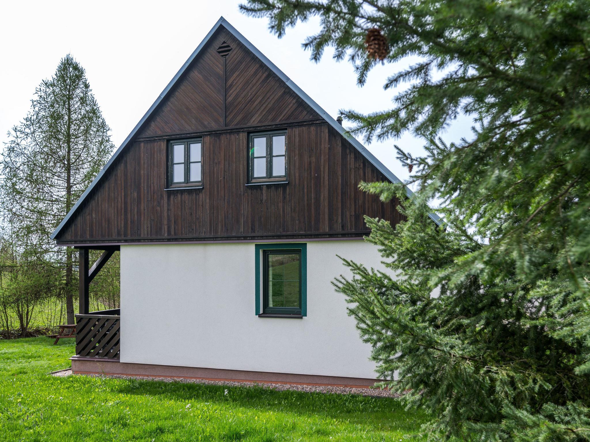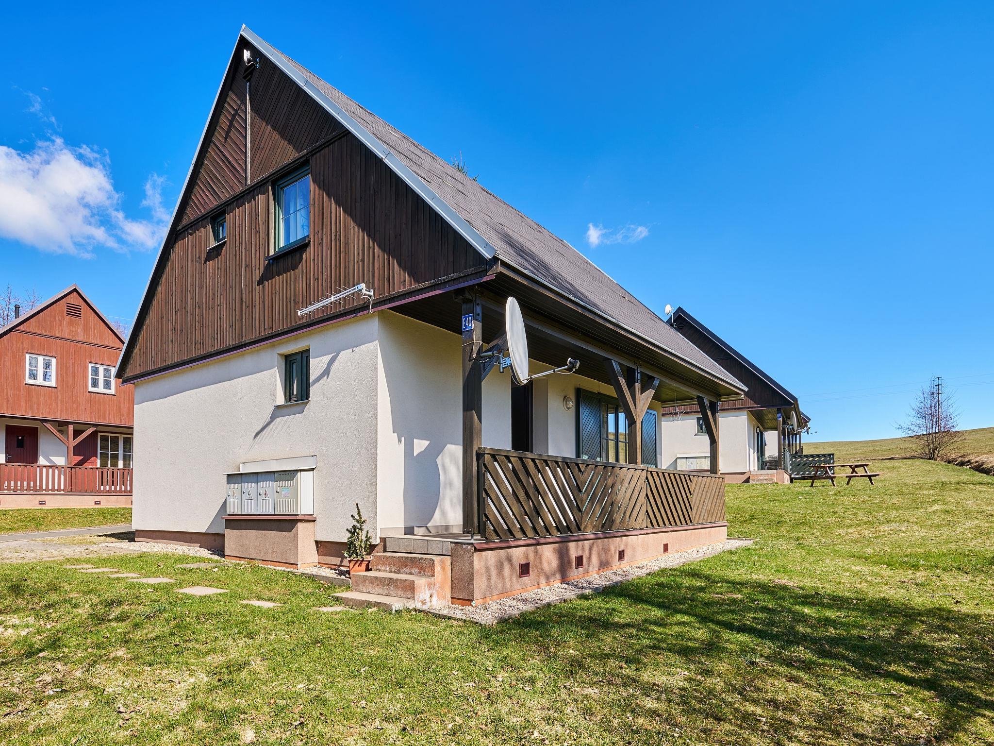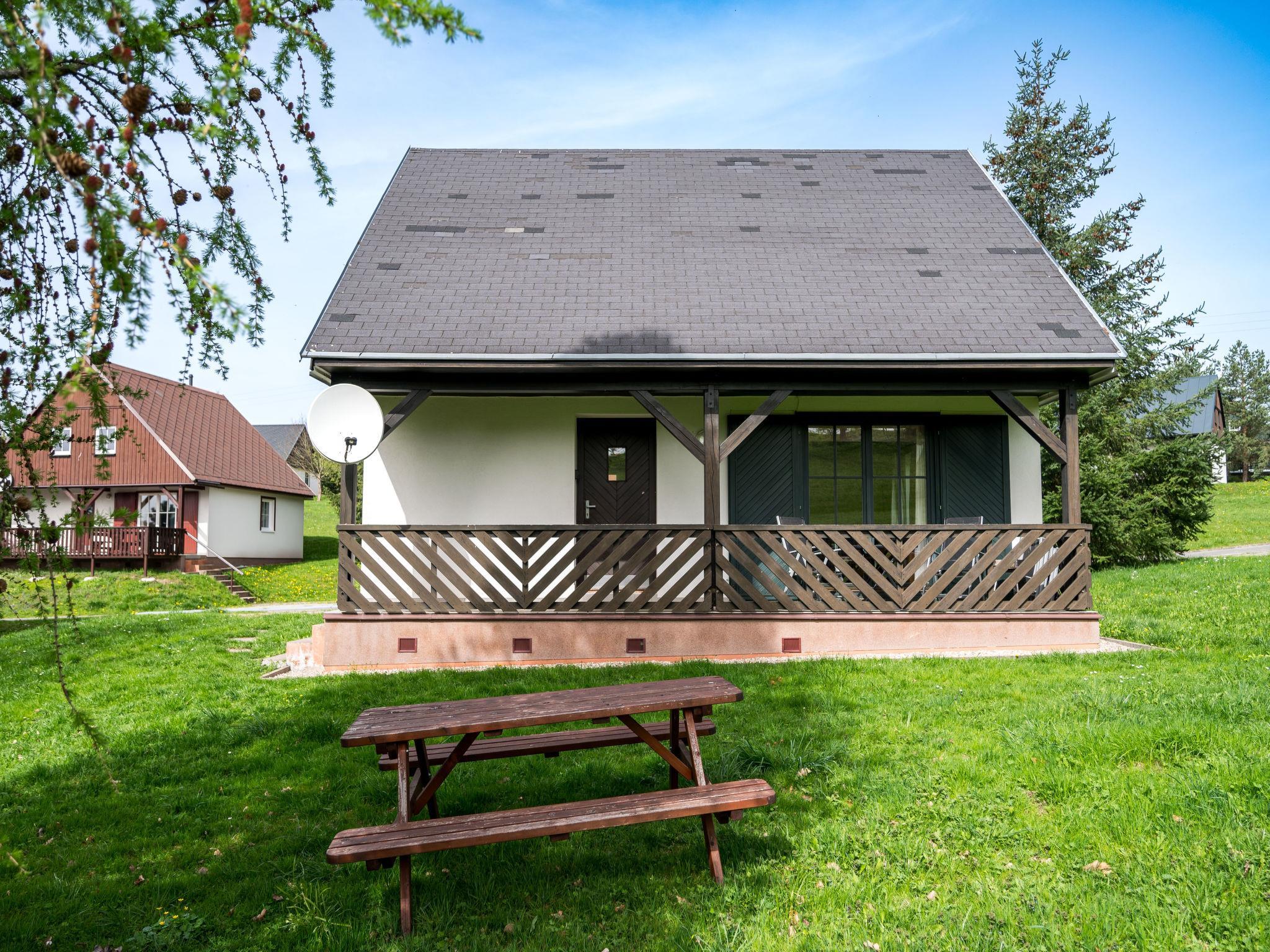 Cistá v Krkonoších 2 km from Cerný Dul: Child friendly, beautiful, comfortable holiday village "Holiday Hill 40", 500 m a.s.l., surrounded by trees and meadows. 43 houses in the resort. On the outskirts, in a secluded, quiet, sunny position, 1.5 km from the lake, 3 km from the skiing area, in the countryside. For shared use: property 6 ha, meadow, swimming pool heated (9 x 4 m, depth 120 cm, seasonal availability: 15.May. - 30.Sep. pool opening hours: 09:00-20:00). Shower/WC in the pool area, table tennis, children's playground (swing). In the complex: reception, central heating system. Parking (for 2 cars) at the house. Shop 2.5 km, grocery 2.5 km, supermarket 7.5 km, restaurant 1.6 km, pub garden 400 m, bus stop "Cerný Dul, Cistá-pošta" 400 m, grass beach 1.5 km (small), indoor swimming pool 19 km. Golf course (18 hole) 14 km, tennis 2.5 km, sports centre 2.5 km, walking paths from the house 100 m, cycle lane, ski lift 3 km, chair lift 3 km, slopes 3 km, ski school 3 km, children's ski school 3 km, sled run 7 km, cross country ski track 100 m. Nearby attractions: Janské Lázne Spa 9 km, Vrchlabí 10 km, Aquapark Trutnov 25 km, Zoo Safari Dvur Králové 29 km, Bozkovské jeskyne 37 km, Adršpašské skály 44 km. Well-known ski regions can easily be reached: Cerný Dul 3 km, Herlíkovice 15 km, Pec pod Snežkou 22 km. Well-known lakes can easily be reached: Cistá 1.5 km, Vrchlabí 9 km. Hiking paths: Snežka 25 km.