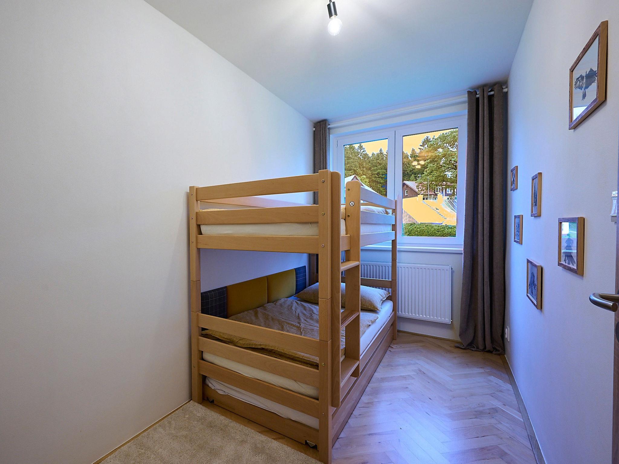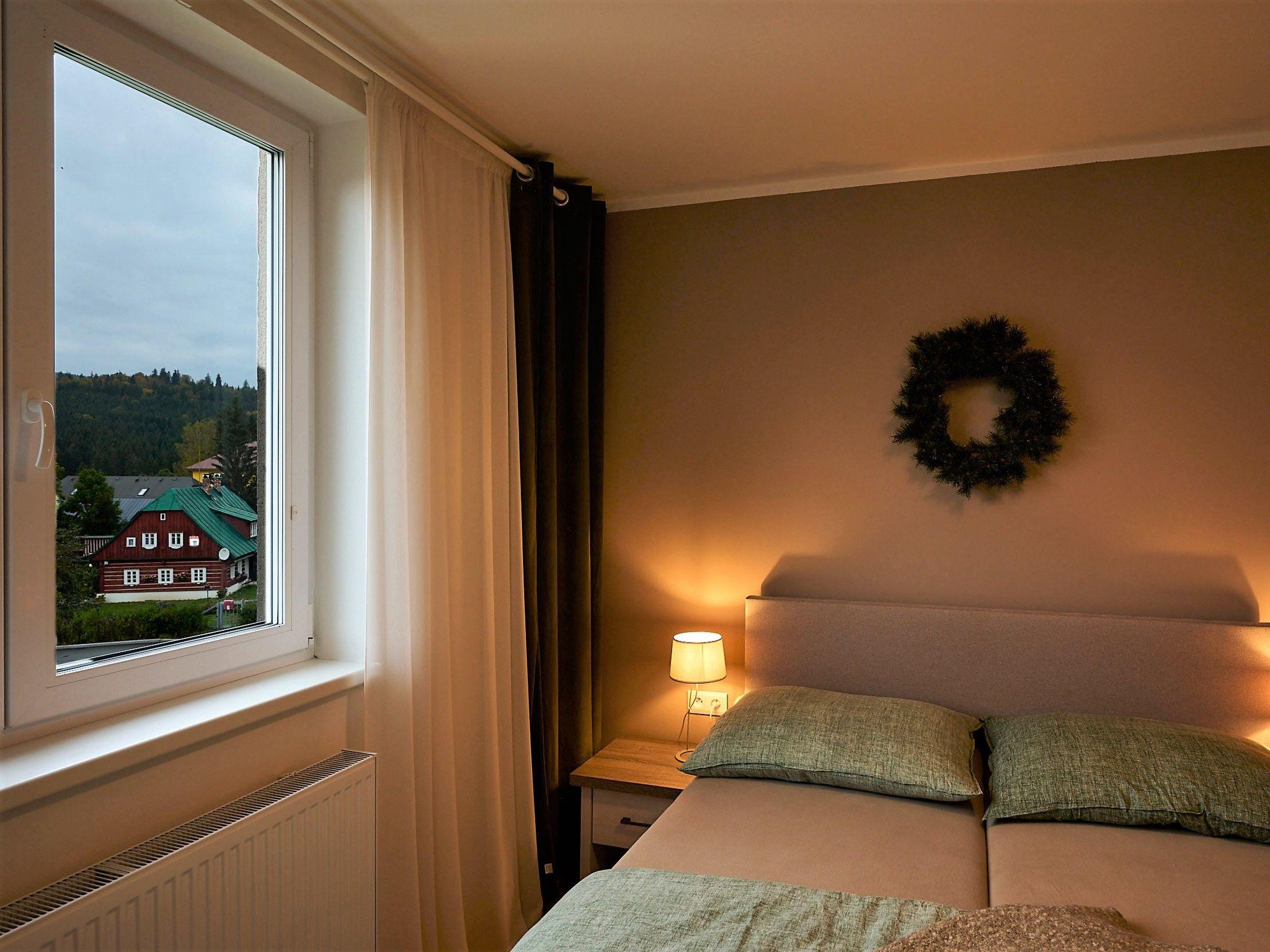 "Cozy Family Getaway", 3-room apartment 65 m2. Renovated in 2022, modern furnishings: 1 room with 1 double bed (160 cm, length 200 cm). 1 room with 1 x 1 bunk beds, 1 pull-out bed. Living room with 1 sofabed and TV. Exit to the balcony. Kitchen (oven, dishwasher, 4 induction hot plates, kettle, freezer, electric coffee machine, Capsules for coffee machine (Dolce Gusto) extra). Shower, sep. WC. Facilities: washing machine, children's high chair. Internet (WiFi). Please note: suitable for families. Non-smokers only. Harrachov card free.