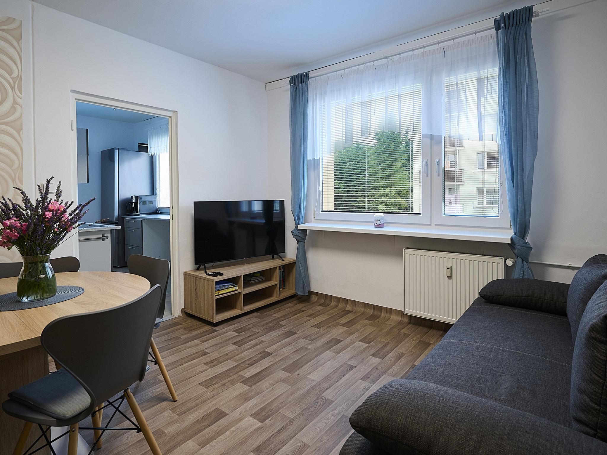 "Helena Harrachov", 2-room apartment 56 m2 on 2nd floor. Cosy furnishings: living room with 1 double sofabed and TV. 1 room with 1 x 2 bunk beds, 1 double bed. Exit to the balcony. Kitchen (dishwasher, 4 ceramic glass hob hotplates, toaster, kettle, microwave). Shower, sep. WC. Facilities: washing machine, dryer, sauna, hair dryer. Internet (WiFi, free). Please note: suitable for families. Non-smokers only.