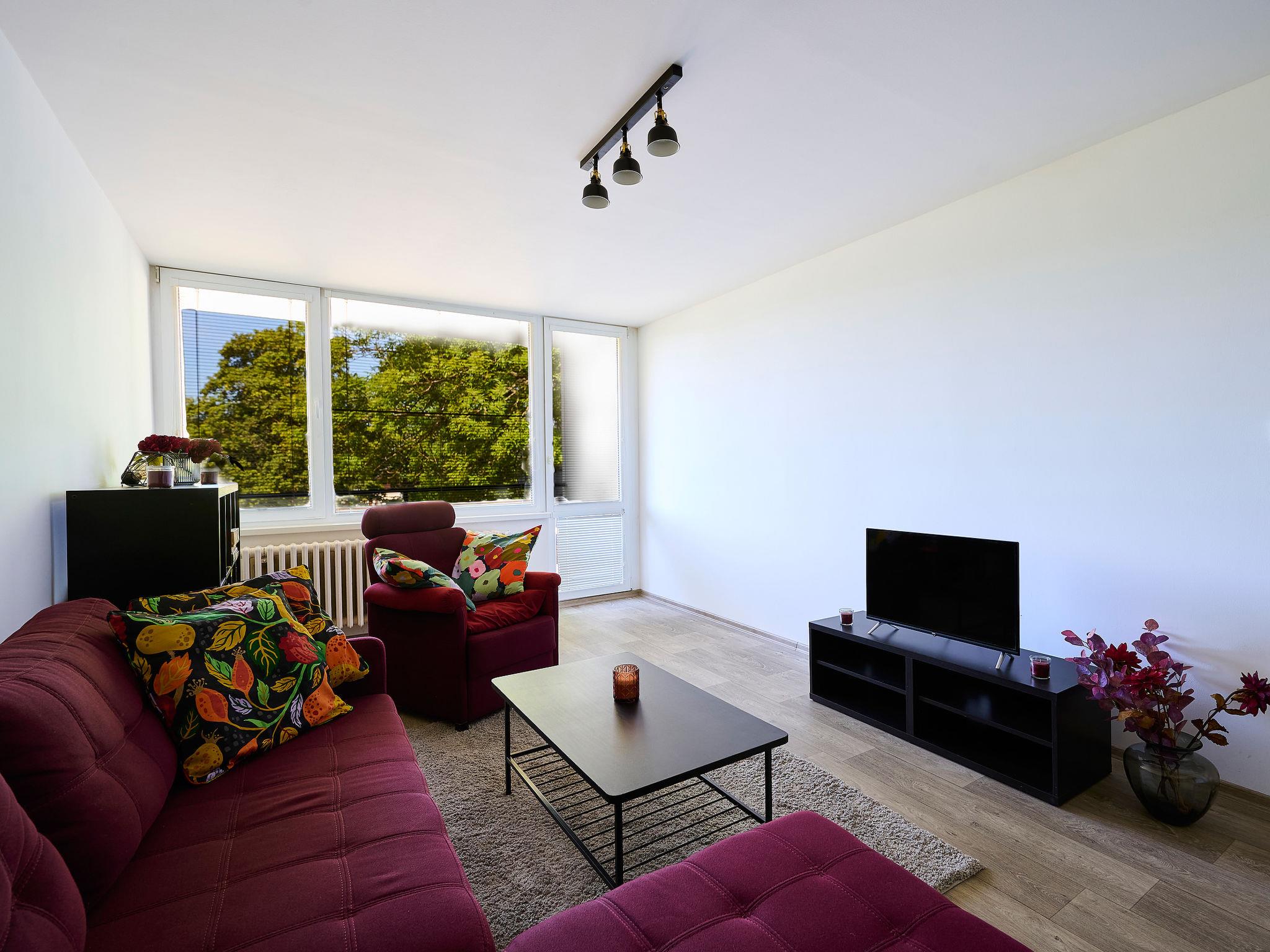 3-room apartment on 2nd floor. Spacious and bright, renovated in 2023, modern furnishings: 2 rooms, each room with 1 double bed. 1 room with TV. Exit to the balcony. Kitchen (oven, dishwasher, 4 gas rings, toaster, kettle, microwave, freezer, electric coffee machine) with dining table. Shower, sep. WC. Gas heating. Balcony furniture. View of the forest. Facilities: washing machine. Internet (WiFi, free). Parking. Please note: suitable for families. Non-smokers only. Maximum 1 pet/ dog allowed.