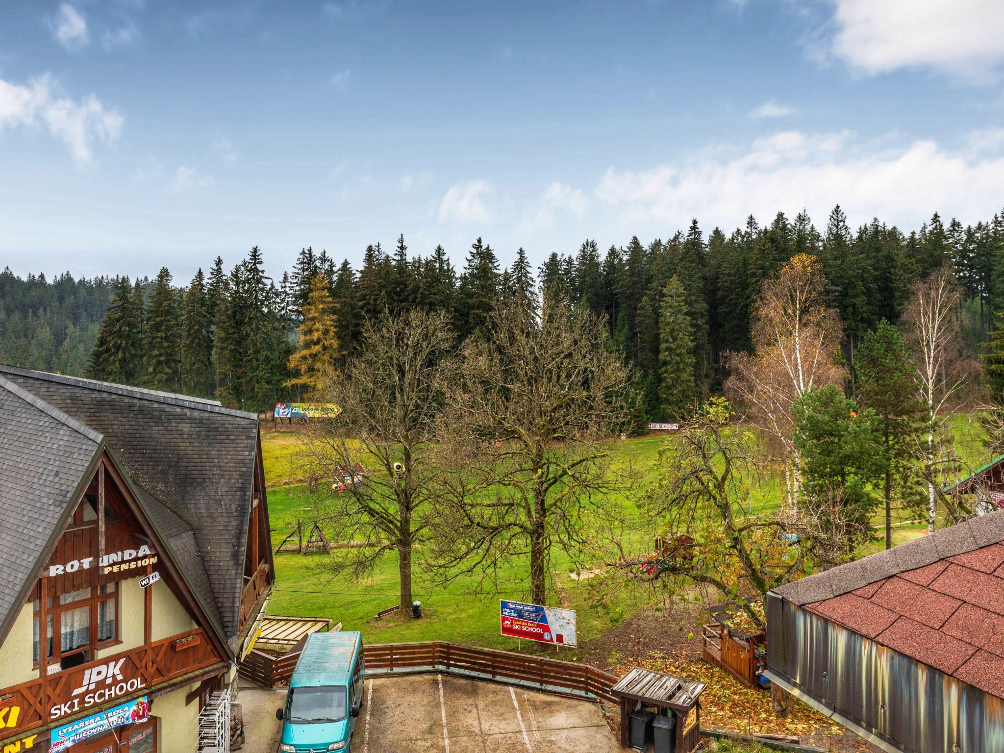 "Harrachov Central Nook", 2-room apartment 56 m2 on 2 levels, on the top floor. Entrance hall. Upper floor: (spiral staircase) living/sleeping room with sloping ceilings with 1 bed, 1 double bed and satellite TV. 1 room with sloping ceilings with 1 double bed and dining table. Kitchenette (2 hot plates, kettle, microwave, electric coffee machine). Shower/WC. View of the countryside. Facilities: Internet (WiFi, free). Parking space n 43 (1 car). Please note: suitable for families. Non-smokers only. HARRACHOV CARD guest card included in the price.
