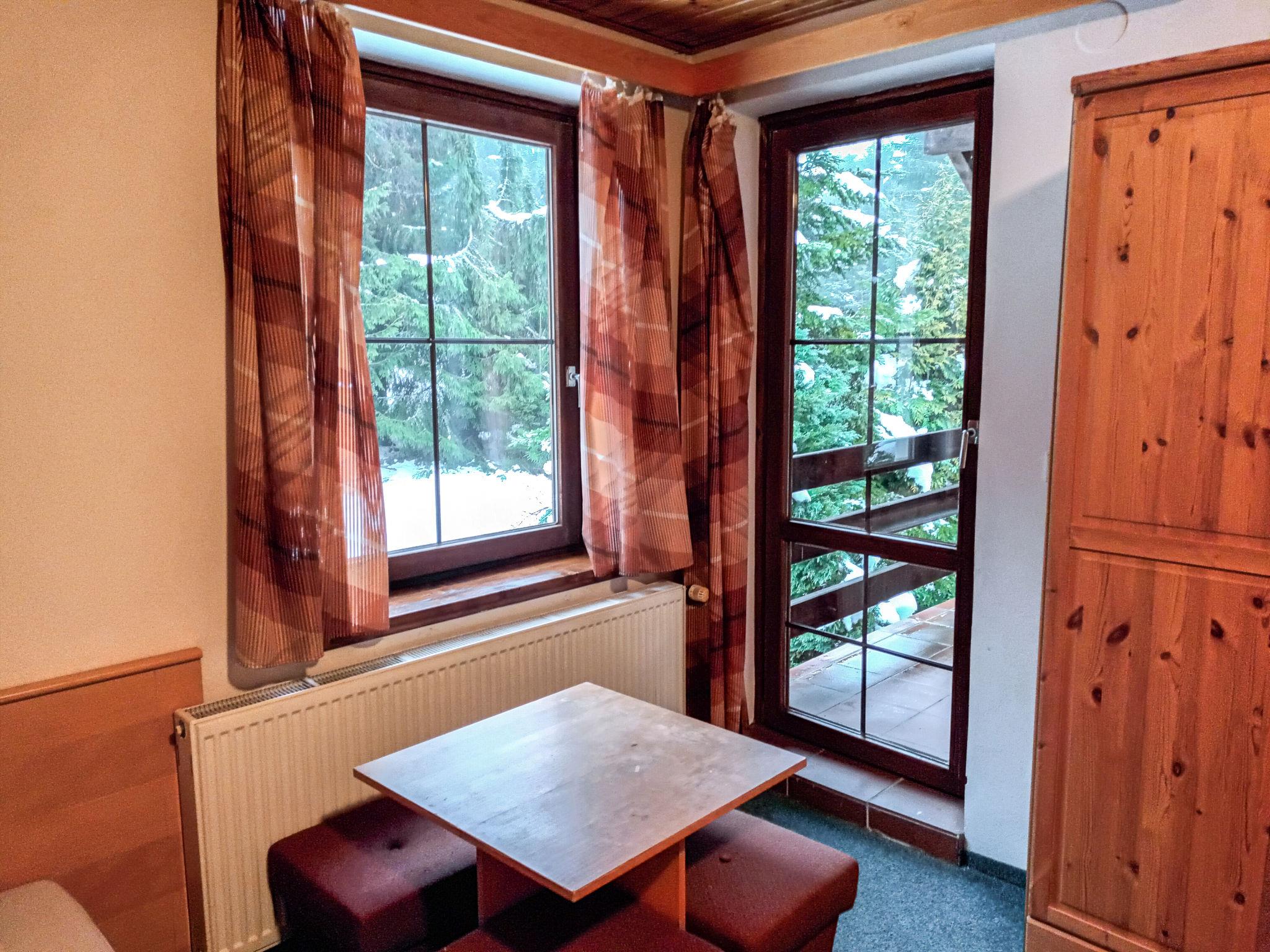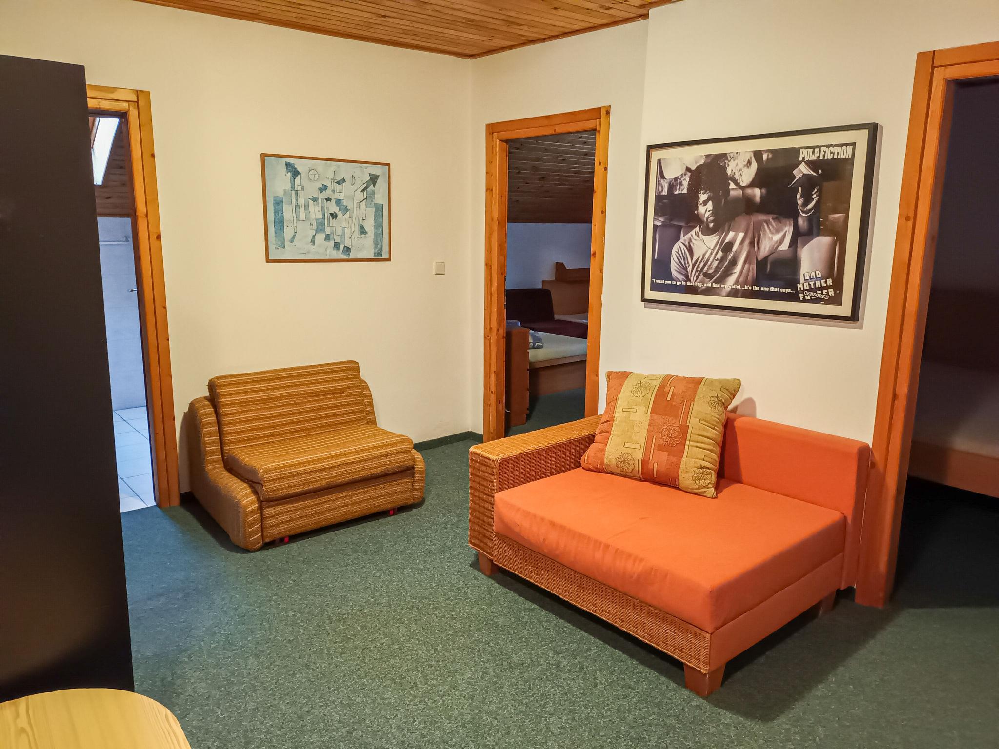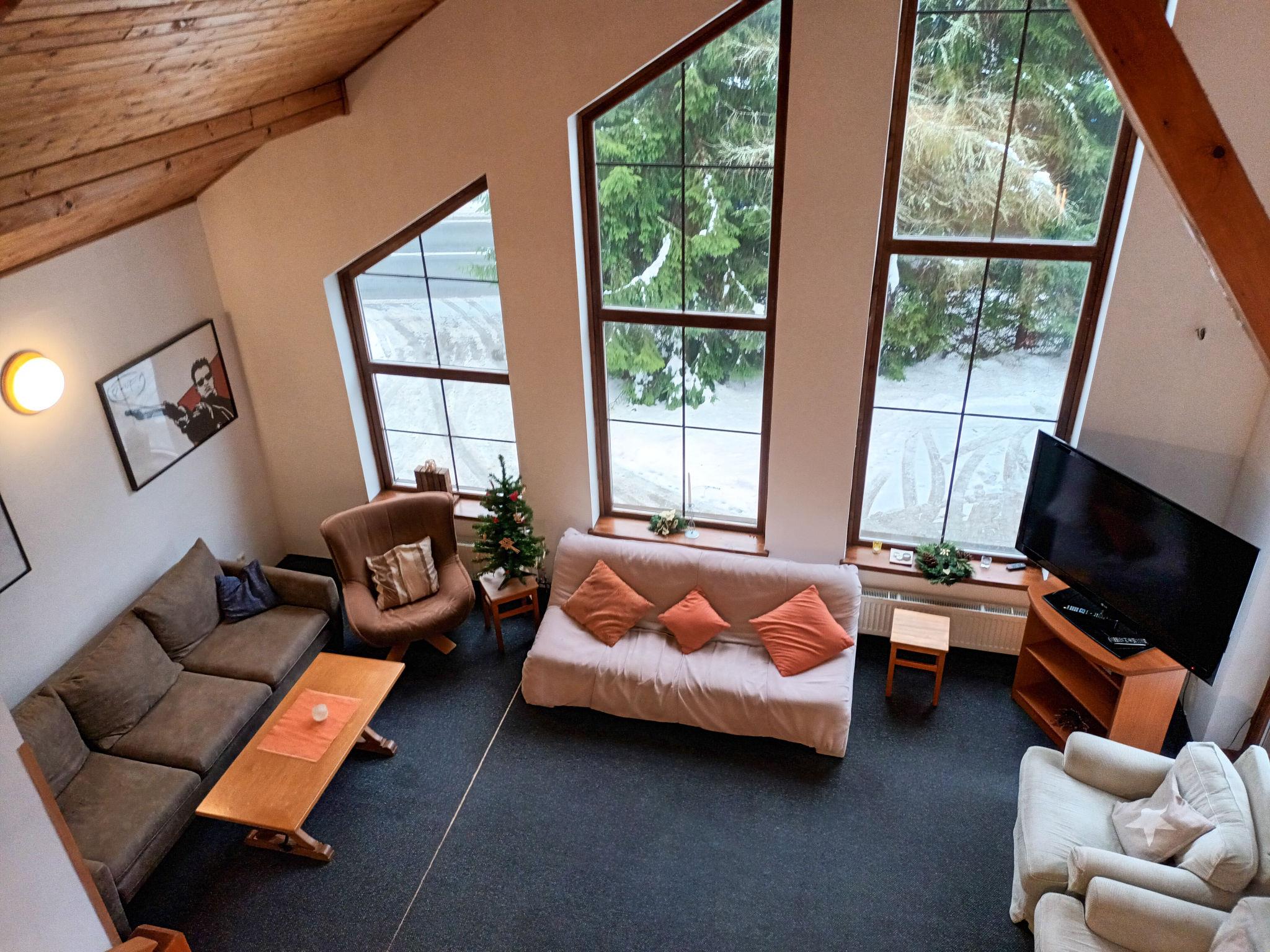 "Duplex Mountain Base", 4-room maisonette. Practical furnishings: open kitchen (4 ceramic glass hob hotplates, toaster, kettle, microwave, electric coffee machine) with dining table, gas heating. Exit to the balcony. Sep. WC. On the lower ground floor: living room with panoramic window with open-hearth fireplace and satellite TV. Exit to the balcony. Upper floor: 3 rooms, each room with 2 double beds. 1 room with 2 beds. Bath/WC, shower/WC. Facilities: Internet (WiFi, free). Suitable for families. Maximum 1 pet/ dog allowed.