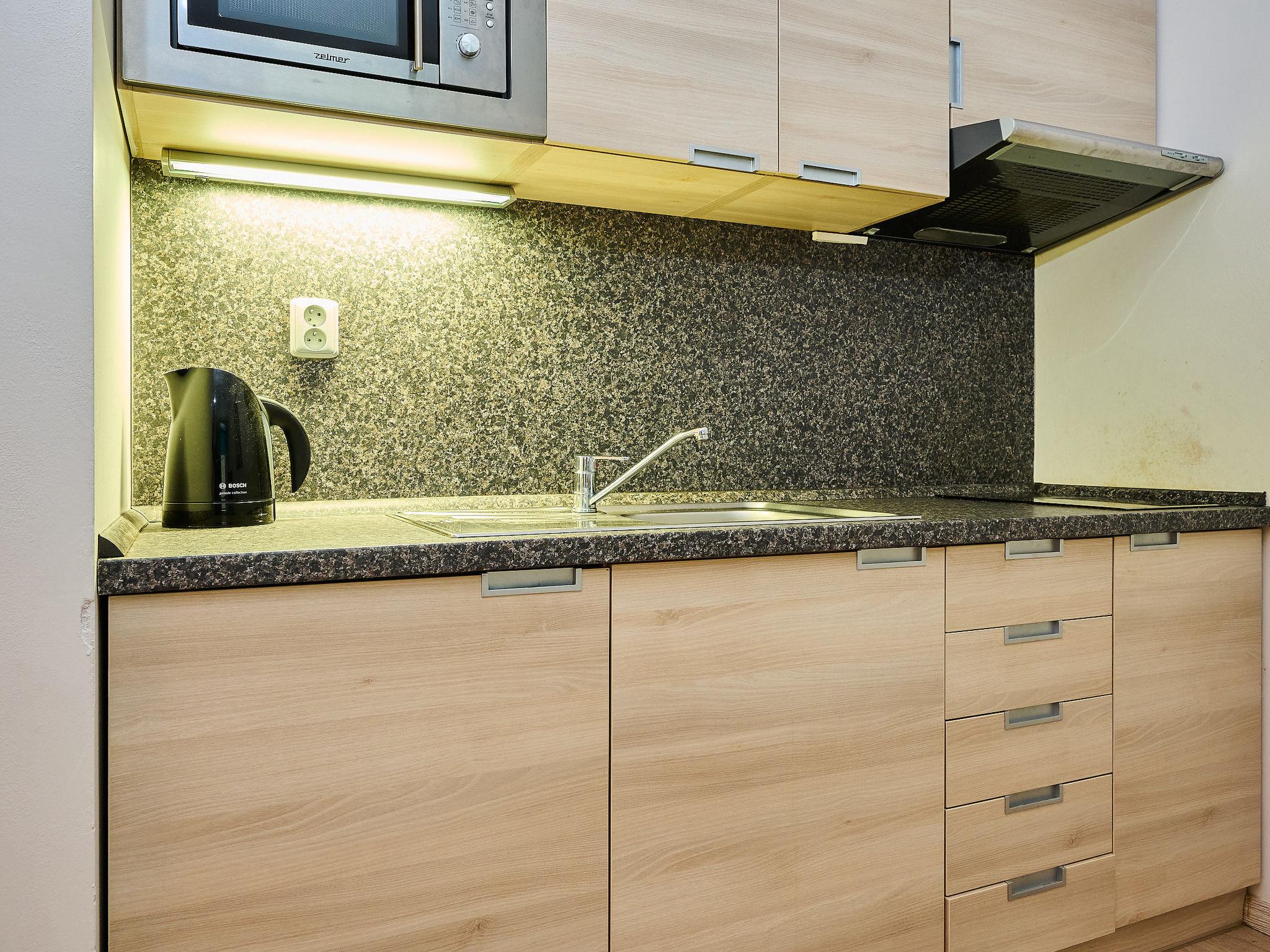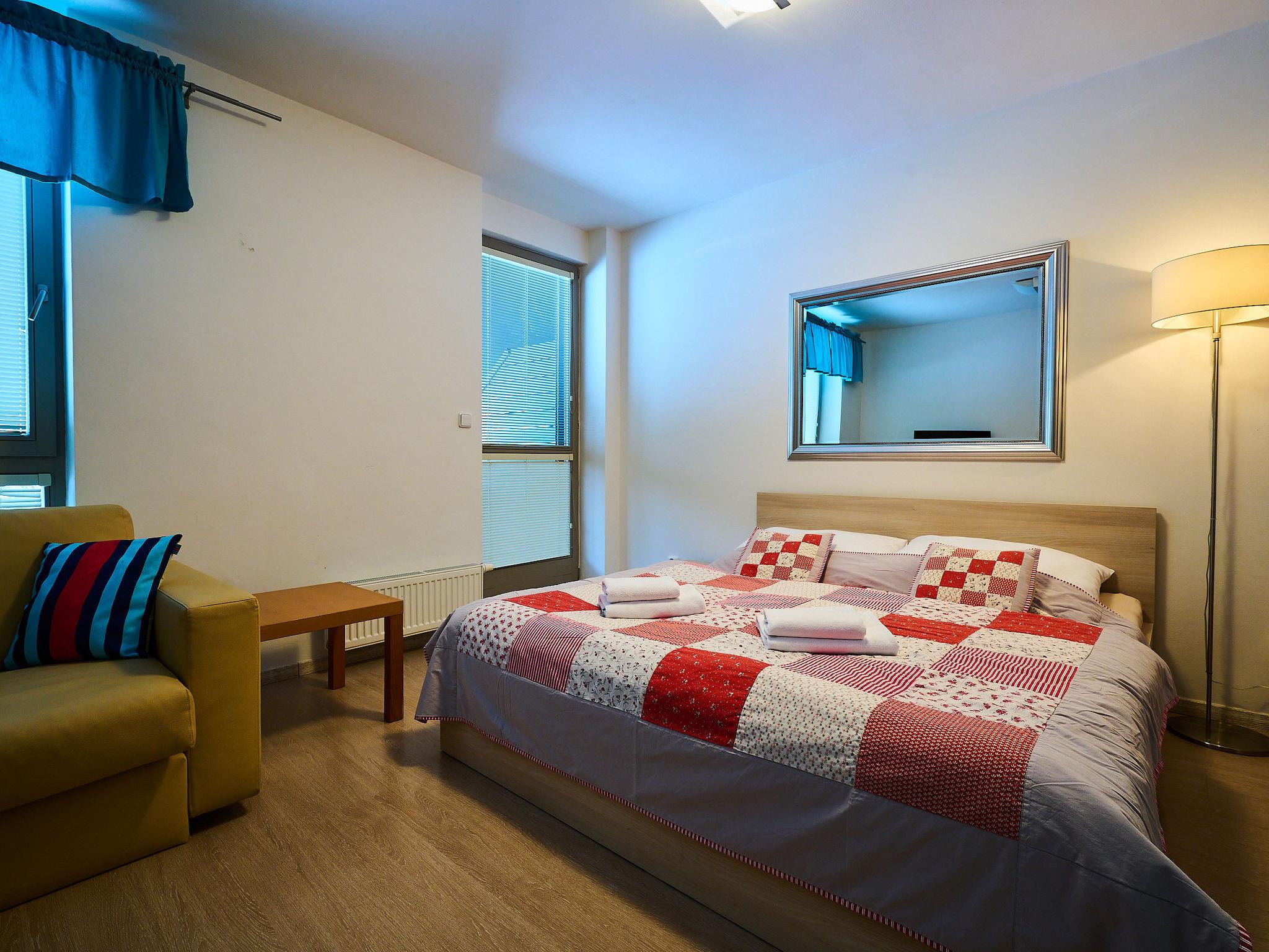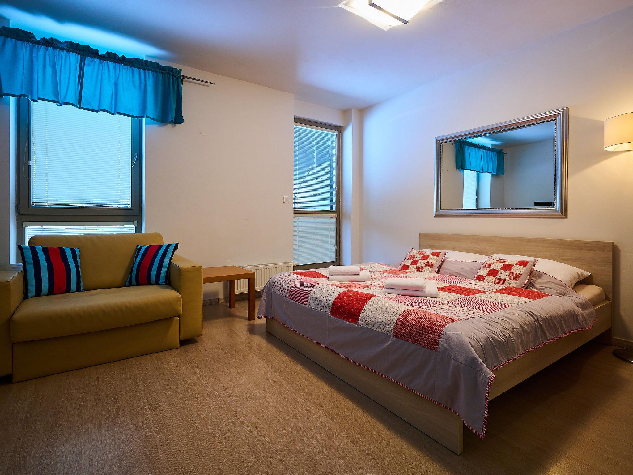 "Harrachov", 1-room studio 30 m2 on 1st floor. Bright, modern furnishings: living/sleeping room with 1 double bed, 1 sleeping facility, dining table and satellite TV. Exit to the balcony. Kitchenette (2 ceramic glass hob hotplates, toaster, kettle, microwave, electric coffee machine). Shower/WC. Heating. Balcony. Balcony furniture. Facilities: children's high chair, baby cot. Internet (WiFi, free). Please note: non-smokers only. No lift.
