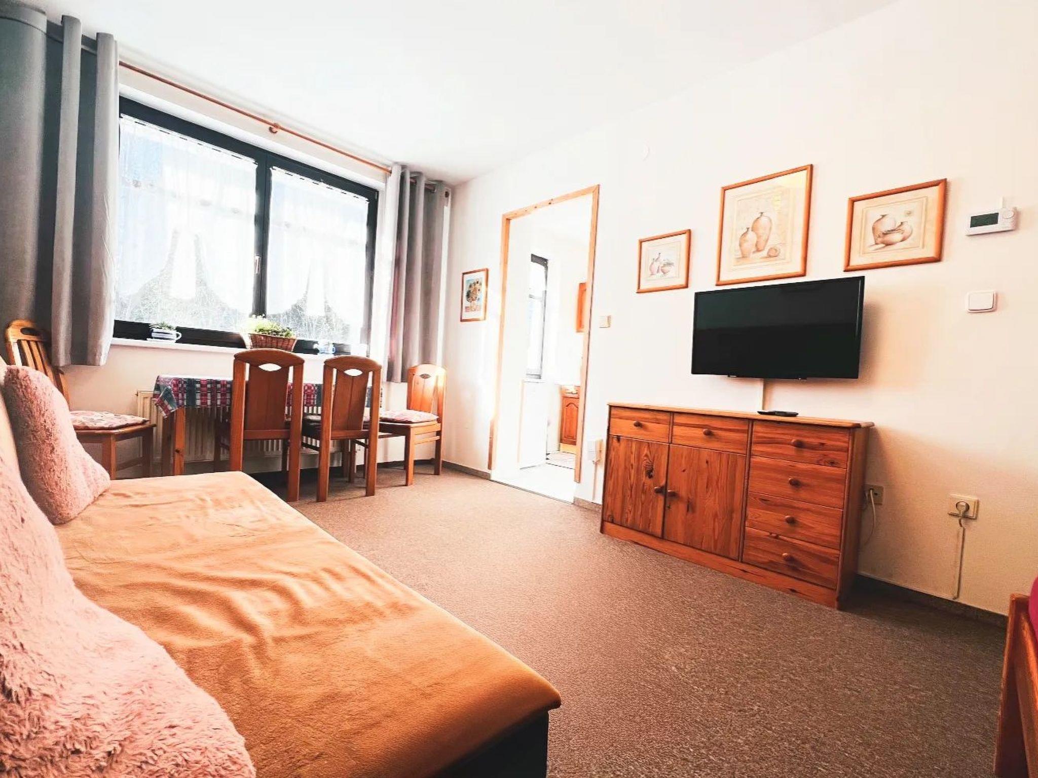 This bright studio apartment is nestled in the green coniferous forest landscape along the western tip of the imposing Czech Giant Mountains. Located in the quiet Klondaj district of the picturesque Harrachov ski resort, it offers ideal accommodation for a relaxing ski holiday. Hikers and nature lovers will also find their money's worth here outside of the winter months.