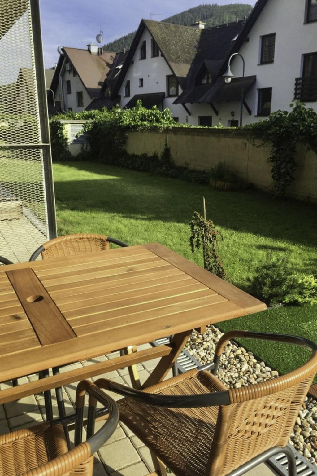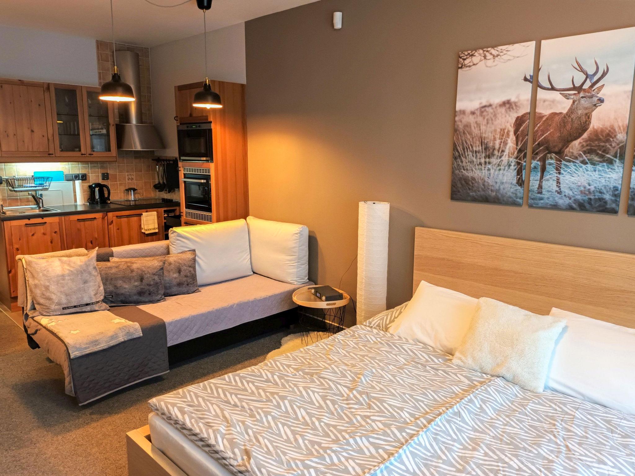 "Certovka U jelena", 1-room studio 40 m2, on the ground floor. Comfortable furnishings: living/sleeping room with 1 double bed and open-hearth fireplace (only for decoration), TV and gas heating. Exit to the terrace. Kitchenette (4 ceramic glass hob hotplates, toaster, kettle, microwave) with dining table. Bath/WC. Heating. Small garden 16 m2. Facilities: Internet (WiFi, free). Parking space n 48 (-2) (roofed). Suitable for families. Garage :-2.