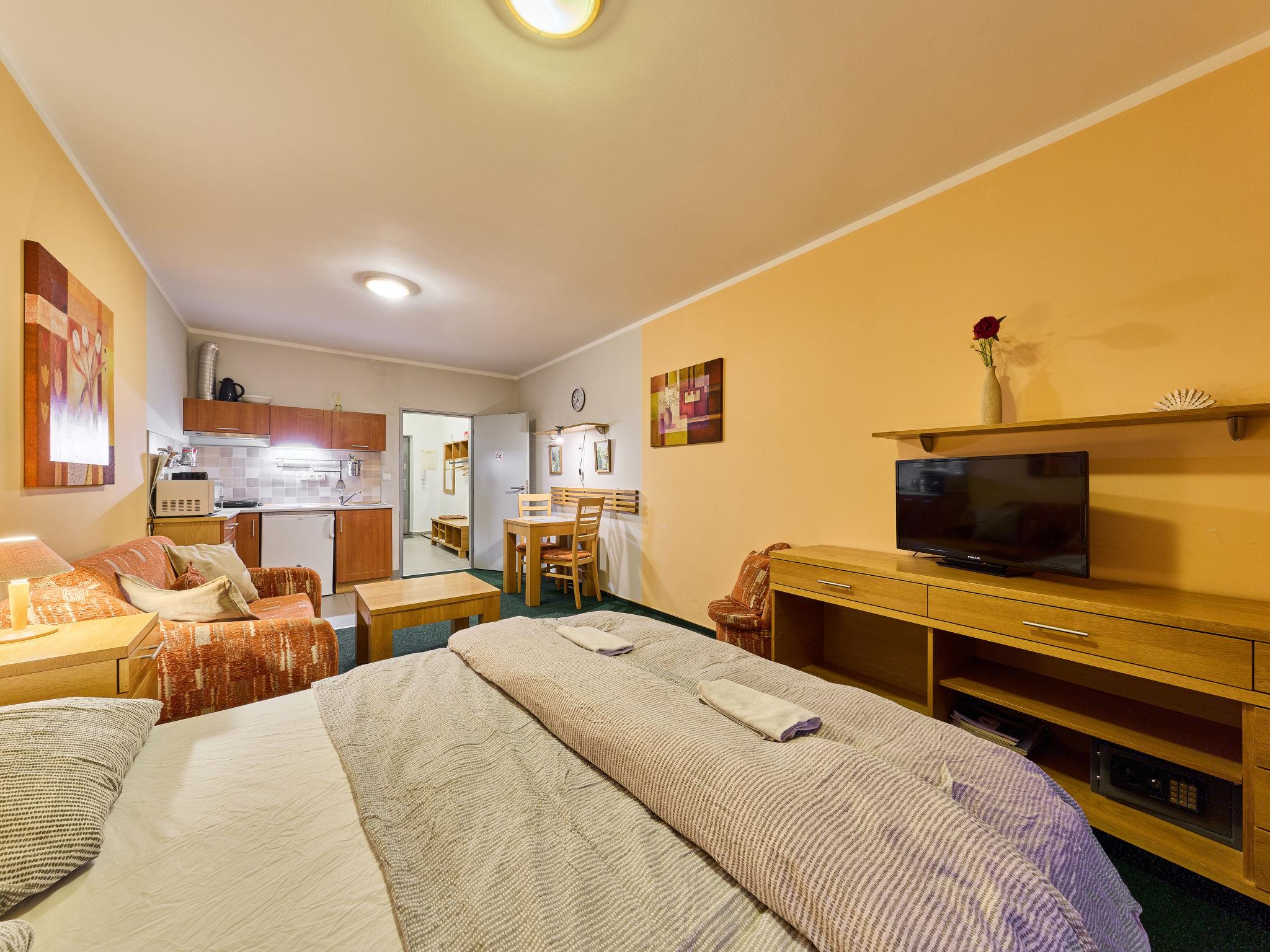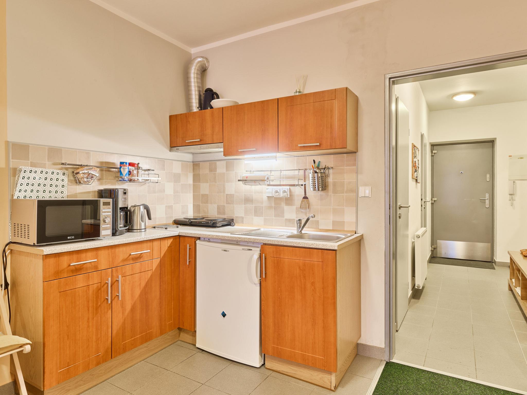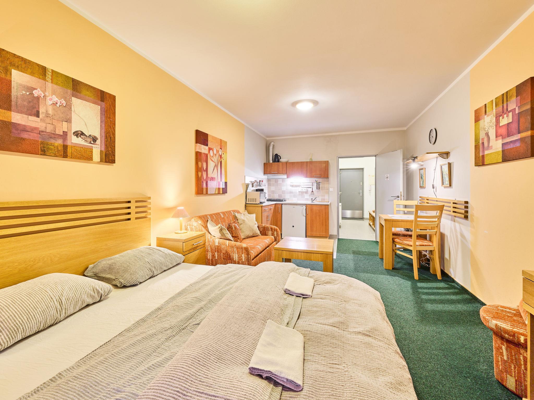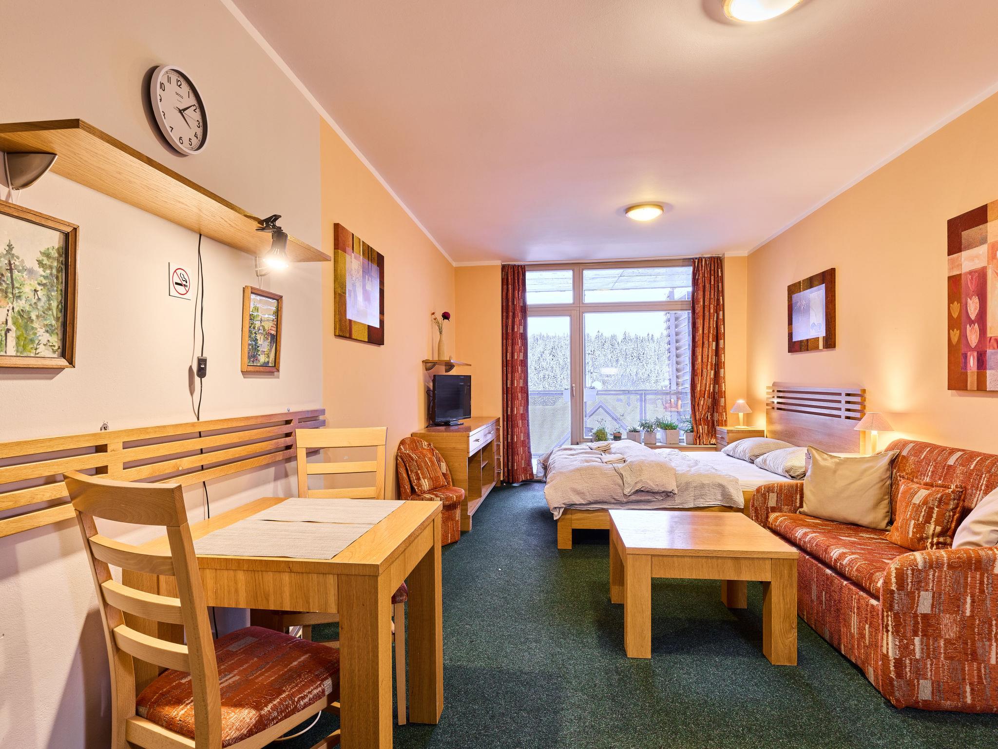 "Certovka 120", 1-room studio 45 m2 on 3rd floor. Practical and cosy furnishings: living/sleeping room with 1 double bed and 1 sleeping facility (1 x 120 cm, length 190 cm), TV. Exit to the balcony. Kitchenette (2 ceramic glass hob hotplates, toaster, kettle, microwave, electric coffee machine) with dining table. Bath/WC. Heating. Balcony 6 m2. Balcony furniture. Facilities: Internet (WiFi, free). Parking space n 46 (roofed). Please note: suitable for families. Non-smokers only.