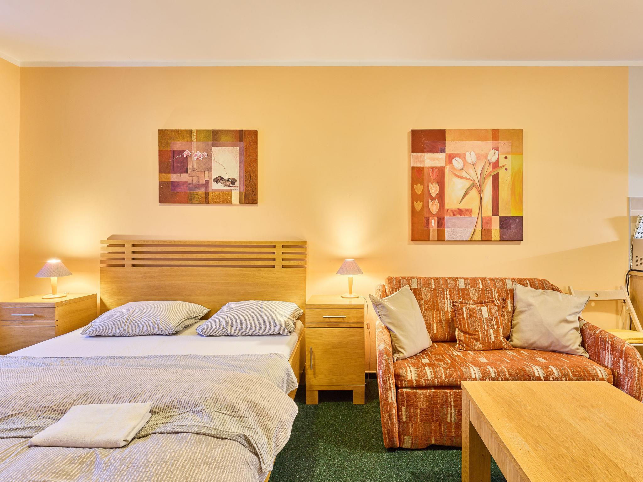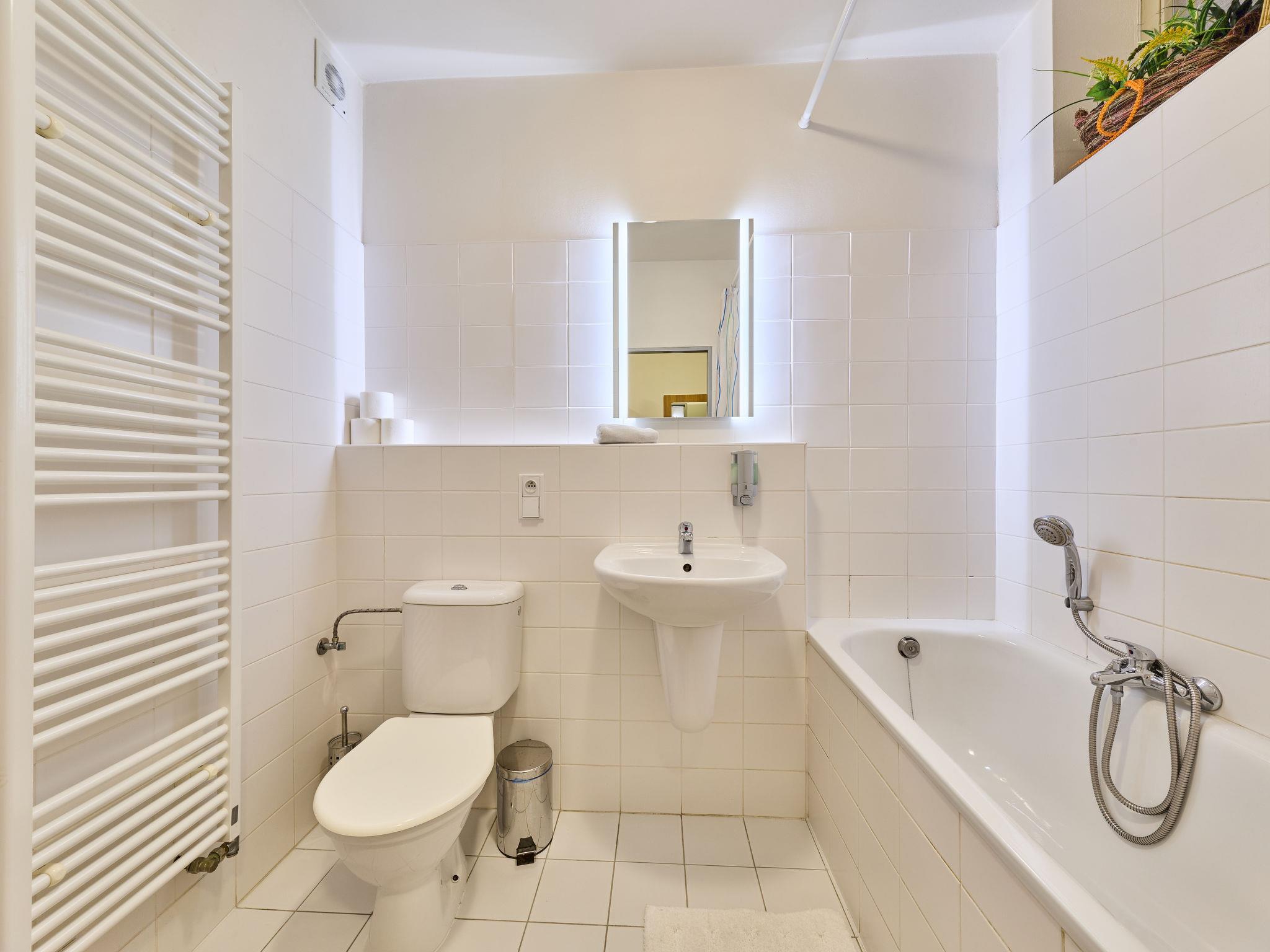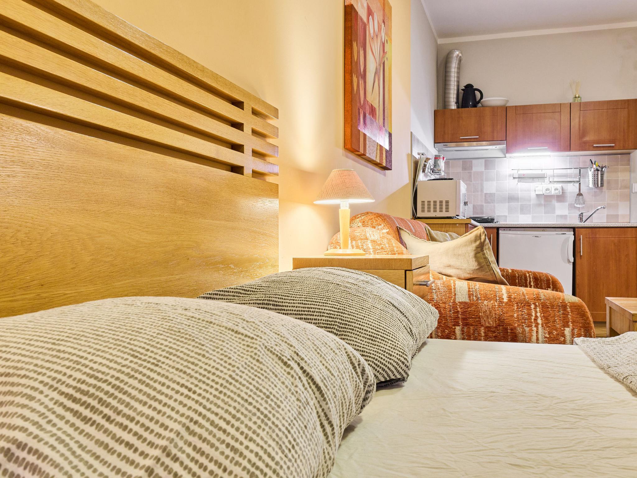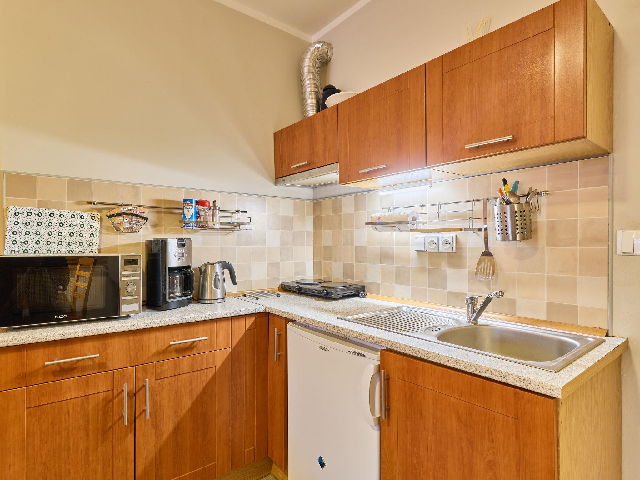 "Certovka 120", 1-room studio 45 m2 on 3rd floor. Practical and cosy furnishings: living/sleeping room with 1 double bed and 1 sleeping facility (1 x 120 cm, length 190 cm), TV. Exit to the balcony. Kitchenette (2 ceramic glass hob hotplates, toaster, kettle, microwave, electric coffee machine) with dining table. Bath/WC. Heating. Balcony 6 m2. Balcony furniture. Facilities: Internet (WiFi, free). Parking space n 46 (roofed). Please note: suitable for families. Non-smokers only.